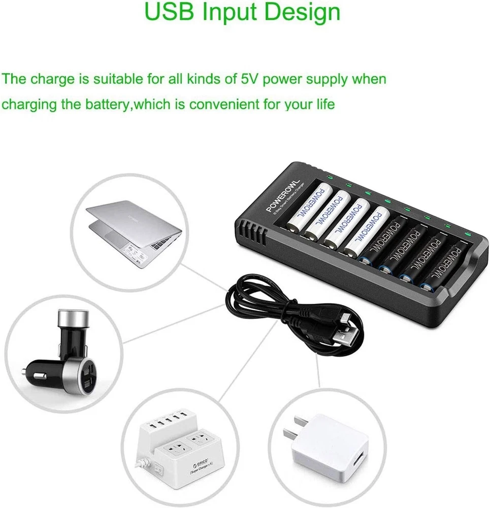 Rechargeable AA Batteries with Charger, 8 Pack of 2800mAh High Capacity Low Self Discharge Ni-MH Double A Batteries with Smart 8 Bay Battery Charger USB Fast Charging, Independent Slot High Capacity Ni-MH Batteries, Pack of 8 AA rechargeable batteries 2800mAh with a 8 bay smart charger smart charger passed US safety certification comes with chip control, when the battery is fully charged, it will automatically stop charging, and with LED indicator Independent Charging Slot: charge any number of AA AAA rechargeable batteries to make your charging easier. AA AAA batteries charger uses trickle charge to extend battery life and charge up to 99% double a batteries can be recharged up to 1200 times when fully or partially drained. Green and environmentally friendly, does not contain any harmful substances AA rechargeable batteries work well with a variety of electronics which can be used under , including high-power devices such as digital cameras, electric toothbrushes, and flashlights, controller battery pack