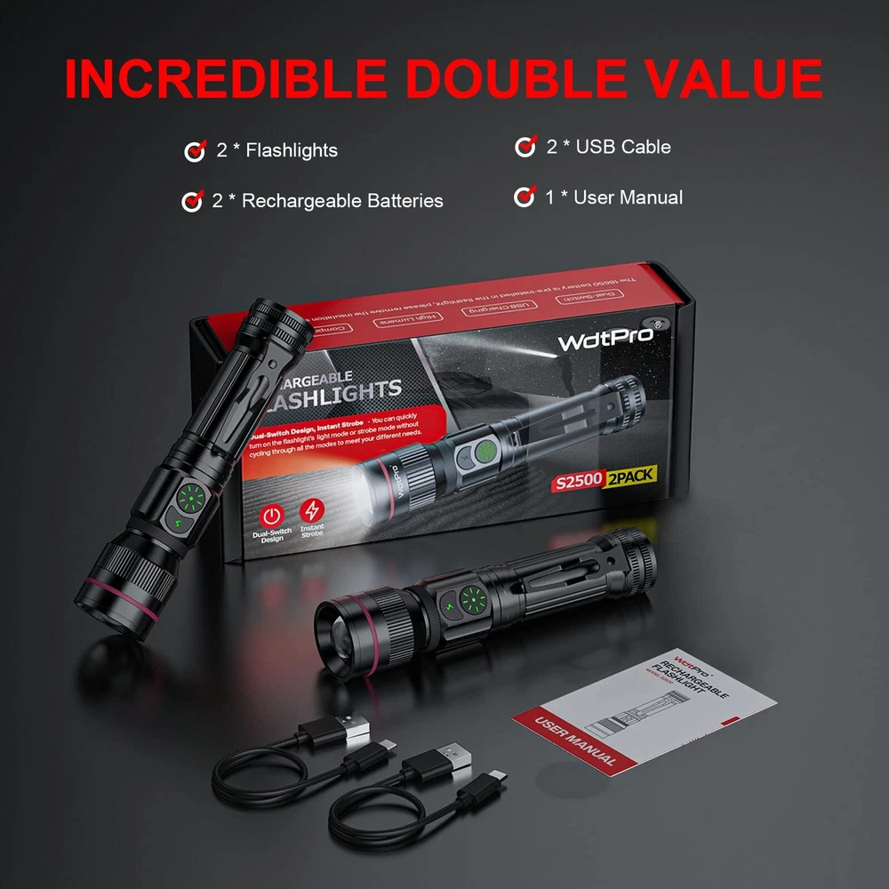 WdtPro Rechargeable Flashlight Dual Switch, 2000 Lumens Super Bright LED Flashlight, 5 Modes Zoomable, 12H Long-Lasting, IP65 Waterproof Tactical Flashlight with Clip for Home Emergency Camping Hiking Dual Switch Design & Power Indicator: These flashlights have 2 switches to control 5 light modes, much more convenient. One of the rechargeable flashlight switches is specially designed for emergencies.(Just one-click to strobe, keep you always safe in emergency.) This flashlight has an intelligent low battery warning function to remind you to charge it. When the power is less than 30%, the indicator will turn from green to red. Power indicator will also help you better master charging status Ultra Bright Rechargeable Flashlights: With the upgraded powerful LED chip, the high-lumen tactical flashlight delivers up to 2000 lumens(max). Its ultra-bright beam effortlessly illuminates an entire backyard. Easily zoomable from wide to narrow beam. Also with a pocket-clip for portable carry. It is small & compact enough to fit in your hands, pocket or backpack allowing for easy storage and quick access USB Rechargeable & Long-lasting: You don’t need to be busy replacing batteries constantly, very handy rechargeable flashlight and built-in 2000mAh Large-capacity rechargeable battery, the led flashlight only takes about 4 hours to fully recharge with overcharge protection. A single charge can provide up to 12 hours of continuous runtime in low mode and 3 hours in high mode Reliable & Waterproof: With a solid aluminum built and 3-layers of USB port waterproof protective cover design. Never worry about using the flash light in heavy rain, snow or other extreme weather. Perfect flashlight for use around the house, dog walking, or camping Great Value & 100% Satisfaction: A great gift idea for both men and women. Includes 2 x rechargeable flashlights, 2 x Rechargeable Battery, 2 x USB Cable,1 x User Manual. 90 days money back & 1 years replacement. Friendly customer service. Buy with confidence * Order Cancellation Policy ** You can return a product for up to 30 days from the date you purchased it. 1. The seller reserves the right to cancel the special case only due to eBay cancellation fee. 2. The decision of seller is the final. 3. The seller will respond to the cancellation request within 2 business days. Please wait for the result of cancellation. 4. In case the cancellation is not completed by some reasons, the buyer can follow the options below to get the refund. 4.1 The buyer can reject the item when it arrives. 4.2 The buyer can send the item back to the seller within 30 days If the buyer receives item (USA Shipment ONLY). The seller will provide the FREE return label to the buyer when the buyer opens " Return Item" case on eBay by using the reason as "Change my mind" ONLY. 5. When buyer has placed the order. The order will be processed and completed by automatic warehouse system within 5 minutes. In case that buyer sends the cancellation request after 5 minutes of placing the order, the request will be rejected. **Sending direct message to cancel the order is not allowed for every case.* Return Policy For the return case - If buyer would like to return the items for refund or replacement, please CONTACT SELLER to receive the free return label from seller. The refund or replacement will be processed with the tracking number of return label which is provided by seller only. The other ways of return which are not approved by seller will not be processed for the refund or replacement. SHIPPING Domestic Buyers - We ship within 3 business days of payment, usually sooner - We offer FREE shipping on all orders! - We only ship to the lower 48 states, no APO/FPO addresses or PO Boxes allowed - We have confidence in our products, but if you are not fully satisfied please contact us within 30 days of purchase and you will get full refund. International buyers – please note: Import duties, taxes, and charges aren't included in the item price or postage cost. These charges are the buyer's responsibility. - Please check with your country's customs office to determine what these additional costs will be prior to bidding or buying.
