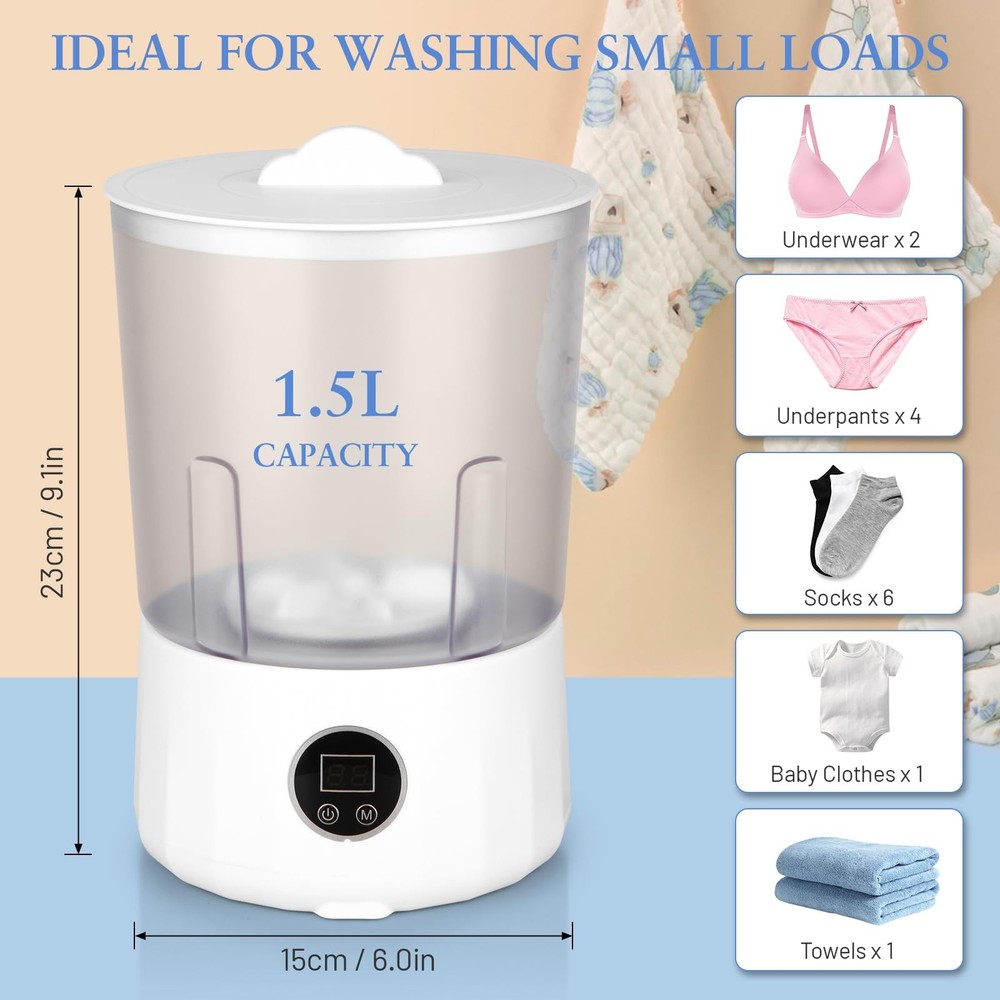 Underwear Washing Machine - Rechargeable Dual-Bucket Mini Washing Machine w/ 1.5L Isolated Tubs, Bionic Hand-Wash Tech for Travel, Camping, Dorm | 3 Modes, 3000mAh 【Dual-Bucket Hygiene System & Zero Cross-Contamination】 Revolutionize laundry hygiene with two completely isolated washing cups (1.5L each). Unlike traditional "sequential washing," our exclusive dual-bucket design ensures 100% separation for underwear, socks, and baby clothes – eliminating germ transfer. Perfect for health-conscious homes! 【Ultra-Portable & Wireless Freedom】 Weighing just 1.4lbs (0.64kg) and sized at 6.3×6.3×9.6 inches, this mini washer fits in backpacks, dorm closets, or RV cabinets. The 3000mAh rechargeable battery delivers 80+ mins runtime – no cords, no limits. Take your travel washing machine anywhere! 【Deep Cleaning with Bionic Hand-Scrub Tech】 Patented 360° vortex mimics hand-washing motions (38% gentler than traditional machines). Choose from 3 modes: Quick Clean (5min), Standard (10min), or Deep Stain Removal (15min). Effortlessly removes sweat, oils, and odors from delicates. 【Leak-Proof Hassle-Free Design】 Ditch complicated screw-locks or needing to tighten it very hard by hand with all your might! Our upgraded sealing system works instantly just by easily rotary tightening. Made of food-grade silicone and PP materials, it’s safe for underwear, socks, and baby clothes – just press start and relax. 【Space-Saving Powerhouse for On-The-Go】 Washes 1 bra / 2 briefs / 4 pairs of socks per load. Recharges via USB-C in 2 hours. Ideal for apartments, dorms, camping, and travel. Last but not least, you will get a No-worry 12-month 100% brand new replacement exchange or fully refund for any product quality issues to our portable mini washing machine.