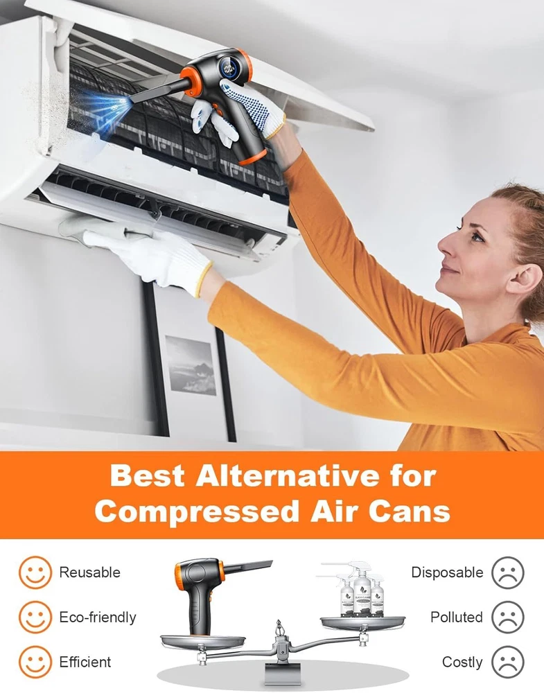 Product Description Compressed Air Duster for PC, Rechargeable Electric Air Duster with LED Light & Power Display, 3 Speeds Max 90000RPM Cordless Air Blower Duster with 5 Switchable Nozzles for Keyboard Car [Adjustable 3 Speed Modes] The compressed air duster is equipped with an upgraded 90,000 RPM high-power motor, providing up to 1.76 ounces of airflow while maintaining noise levels below 90 decibels. With a quick 3-second startup, easily switch between three airflow modes (50,000 RPM, 70,000 RPM, 90,000 RPM) for efficient cleaning of various devices, ensuring dust has nowhere to hide.ensure compatibility with your TV. [Multi-functional Application] With five different nozzle attachments, our air duster is suitable for a wide range of cleaning tasks. Whether it's cleaning dust off a keyboard, tidying up a computer tower, cleaning car seat crevices, or inflating balloons, swim rings, air mattresses, or yoga balls, our multi-functional cleaning tool is up to the task. [Personalized LED Design] The independent LED light button enhances convenience and energy efficiency. When activated, it illuminates hard-to-reach areas, making it easy to remove dust and debris from dark corners. Additionally, the electric air duster is equipped with a large screen for visual appeal and easy monitoring of battery levels. [Excellent Battery Performance] Our air blower includes a USB-C quick charging cable, fully charging within 3-4.5 hours, easily powered by a power adapter, laptop, power bank, or car charger. The upgraded 6000mAh battery offers up to 35 minutes of continuous cleaning power (1st gear: 35 minutes, 2nd gear: 25 minutes, 3rd gear: 15 minutes). [Lightweight & Comfortable] The compressed air for computers measures 6.89 x 4.25 inches and weighs only 550 grams, making it compact, lightweight, and easy to carry. The ergonomic handle provides a comfortable grip. Whether at home, in the office, or on the go, it's an excellent cleaning assistant. About Us We are a reputable seller with many years of experience selling on eBay. Our goal is to provide high-quality products and excellent customer service. Payment 1.We accept PayPal only. 2.All major credit cards are accepted through secure payment processor PayPal. 3.Payment must be received within 7 business days of auction closing. 4.We ship to your eBay or Paypal address. Please make sure your eBay and Paypal address is correct before you pay. Feedback will be left automatically after we receive your feedback. Please contact us before leaving a Negative feedback or Neutral feedback. We would try our best to help you solving any problem. Shipping Items will be shipped within 1-3 business days when we received payment. (Orders are not processed on weekends & holidays) Tracking information will be sent once item is shipped. Delivery time depends on destination and other factors Item is shipped to ebay address. Leaving correct address can minimize delay. For international shipping and shipping to Guam, Hawaii and Alaska, Please contact us before placing the order. International buyers please note: Import duties, taxes and charges are not included in the item price or shipping charges. These charges are buyer’s responsibility. We will try our best to reduce the risk of the custom duties. Local pick-up is unavailable at the moment. Returns For any issues with Defects, Return, Item Exchange request, please contact us first and send us a message first before opening any type of case or request. We devote ourselves making EVERY CUSTOMER in 100% Satisfactory and resolve any problem. We highly value and appreciate your business. Thank you. No returns will be accepted without an RMA number. Please contact us for the RMA number. Return is acceptable within 30 days of delivery. Return for replacement or money back is optional. Returned items must be in the brand new, unaltered and resalable condition. Seller is not responsible for any labor cost, expense in a dealer store, or damage due to wrong installation. Contact Us We reply any email messages within 1 business / working days(off-duty at weekend). If you do not get a response from us, then please check your junk or spam mailbox. Our Business hours: Mon-Fri 9:00-18:00, UTC/GMT +8 hours. Please contact us either by clicking "contact seller" in the "purchase history" section or simply click "ask a question" at the bottom of this page. If you are unsatisfied with our item or service, please contact us before leaving any feedback. We are committed to resolve all issues in a friendly and satisfactory manner. powered by
