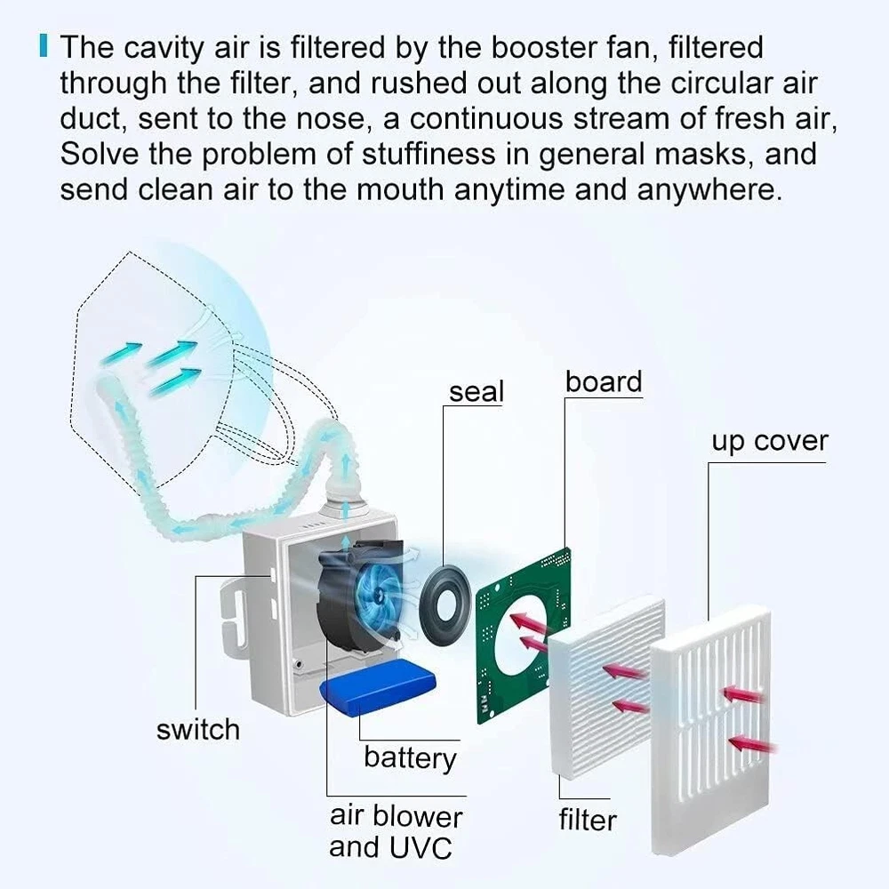Rechargeable Electrical Air Purifying, Reusable Portable Air Purifier with HEPA Filter for Sleeping Outdoor Sports Housework Supplied fresh air respirator system is equipped with portable power sources mainly overcome the problems of big air intaking resistance, difficulties in breathing, and so on. Unique electronic ventilation design system, to keep the fresh air flowing through your nose and mouth, suitable for long time use. With filter function, filter effect with Japan H13 high quality material filters. You can connect the electric air filter to anywhere you want,and then optionally tie to arms, neck, waist, and head. Continuous 500hours working by each filter element, adjustable wind speed, can be used for 8-10 hours with full charge, larger battery capacity, longer working time.