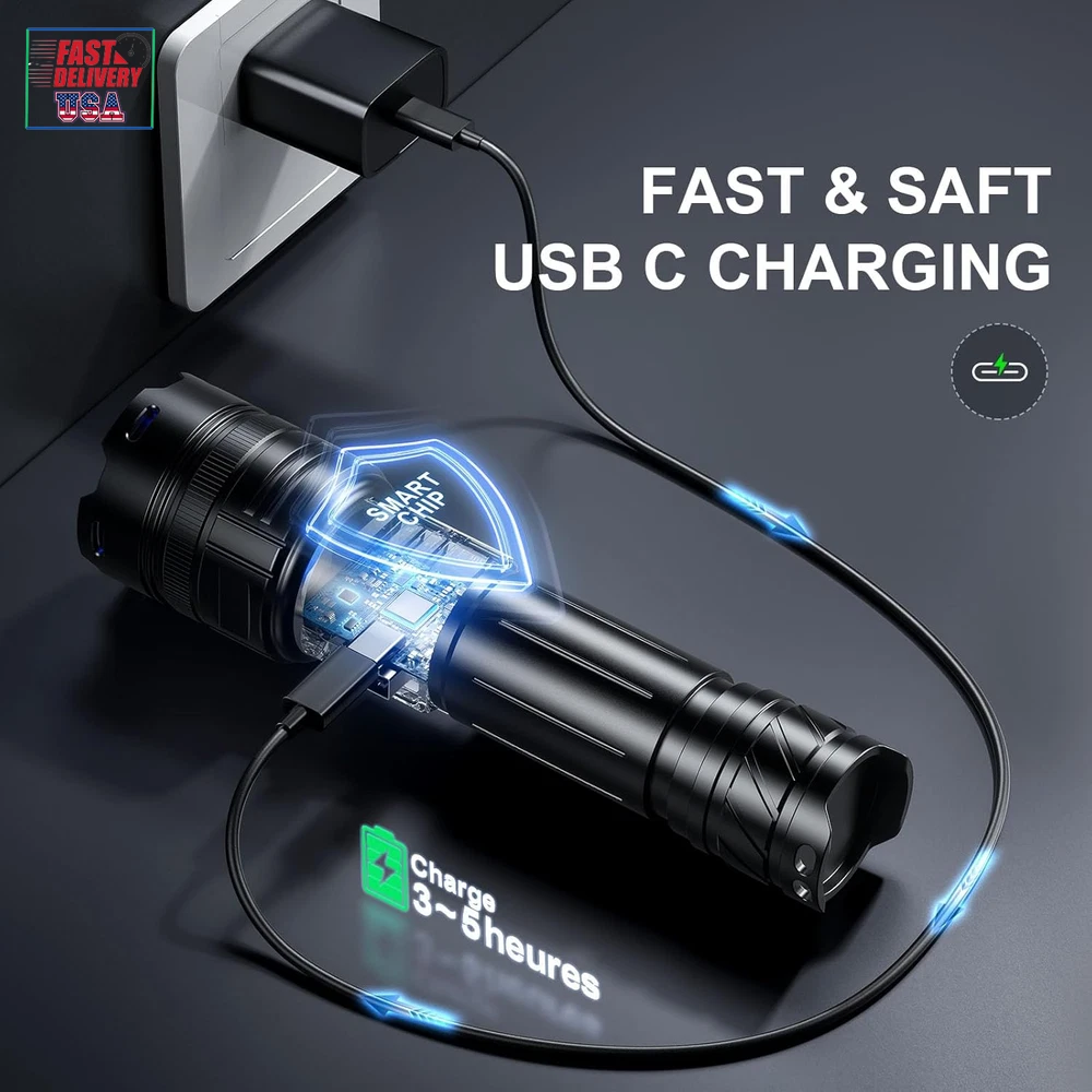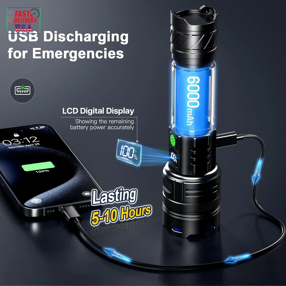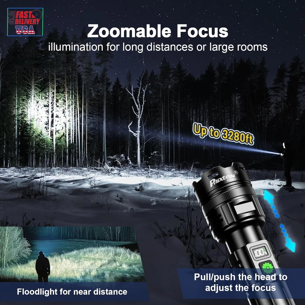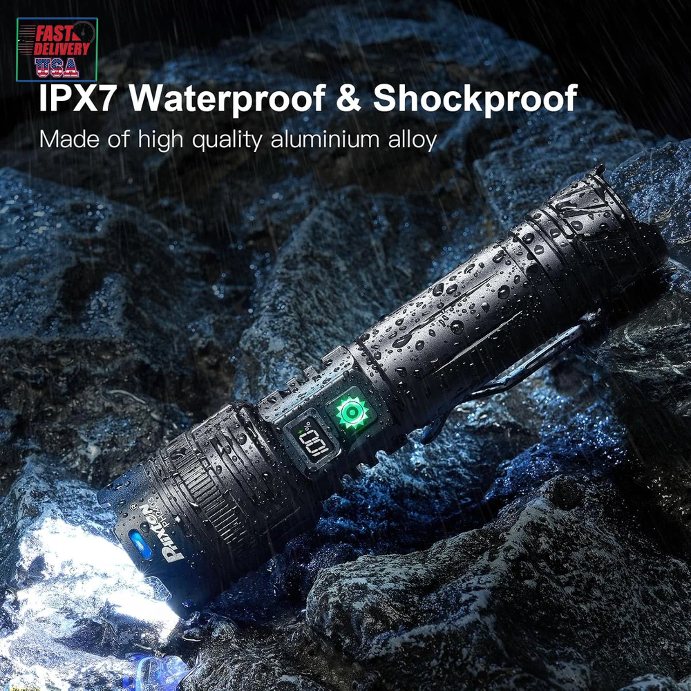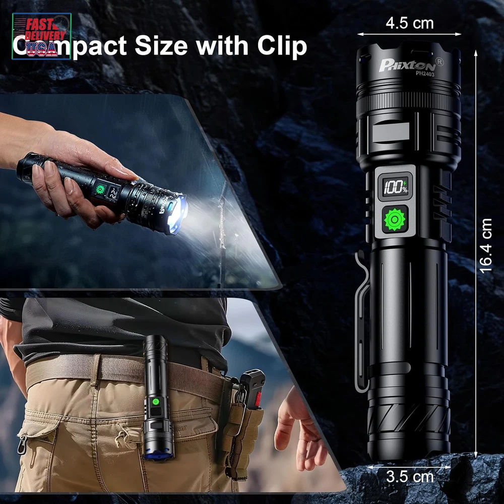 Store New Arrivals Add to Favorite View Feedback Contact Rechargeable Flashlights 1000000 High Lumens Single One Mode Super Bright, High Powered LED Flashlight USB C, High Beam 3280 Ft Long Lasting Powerful Heavy Duty Strong Flash Light for Security Hiking Description Item model number PH2403 Light Source Type LED Style Modern Power Source USB C Charging & Battery Powered Battery Cell Composition Lithium Ion Light Path Distance 3280 Feet Country of Origin China Warranty Type Limited Batteries Included? No Specification Met UL Battery Description Lithium-Ion Batteries Required? No Product Dimensions 1.77"D x 1.38"W x 6.45"H Material Aluminum Included Components 1x USB C to USB C Cable, 3x Alkaline Batteries, 1x PH2403 High Power Flashlight(Rechargeable battery included), 1x USB C Cable Item Package Quantity 1 White Brightness 1000000 Lumens Brightness 1000000 Lumen Water Resistance Level Water Resistant Item Weight 1.08 pounds Special Features Single One Mode -No need to adjust the brightness, Adjustable Focus - Wide to narrow beam, LCD Display - Showing the remaining power accurately, Long Range - Up to 3280 feet, High Power - Super high brightness 1000000 Lumens Special Feature function(f) {var _np=(window.P._namespace("DetailPageProductOverviewTemplatesJava"));if(_np.guardFatal){_np.guardFatal(f)(_np);}else{f(_np);}}(function(P) { P.when('A').execute(function(A){ A.on('a:truncate:po-attribute-truncate-0:updated', function(data) { var isTruncated = !data.truncateInstance.getIfTextFits(); var seeMoreElement = document.getElementById('po-attribute-see-more-id-0'); if(seeMoreElement) { seeMoreElement.style.display = isTruncated ? '' : 'none'; } }) }); })); Single One Mode -No need to adjust the brightness, Adjustable Focus - Wide to narrow beam, LCD Display - Showing the remaining power accurately, Long Range - Up to 3280 feet, High Power - Super high brightness 1000000 Lumens See more Bulb Base Flanged Color Black Part Number PH2403 Wattage 30 Watt Hours Recommended Uses For Product camping, hiking, night walking, night work, power failure, security [ ULTRA LONG RANGE - 3280 FT & ADJUSTABLE FOCUS ] The PHIXTON PH2403 rechargeable flashlights high lumens is made of improved PH-L330 30W LED which has the features of high concentration and ultra long range, you can adjust the focus from narrow to wide. It is a high concentration circle beam, it can be used as a spotlight to illuminate on objects up to 3280 feet away even if it is fog day or rainy day. It is quite ideal for camping, hiking, night walking or other emergency situations. [ SINGLE ONE MODE - HIGH BRIGHTNESS ] The PH2403 LED flashlight rechargeable USB C is single one mode, only one high mode, single click to turn on or turn off, NO NEED to take time to adjust the brightness any more. The brightness can be up to 1000000 Lumens, it can easily illuminate a whole room and backyard of 500 square meters. It is suitable for night work or power failure. [ MULTIFUNCTIONAL 2-IN-1 USB INPUT & OUT ] The super bright LED flashlight long range is built-in 2 USB interfaces, one is USB C input for charging, the other is USB output for emergencies. It supports various of USB devices such as smartphone, earphone, computer etc. It is convenient to get charged or discharged in indoor or outdoor activities. [LONG LASTING & IMPROVED LCD DIGITAL POWER DISPLAY] The PH2403 high powered flashlight long beam is equipped with 1pcs 6000mAh rechargeable battery, so it can provide up to 10 hours of powerful and non-diminishing brightness. Both the battery and flashlight are built-in a smart chip that has the overcharging protection to ensure safety. With compact handheld size, it looks quite cool and smart. The LCD power display shows remaining power exactly, you will get known when to charge it in advance. [PRACTICALLY INDESTRUCTIBLE & IPX7 WATERPROOF] The body of the high intensity flashlight long distance is made of super hard aviation-grade aluminum alloy, impact resistance, wear-resistant and drop-resistant. It is strong enough to withstand a 10 feet accident drop and even ran over by a truck, it still works! IPX7 waterproof flashlight long lasting has a built-in high tenacity seal rubber waterproof ring, so there is no any problem to be used in any bad weather, such as rain or snow day. [PACKING LIST & EXCELLENT CUSTOMER SERVICE] You will get 1x PH2403 flashlight, 1x 6000mAh rechargeable battery,1x USB C cable, 1x gift box. We are providing high quality products and the best customer service as our aims. You will be pleasantly surprised by the brightness, quality, longevity and performance of the most powerful flashlight. If you have any questions, please feel free to contact us. We will be happy to answer your questions. Product Description The video showcases the product in use. The video guides you through product setup. The video compares multiple products. The video shows the product being unpacked. Do I need to adjust the lighting mode NO need,the rechargeable flashlight high lumens is single mode, only one high mode, no need to adjust the lighting modes Is there any battery included Yes,the PHIXTON PH2403 LED flashlight rechargeable contains 1pcs 6000mAh rechargeable battery, it cay be cycled charging and discharging for more than 500 times, there is no need to replace another battery How long would the PHIXTON PH2403 super bright flashlight last? Once full charged,the PHIXTON high powered flashlight would last about 5-10 hours Is it a circle beam or a square beam The PH2403 powerful flashlight for camping is a high concentration circle beam, the illuminating range could be up to 3280ft What's the material of the heavy duty flashlight The PH2403 strong flashlight is made of super hard aviation-grade aluminum alloy, it is waterproof and shockproof, not like others which are plastic ABOUT US We offer the best prices around on high quality products. Our E-store includes media such as books, movies, music and games while offering electronics, toys, sp