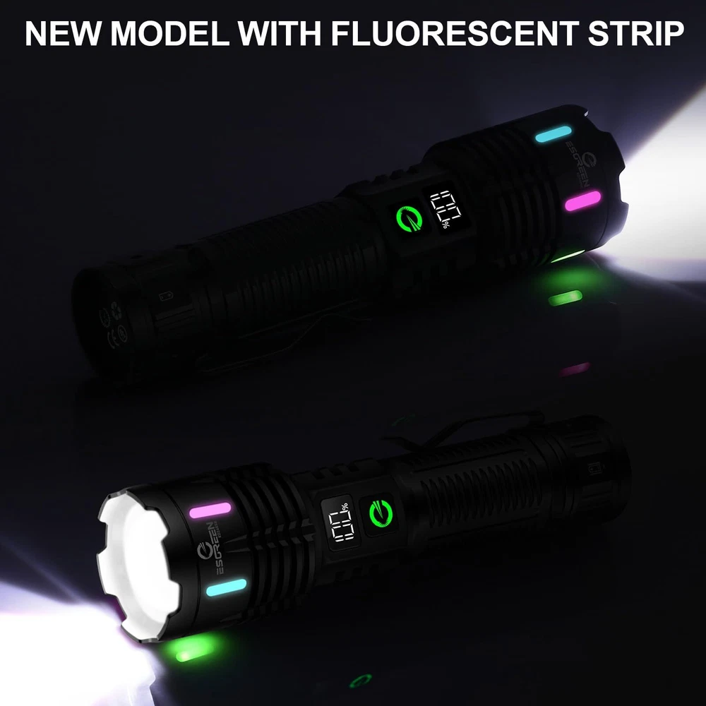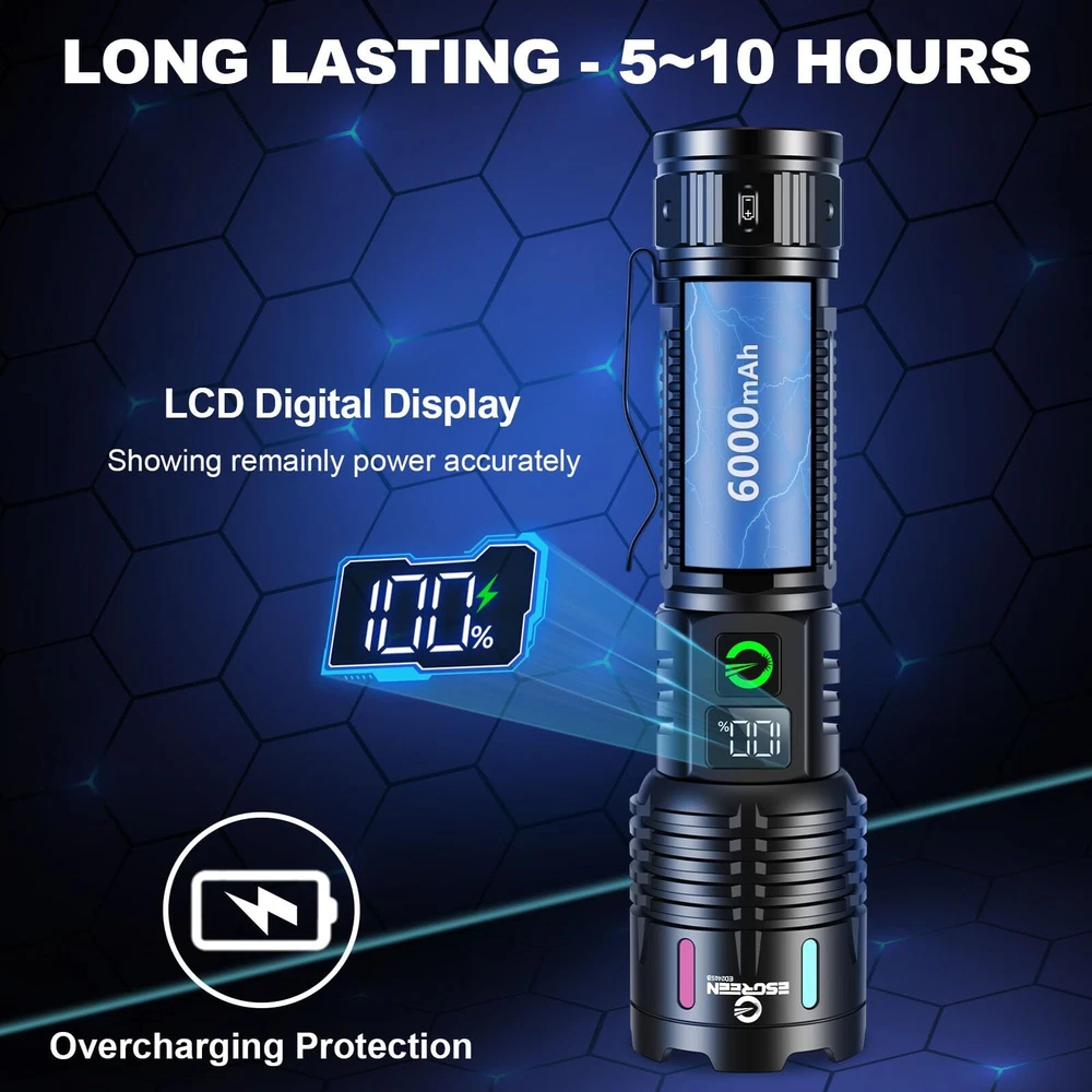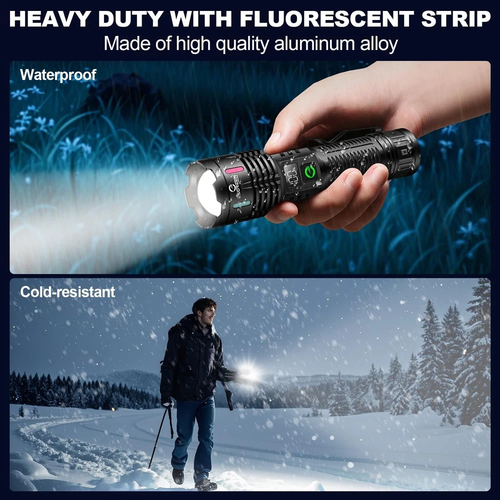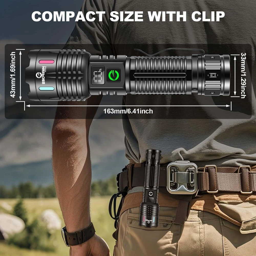 [ ULTRA LONG RANGE - 3280 FT & ADJUSTABLE FOCUS ] The ED2405B rechargeable flashlights high lumens is made of improved PH-L330 30W LED which has the features of high concentration and ultra long range, you can adjust the focus from narrow to wide. It is a high concentration circle beam, it can be used as a spotlight to illuminate on objects up to 3280 feet away even if it is fog day or rainy day. It is quite ideal for camping, hiking, night walking or other emergency situations. [ SINGLE 2 MODES HIGH/LOW - BRIGHTNESS ADJUSTABLE ] The LED flashlight rechargeable USB C is single modes, only high or low mode without annoying strobe or SOS. It is easy to adjust the correct brightness you need according your situation. The brightness can be up to 1000000 Lumens, it can easily illuminate a whole room and backyard of 500 square meters. It is suitable for night work or power failure. [ MULTIFUNCTIONAL 2-IN-1 USB C CHARGING & DISCHARGING ] The super bright LED flashlight long range is built-in 2 USB interfaces, one is USB C input for charging, the other is USB output for discharging such as it can charge your phone for emergencies. It supports various of USB devices such as smartphone, earphone, computer etc. It is convenient to get charged or discharged in indoor or outdoor activities as the USB C interface is universal that can be replaced. [LONG LASTING 10H & UPGRADED LCD DIGITAL POWER DISPLAY] The high powered flashlight long beam is equipped with 1pcs 6000mAh rechargeable battery, so it can provide up to 10 hours of powerful and non-diminishing brightness. Both the battery and flashlight are built-in a smart chip that has the overcharging protection to ensure safety. The LCD power display shows remaining power exactly, you will get known when to charge it in advance. [ STYLISH LOOK WITH FLUORESCENT STRIP & COMPACT SIZE WITH CLIP ] Different with others, the powerful flashlight rechargeable is inset 6pcs of fluorescent strip on the head, it can glow with different colors in dark, with compact handheld size, it looks beautiful and quite cool. It is only about 6.41 inch long, lightweight and portable to carry and storage in your pocket backpack or drawer at home. With a clip, it is easy to put on your waist belt. [PRACTICALLY INDESTRUCTIBLE & IPX7 WATERPROOF] The body of the high intensity flashlight long distance is made of super hard aviation-grade aluminum alloy, impact resistance, wear-resistant and drop-resistant. It is strong enough to withstand a 10 feet accident drop and even ran over by a truck, it still works! IPX7 waterproof flashlight long lasting has a built-in high tenacity seal rubber waterproof ring, so there is no any problem to be used in any bad weather, such as rain or snow day. [PACKING LIST & EXCELLENT CUSTOMER SERVICE] You will get 1x ED2405B flashlight (6000mAh rechargeable battery included), 3x AAA Alkaline batteries, 1x USB C to USB A cable, 1x USB C to USB C cable. We are providing high quality products and the best customer service as our aims. You will be pleasantly surprised by the brightness, quality, longevity and performance of the most powerful flashlight. If you have any questions, please feel free to contact us. We will be happy to answer your questions.