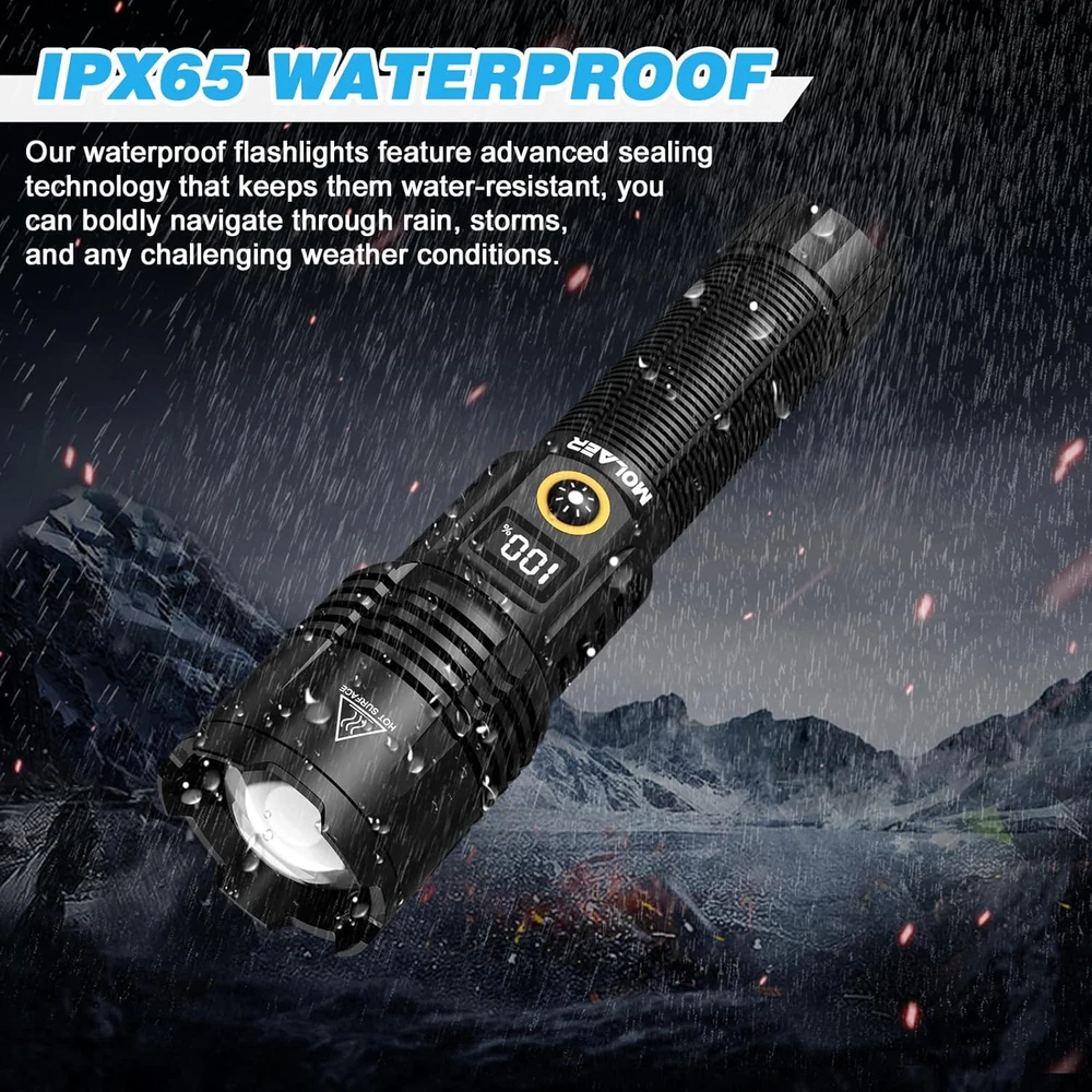 【SUPER BRIGHT HIGH LUMENS FLASHLIGHT】 The newly rechargeable flashlight is equipped with a upgraded chip, offering a 30% performance improvement. The flashlight has an astonishing output power of up to 900,000 high lumens, which is 20 times brighter than a regular led flashlight. The brightness is comparable to that of a car headlight, so please avoid direct eye exposure. 【LCD POWER DISPLAY】 Powerful flashlight uses a digital screen to display the remaining power, allowing us to accurately monitor the power status of the powerful flashlight in real time. And it is more accurate and convenient than the usual power display. 【FAST CHARGING & LARGE CAPACITY】 Our LED flashlight is equipped with a 5000mAh high-capacity rechargeable battery, providing up to 36 hours of continuous runtime on low mode. The flashlight is equipped with a USB-C smart charging interface and can be fully charged in just 3 hours. What's more, the USB output port also serves as a backup power source in emergency situations, enabling you to charge your phone or other devices while on your adventurous journeys. 【6 LIGHT MODES & VARIABLE ZOOM】 This high lumen rechargeable flashlights has 6 lighting modes, click the button: High-Medium-Low-Moonlight Mode, double-click the button to enter: Strobe-SOS Mode. In any mode, we can turn off the LED flashlight by pressing and holding the button for 2 seconds. According to our needs, we can stretch the head of the handheld flashlight to adjust the focus, freely choosing long-distance observation and wide-area lighting. 【IPX6 WATERPROOF & DROP PROTECTION】 Our waterproof flashlights feature advanced sealing technology that keeps them water-resistant, you can boldly navigate through rain, storms, and any challenging weather conditions. This high power flashlight is constructed from durable aluminum alloy, and it has undergone rigorous testing, able to withstand accidental drops of up to 15Ft and rough handling. 【WHAT YOU GET】 1 x Portable LED Flashlight, 1 x 5000mAh Rechargeable Battery, 1 x Type-C Charging Cable, 1 x Lanyard, 1 x User Manual. All MOLAER flashlights can return free within 30 days and offer you a 12-month warranty and a lifetime customer service. Product Description FLASHLIGHT HIGH LUMENS - MOLAER LED Flashlights with High Lumens Output FLASHLIGHT RECHARGEABLE - Large Capacity Battery & Multi-Function Design TACTICAL FLASHLIGHT POWERFUL - Adjustable Focus Floodlight / Spotlight & 6 Lighting Modes HIGH POWERED FLASHLIGHTS HANDHELD - 5000mAh Rechargeable Battery Easy Installation SUPER BRIGHT FLASHLIGHT - Widely Use for Camping Home Emergencies