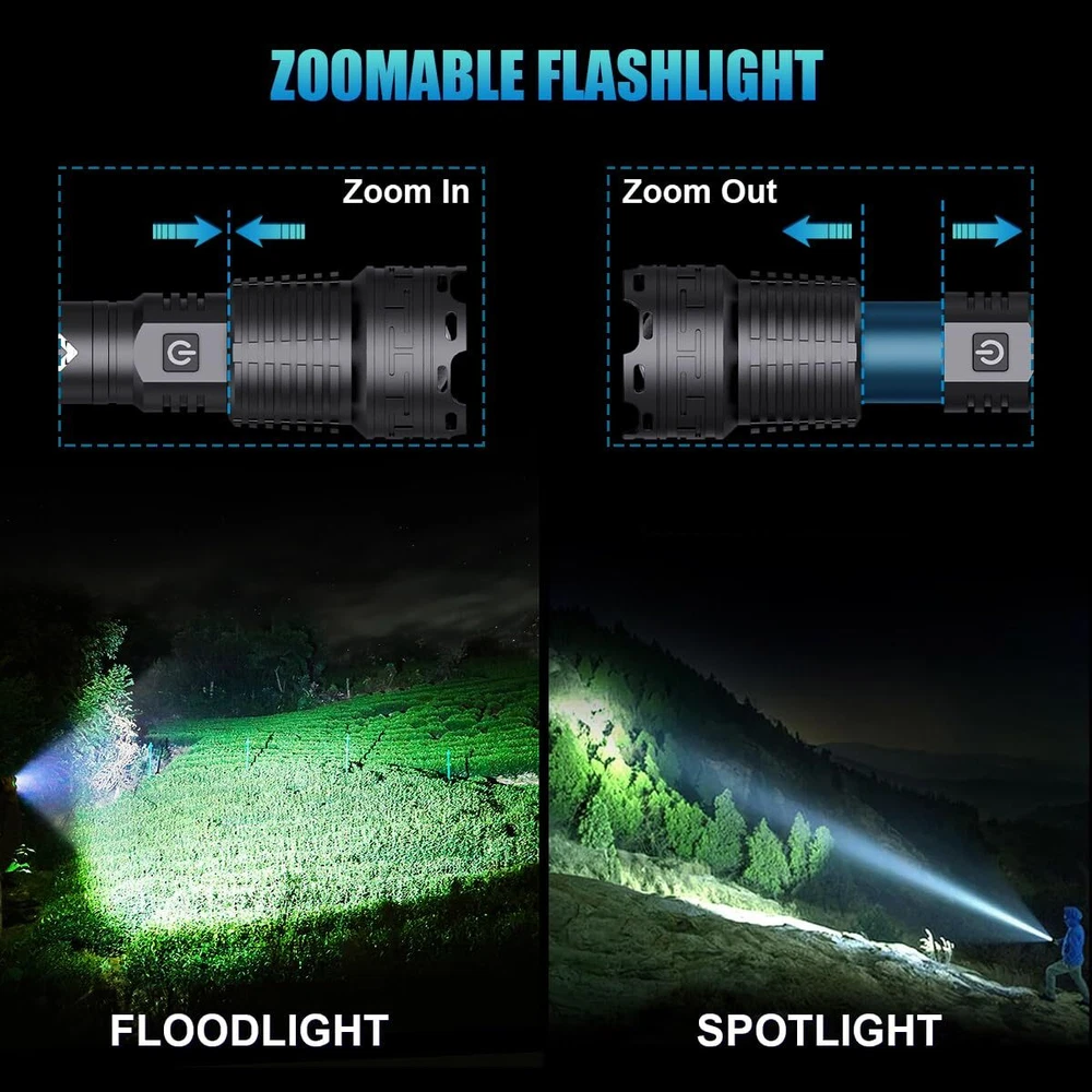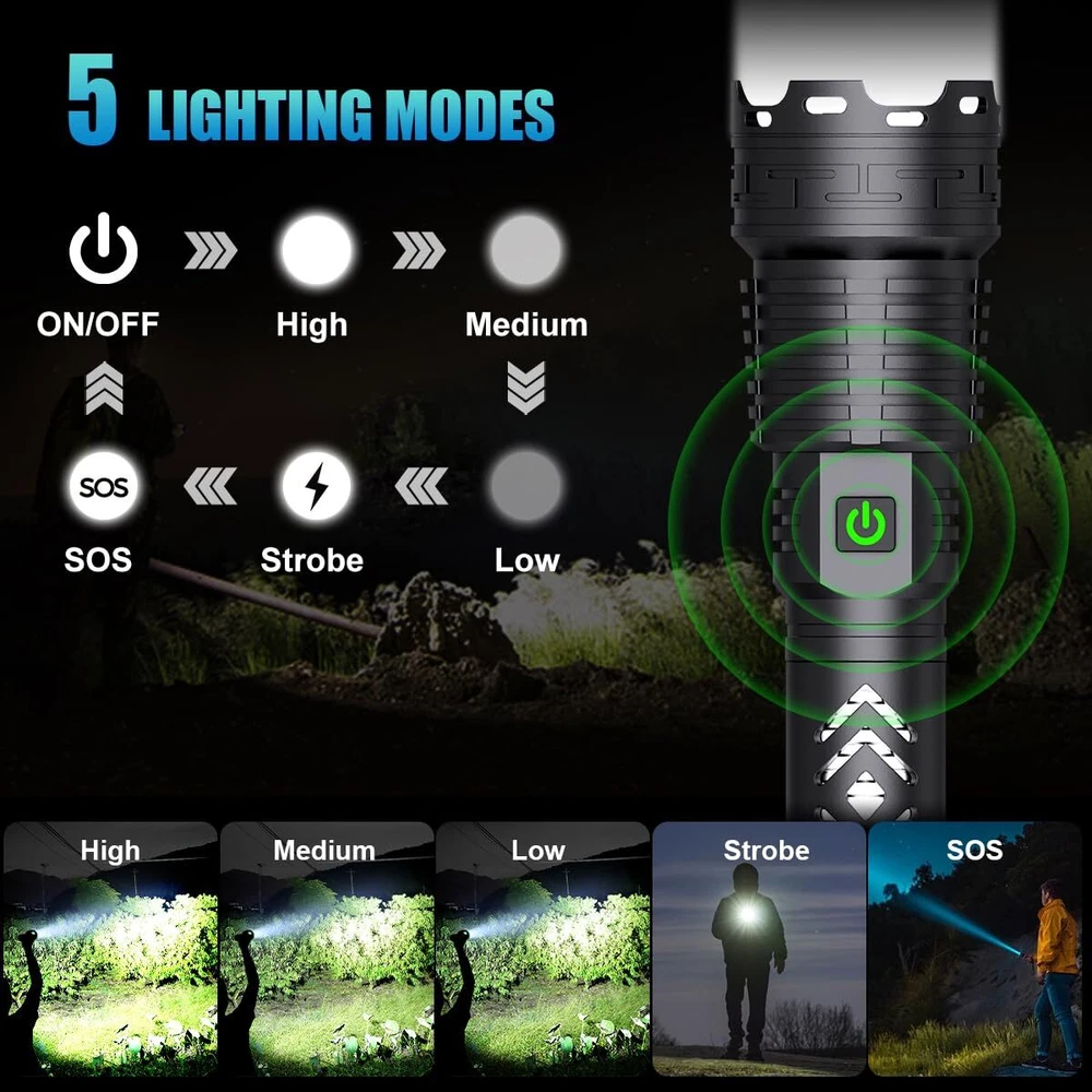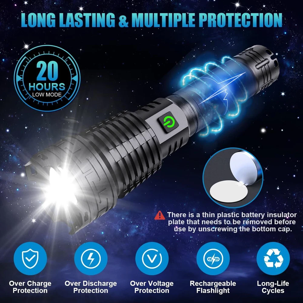 【990,000 LUMENS BRIGHTEST FLASHLIGHT】The LED rechargeable flashlights features new upgraded high lumen LED chips. This flashlights high lumens rechargeable has an incredibly high brightness of up to 990,000 lumens, which is 40 times brighter than a regular LED flashlight. It can easily illuminate an area of 4000 square feet. 【USB QUICK CHARGING FLASHLIGHT】The USB rechargeable flashlights rechargeable battery has a high capacity of 10,000mAh, providing a working time of 8-20 hours and a lifespan of up to 250,000 cycles. It is safer, more reliable, and more durable. It uses a fast-charging interface and has circuit protection features such as overcharge protection, over-discharge protection, over-voltage protection, and short circuit protection, which can extend the tactical flashlight's lifespan. 【5 LIGHT MODES & TACTICAL ZOOM】The super bright tactical flashlights rechargeable offers 5 multi-functional modes (High/Medium/Low/Strobe/SOS) for easy switching to meet your needs.Also it has a telescopic zoom function,we can stretch the head of the high powered flashligh to change the focal length and beam size, freely choose long-distance observation and wide-range lighting.It is suitable for various activities such as camping, hiking, fishing, running, cycling, power outages, emergencies, targeted searching, and general household use. 【EMERGENCY CHARGING】The powerful flashlights rechargeable has reverse charging technology.This heavy-duty emergency flashlight can serve as a backup power source to charge your phone and other electronic devices.The camping flashlight also has a battery level display.Blue indicates that the high-lumen rechargeable battery is fully charged, while red indicates that the battery needs to be charged. 【SOLID CONSTRUCTION & IPX67 WATERPROOF】The anti-slip, heavy duty flashlight rechargeable is made of aerospace-grade aluminum alloy and can be used as a safety hammer in emergency situations.The flashlights high lumens rechargeable adopts thickened sealing rings and has an IP67 waterproof rating, making it more resistant to water.This powerful emergency flashlight can be used normally in heavy rain, blizzards, or other harsh weather and environments. 【GREAT VALUE POWERFUL FLASHLIGHT KIT】- A professional flashlight manufacturer, provide 2 year product service. What you will get: 1x LKP70 super bright flashlight, 1x Powerful battery, 1x Fast Charging Cable, 1x User Manual and Gift Box. You will be pleasantly surprised by the brightness, quality, longevity and performance of the powerful flashlights, If you have any questions about this flashlight, please feel free to linkus. We will be happy to answer your questions. 【ATTENTION】flashlights high lumens install a thin plastic battery insulator plate on the end of the battery, needs to be removed before use by unscrewing the bottom cap.otherwise rechargeable flashlight can not work.