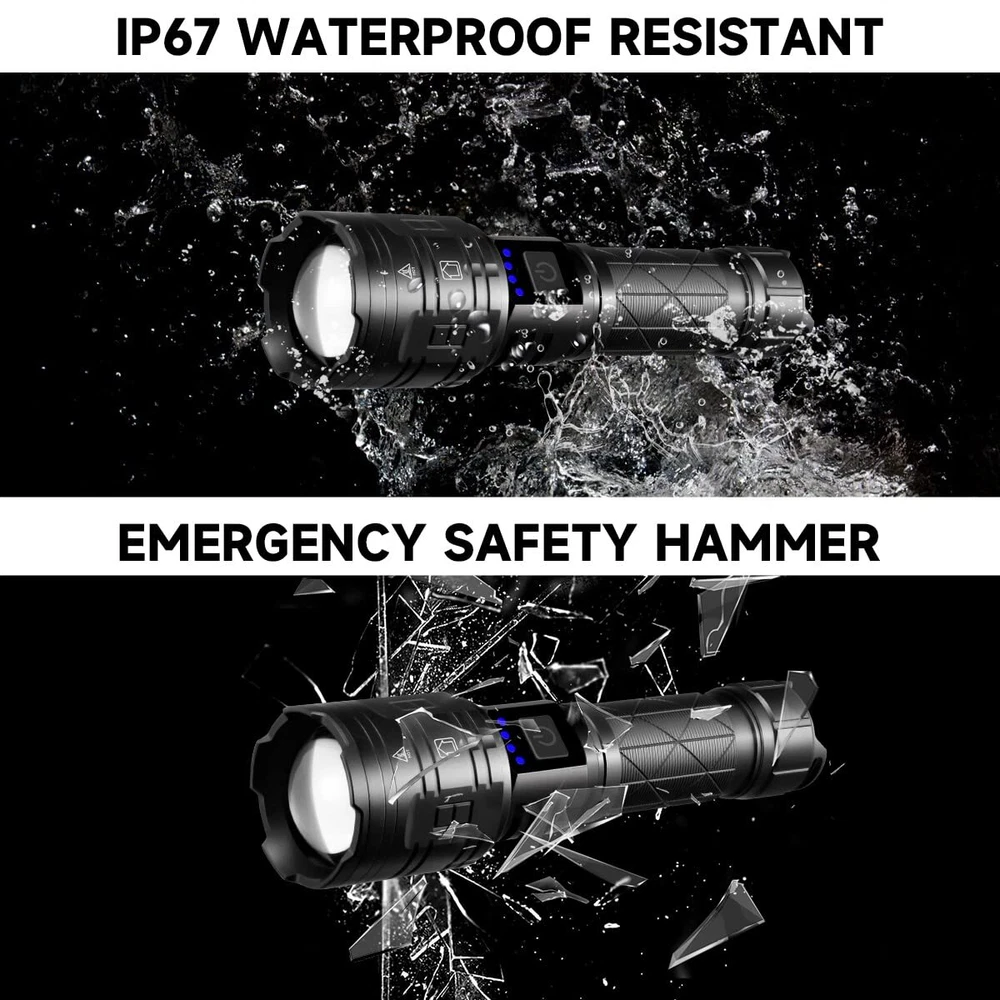 Flashlights High Lumens: rechargeable flashlights are equipped with a super bright P70.2 LED chip, to produce up to 990,000 lumens brightness. With high powered flashlight, meeting your various illumination needs, lighting up to 1300ft² area or 1500ft distance, for emergencies, camping, hiking. LED Flashlight Rechargeable: Equipped with an upgraded large capacity battery, tactical flashlights high lumens can work for 12hours after fully charged. There are fast-charging Type-C port to ensure high efficiency charging for led flashlight. And four power indicators assist you to know the battery level of the rechargeable flashlight. Adjustable & 5Mode Flash Light: Super bright flashlight has adjustable focus function as floodlight for wider area when zoom in or spotlight for longer distance when zoom out by stretching the top of the tactical flashlight. Flashlights high lumens rechargeable have five lighting modes as high/medium/low/strobe/SOS for multifunctional use. Waterproof & Multi-Function: Flashlight rechargeable is made of aviation grade aluminum alloy and sealed design, achieving IP67 waterproof and shatter-resistant. With multi-functional design: (1) With USB output port, brightest flashlight can be used to charge electronic device. (2) With head cusp design, tactical flashlight can be used as safety hammer. (3) With dry battery function, flash light can be used for emergencies. Flashlight Package: Flashlights are packed with 1* led flashlight, 1* rechargeable battery, 1* type-c charging cable, 1* dry battery fix bracket, 1* carrying lanyard and 1* packing box. If you have any flash lights problems, such as not working, lack of accessories, broken package, please message us via amazon, has one-year replacement policy for your use without worry.