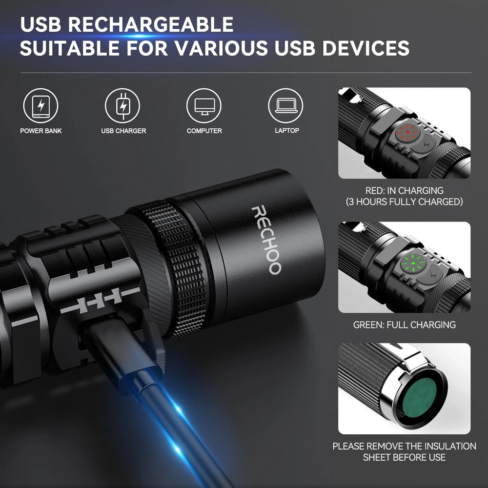 Super Bright Rechargeable Flashlights: Our rechargeable flashlights high lumens equipped with upgraded unique LED, 1500 lumens, dual switch design, easy to use with the distinction between daily (High, Medium, Low) and emergency mode (Strobe, SOS); By extending the flashlight head you can get a wide to narrow beam zoom to illuminate anywhere you want, and by recharging it as an EDC flashlight to accompany your daily life, environmentally friendly and without frequent battery replacement; Double Switch 5 Modes LED Flashlight: Advanced double switch design; The rechargeable flashlight is designed with an emergency button (Strobe / SOS) and a daily button (High / Medium / Low light); Without too many presses to start emergency mode; A smart flashlights for emergencies, home, outdoor activities; Long Lasting USB Rechargeable Flashlight: Powered by a high 3000mAh rechargeable battery; This bright flashlight can reach up to 10 hours (low mode) of working time; Only needs 3-4 hours to get fully charged by any charging devices. (USB-A to USB-C Charging cable Included); Sturdy Waterproof PSturdy Waterproof EDC Flashlight: IP65 Waterproof and Military grade Aluminum Alloy flashlight, sturdy, shockproof, anti-slip; Suitable for use in rain, snow, or emergencies, but can’t into the water for a long time; Compact size and with a friendly pocket clip, make this pocket flashlight easily for daily use; Size: 5.6''x 1''ortable Flashlight: IP65 Waterproof and Military grade Aluminum Alloy flashlight, sturdy, shockproof, anti-slip; Suitable for use in rain, snow, or emergencies, but can’t into the water for a long time; Compact size and with a friendly pocket clip, make this pocket flashlight easy to store and quick to use; Size: 5.6''D x 1''W Great Value Packaged: what you will get: S3000L Rechargeable Flashlight * 1 Rechargeable Battery *1, USBA to USB-C charging cable * 1, Extra USB Cover *2, User Manual*1; Will be a nice Christmas gift for your father, mother, and friend; Notice: Before using the flashlight for the first time, please remove the insulating sheet from the battery to ensure that the flashlight can be charged properly; Excellent After-Sales Service: The excellent after-sales service will be provided for all products; If you have any problems with our flashlight, please feel free to contact us. We'll reply to you within 24 hours;