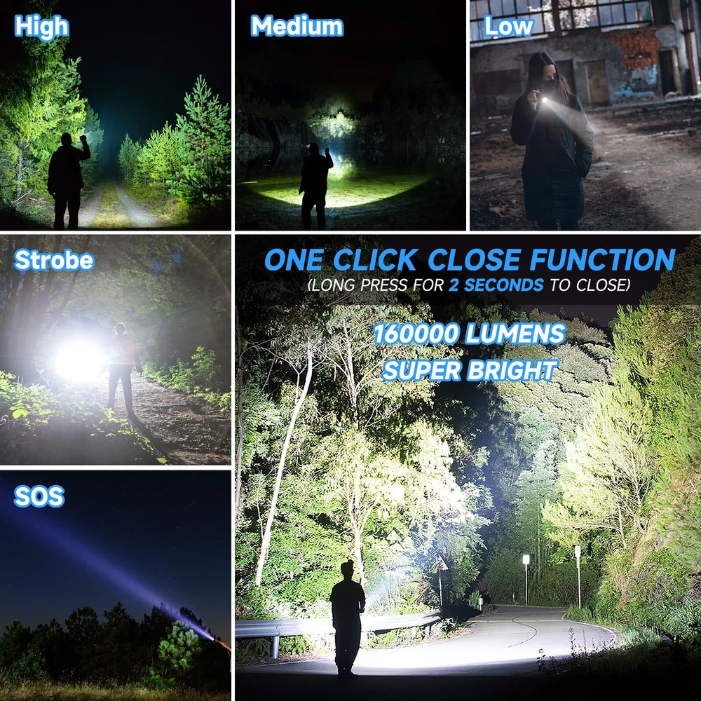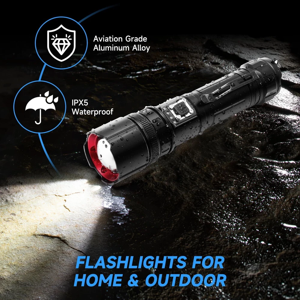 【Small but Bright】 The small rechargeable flashlight features an upgraded chip to provide the brightest light. The performance is improved by 50%, and it's 5 times brighter than ordinary LED flashlight. With a lighting range of over 1680 feet, it can easily illuminate an entire mountain. At the same time, designed with a built-in clip and hand strap, our flashlight is easy to carry and attach to your backpack, belt, or pocket. It's compact in size, making it a reliable companion wherever you go. 【Powerful & Versatile】 Our tactical flashlight offers 5 different modes - High/Medium/Low/Flash/SOS allowing you to adjust the brightness and functionality according to your needs.Flashlight is designed with a zoom function. Zoom in, zoom out – it’s all under your control! The unique memory mode allows you to close it by just pressing and holding it for 2S. The next time you open it, it will still be in the previous mode, eliminating the need to cycle through it every time you close it. 【Never Worry About Running Out of Power Again!】Not only does our powerful flashlight serve as a reliable lighting tool, it also comes with a convenient remaining battery display, so you never have to worry about when it needs to be recharged. Plus, it can even double as a power bank, allowing you to charge your phone or other devices on the go. 【Durable & Waterproof】px Our waterproof flashlight features advanced sealing technology to stay waterproof so you can brave rain, storms, and any challenging weather conditions. This high powered flashlight is made from aircraft aluminum alloy and has been rigorously tested to withstand accidental drops up to 36 feet and rough handling. Ideal for outdoor running, camping, fishing, hiking and exploring. 【Exceptional Customer Service】We firmly believe in the quality of our products and offer a reliable after-sales service. If you encounter any issues or have any questions, our dedicated customer support team is here to assist you. So why settle for a regular flashlight? Choose ours, this top-of-the-line flashlight that's both compact and incredibly bright! Get your hands on it now and be prepared for whatever the darkness throws your way.