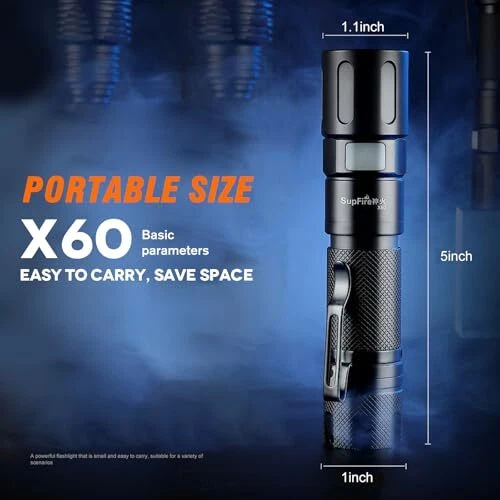 Brand: Does Not Apply Color: Black EAN: Does Not Apply Water Resistance Level: Water Resistant Special Feature: Portable, Lightweight, Durable, Adjustable Focus Item model number: X60 Batteries: 1 Lithium Ion batteries required. (included) UPC: Does Not Apply Manufacturer: Does Not Apply Included Components: Belt Clip, Usb Cable Batteries Required: Yes Country of Origin: China seller: Does Not Apply Material: Aluminum Item Width: 1 Batteries Included: Yes Light Source Type: LED Product Dimensions: 1"D x 1.1"W x 5"H Battery Cell Composition: Lithium Ion Part Number: X60 MPN: Does Not Apply Power Source: Battery Powered Type: Does Not Apply Number of Batteries: 1 Lithium Ion batteries required. (included) Battery Description: Lithium-Ion Color Temperature: 7406 Kelvin Item Weight: 0.31 Pounds Brightness: 900 Lumen Special Features: Portable, Lightweight, Durable, Adjustable Focus Item Height: 1 Model: X60 Item Length: 1 Recommended Uses For Product: Camping, hiking, emergency situations gtin13: Does Not Apply Item Package Quantity: 1 Date First Available: April 21, 2023