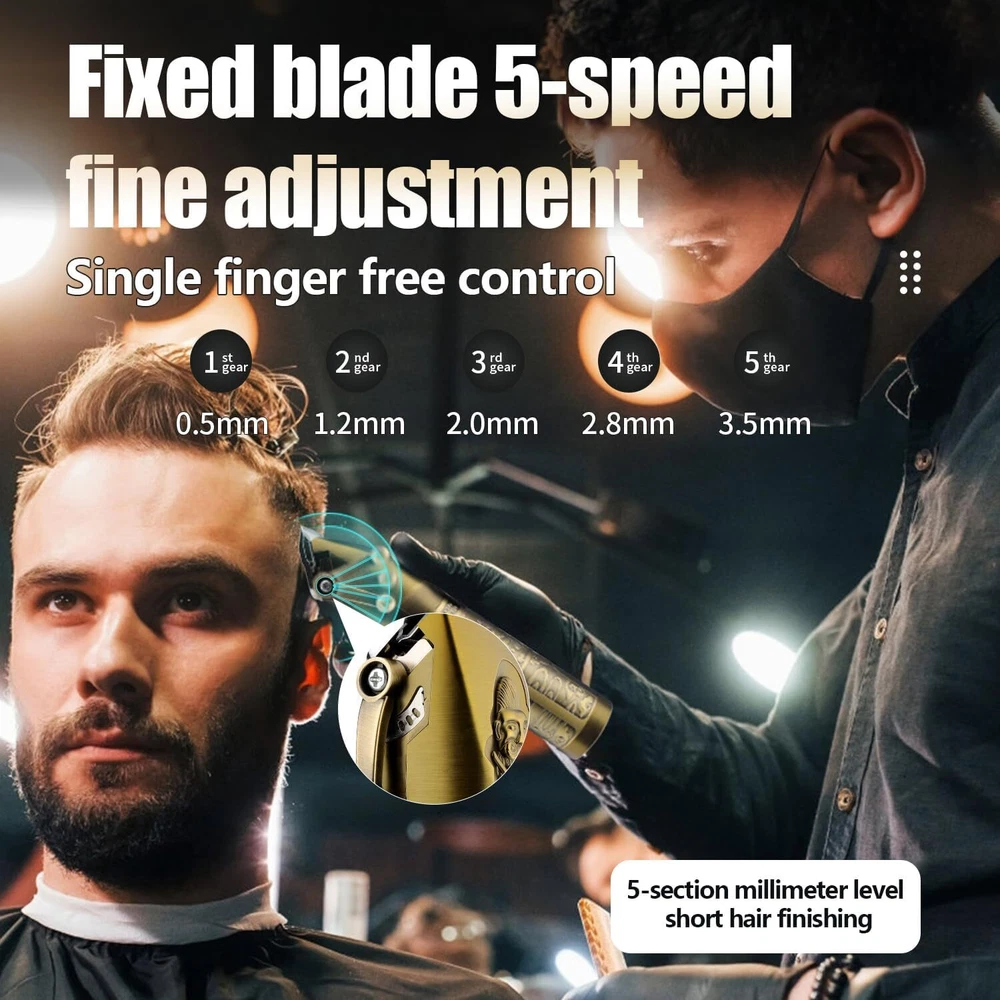 【Practical Barber Clippers Set】This multifunctional hair clipper set combines the functions of clipper, hair trimmer and foil head hair shaver in one. The hair clipper is fast and efficient, with 5 gear adjustable blade that easily cuts all hair types and lengths. The T blade hair trimmer is perfect for precise trimming, grooming, sideburns, neck, beard lines and men's shaving. The hair shaver works well on dense, short and thick hair and the ultra-thin blade mesh gives a close shave. 【High Performance Powerful Motor】 Different from other clippers set on the market ,our hair clipper and the trimmer are equipped with 6500 RPM motors, and the shaver is equipped with up to 8800 RPM motor. The motors provide enough power and performance for many aspects of hair trimming and shaving.You can always have a perfect shaving and haircut experience! 【Smart LCD Display & High Capacity Battery】 The ultra-clear LED can clearly show you the remaining charge, battery status and remind you to drip blade oil in time. Built-in 1800mAh high capacity battery, charge for just 2.5 hours and get up to 150 minutes of cordless use. This hair clipper set is great for travelling, holidays, business trips etc. 【Industry Leading Craftsmanship】With the most precise carbon steel blades, and a fine adjustment lever (0.5-3.5mm), you can easily control the length and create any trendy hairstyle, even the thickest hair can be cut with ease. Classic bronze metal housing with shiny finish offers superior control and comfort. Ergonomic design with embossed texture on the back of the handle, making it sweat resistant and non-slip while providing a firm & stable grip.The knight pattern makes the electric clipper. 【Rich Accessories & Beautiful Packaging】It is equipped with very beautiful packaging and rich accessories, including a cordless hair clipper,a hair trimmer, hair shaver, barber apron, USB cord for quick charge, cleaning brush,oil bottle, and 8 premium guard combs,4 trimmer guards.It includes everything you need for a pro-like cut. Product Description