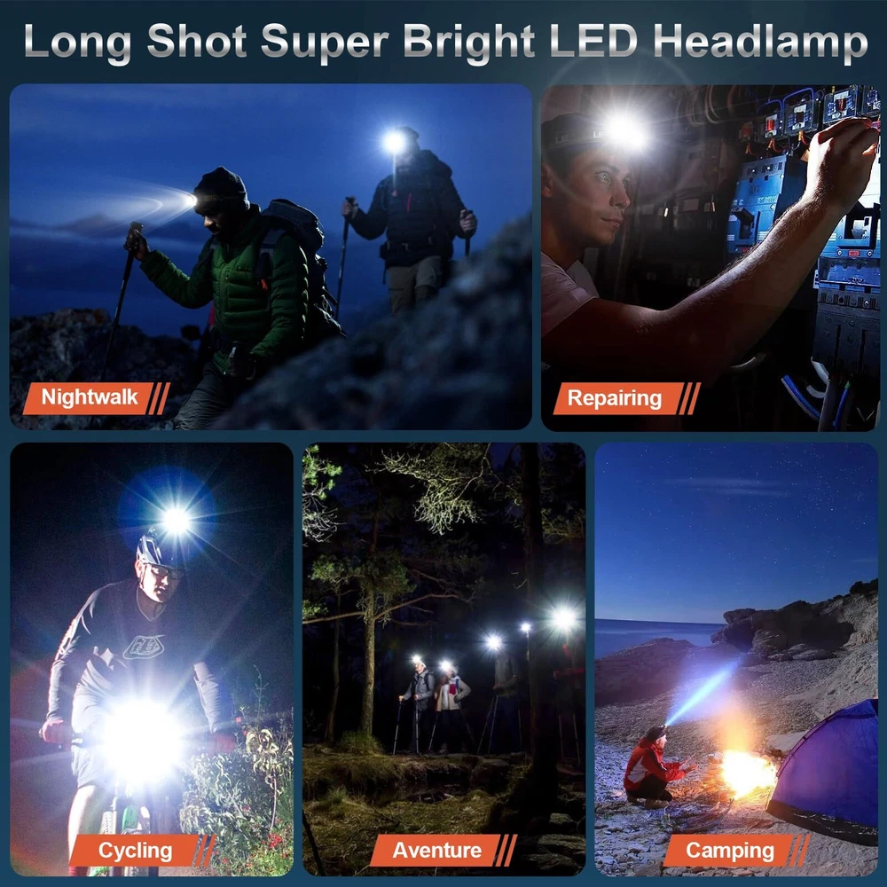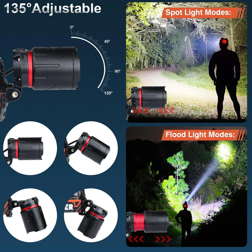 【SUPER BRIGHT HEADLIGHT】This newly upgraded headlamp adds an additional backlight design so that the main light and backlight do not turn on at the same time and can only be used by switching, with a bulb life of up to 60,000 hours, a light intensity of up to 120,000 lumens, and a range of up to 3,938 feet.Equipped with upgraded high-capacity 3* batteries, with a capacity of up to 1,500mAh per battery, which makes it able to last up to 10 hours of continuous work on high brightness, and up to more than 30 hours of continuous work on low brightness. 【UNIQUE DESIGN OF ALUMINUM HEAD MATERIAL】The headband features a cutting-edge design for the camera and uses an oversized lens for wider and brighter illumination. The letters on the headband are illuminated to emit a faint fluorescent glow in dark environments. The best feature is the zoomable headlamp, which is easy and convenient to control, making it perfect for a variety of activities at night. 【ZOOMABLE AND 3+4 LIGHT MODES】: High lumen main light has 3 lighting modes: strong light/low light/strobe, zoomable headlamp to realize free zoom illumination, rechargeable headlamp can emit a large area of floodlight or spotlight; 4 modes for the backlight: strong white light with COB, weak white light, red light with COB is always on, red light burst flash. It is safe, reliable and easy to use, the best flashlight for fishing, hiking, running, hunting and exploring. 【TYPE-C CHARGING & POWER OUTPUT】headlamp is specially designed with Type-C charging and power output design, you can use any Type-C port to charge the headlamp when you are outdoors, and you can also use the headlamp as a power source for battery life when your mobile phone runs out of battery, and they are professionally designed with circuit protection, you don't need to worry about charging safety at all. 【IP67 WATERPROOF & DURABLE】Reinforced density and width of the USB port and bulb cover allows the headlamp to withstand heavy rain and withstand harsh environments such as high temperatures or extremely cold weather, resistant to drops and pressure. And it can dissipate heat quickly, which is safer and more reliable than other Shops headlamps. 【FLOODING AND SPOTLIGHT】Flashlights headlamp with retracte and zoom function. Pull the power headlamp head to switch spotlight mode and pull back the head to switch to floodlight mode. Spotlight mode is suitable for long distance lighting, floodlight mode will more suitable for wide range lighting. 【SUPER BRIGHT HEADLAMP】Can be used with a hat or helmet, no matter how cold the weather, headband how thick the hat, can be used with the elastic band can be adjusted to strengthen, not easy to slip. 【POWER INDICATE LIGHT & SAFETY LIGHT】 Rechargeable head lamp with 5 power indicator lamps, so you can see the power at a glance, and always know how much electricity and charge you have (100%, 70%, 50%, 25%, 10% ). 【POWERFUL SERVICE TEAM】Package includes: Rechargeable LED headlamp x 1, 3*Batteries , Type-C Cable x 1. provide each customer with 24-hour professional online support, 2-year warranty and 30-day money back service. If you have any questions with our headlamps, please contact us at any time! We're always here for you!