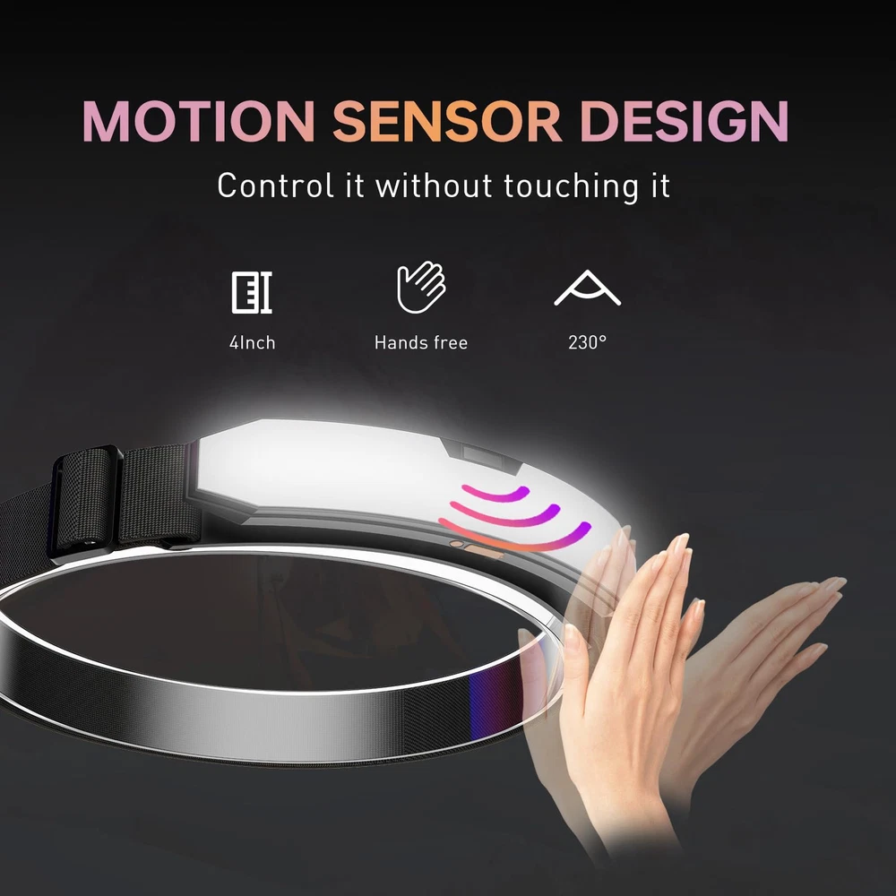 STUNNING BRIGHT & ULTRALIGHT HEAD LAMPS LED RECHARGEABLE: With brightest LEDs, COB headlamp can emit up to 1200 lumens and reach over 300 meters. Compared to a traditional head flashlight, it has a better view, meet most of the dark environment needs. This k0209 headlamp weighs only 113g/4oz, It is so lightweight and comfortable that you won't even feel it, even if you wear it all day. MOTION DETECTION TECHNOLOGY & HANDS-FREE WIDE-BEAM LED HEADLAMP: LED Headlamp Camping Accessories is equipped with the latest intelligent sensors. Even if you're wearing gloves, as long as the distance from the device is within 10cm, you can quickly switch the ON/OFF by waving your hand in motion mode. In any mode, press the power switch 2 seconds into the Motion Sensor mode. POWERFUL HEADBAND LIGHT & 3 LIGHT MODES: Built-in 2000mAh rechargeable battery, Fast charging in 3 hours, and will give you up to 2 hours in high-light mode and 12 hours in low-light mode. Great gear for any situation, such as hiking camping running fishing hunting mechanic working. ORIGINALITY 90° ADJUSTABLE FOREHEAD LIGHT: Unlike other ordinary strip COB headlamps, allows to rotate the strip downward up to 90°, you can easily change the angle of the light to the direction you need, expanding the visible range. PROFESSIONAL IPX4 WATERPROOF HEAD LAMP: Fully enclosed design to prevent water mist and rain from entering, enough to deal with all inclement weather. The elastic headband will fit perfectly on your head, breathable and non-slip. RISK-FREE PURCHASE: Don’t worry about missing Amazon’s 30-day return window, will provide 180-day quality assurance and 60-day money back. BUY WITH CONFIDENCE, Add LED headlamp flashlight to your cart now!!!