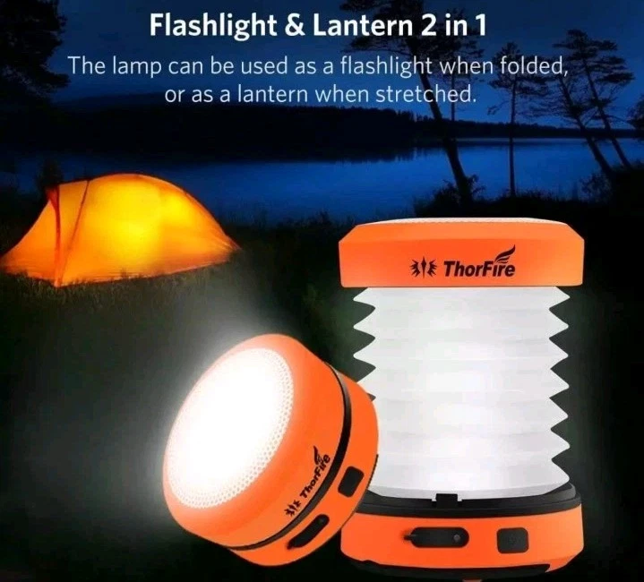 The ThorFire Rechargeable LED Camping Lanterns feature a hand crank for recharging and a collapsible design for easy storage. These lanterns use LED lighting technology, providing bright and efficient illumination for camping and hiking adventures.