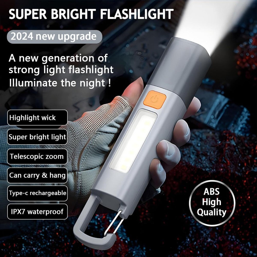 【Super Bright Flashlight with Side Light】Our LED flashlight offers a bright, true brightness of up to 20,000 lumens, illuminating your path or workspace. The bright flashlight features three light modes:Bright Light, Strobe, and Side Light. This 3-in-1 multifunctional EDC flashlight is perfect for reading, camping, hiking, and everyday use. 【Adjustable Zoom Flashlight】Easily switch the beam from a wide floodlight to a focused spotlight. This compact yet powerful flashlight allows you to change the lighting distance and size for various applications, making it ideal for camping and outdoor activities. 【Durable & Long-lasting Battery】Equipped with a high-capacity rechargeable battery, our rechargeable flashlight extends runtime without the need for extra batteries. Charge it with the included micro USB cable, and enjoy up to 10 hours of runtime when fully charged. 【Portable Compact Design & Durability】This mini small flashlight is lightweight and portable, measuring just 6.14 inches long and 1.18 inches wide. Its compact size easily fits in your pocket or bag, and it comes with a hanging hook for convenient storage in pockets, belts, or backpacks. Made from sturdy materials, it can withstand drops and harsh conditions. 【Best After-Sales Service and 2-Year Warranty】We carefully inspect all products before shipping to ensure they work perfectly. If you have any questions about our flashlights, please feel free to contact us, and we’ll provide a satisfactory response.