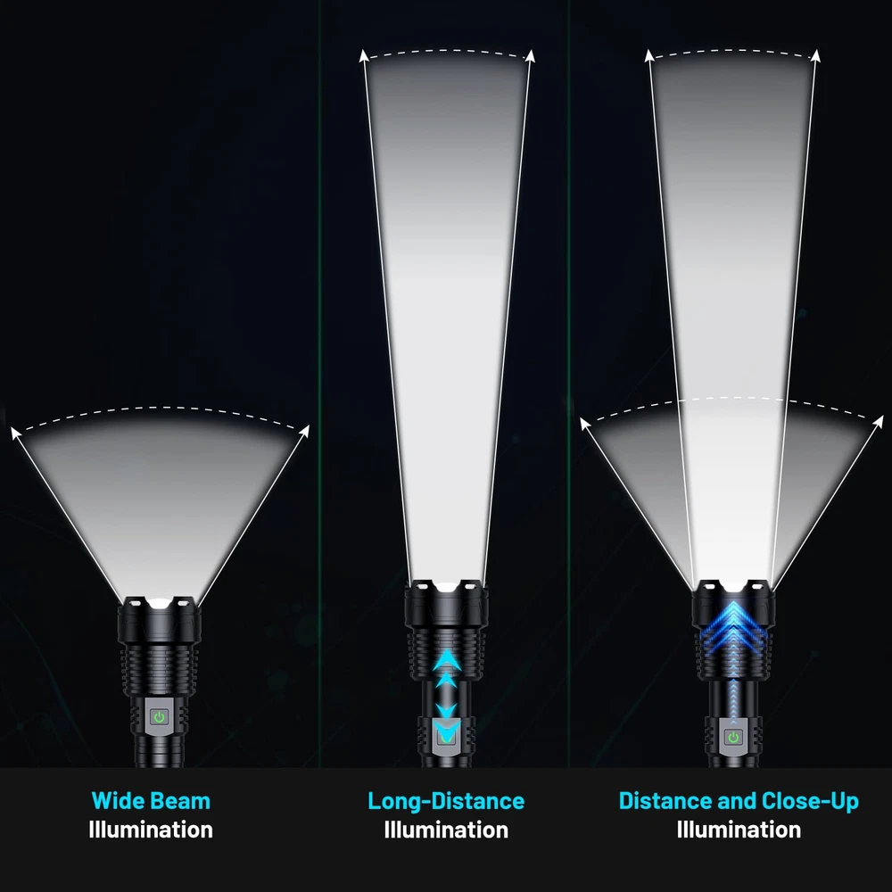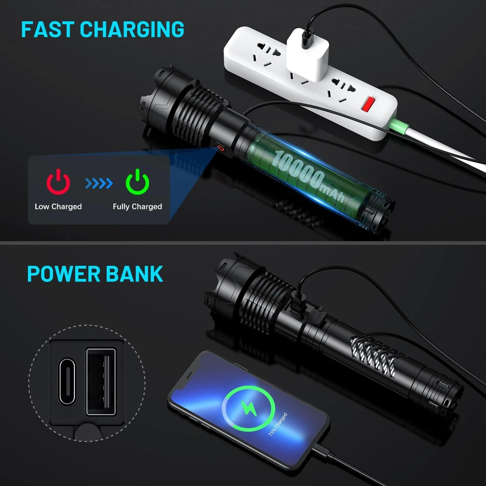 ☀️Super Bright LED Flashlight:This bright flashlight features an upgraded design with a long handle, which is longer and easier to grip than the regular model. It can output up to 3600000 lumens and has a maximum illumination distance of up to 8000 feet, making everything in front of you bright and clear, protecting you from the effects of darkness. This is a high powered flashlight suitable for hiking, night fishing and dog walking. 💡5 Modes & Zoomable:This flashlights high lumens has 5 brightness levels: high, medium, low, strobe, SOS. In any mode, long press the switch button for 3 seconds to quickly turn off without cycling through all modes. In addition, you can stretch the head of the rechargeable tactical flashlight to obtain a wide or narrow beam of light, expanding or reducing the area covered by the light to adapt to different lighting environments. 🔋Upgraded Battery: This rechargeable flashlight is equipped with an upgraded 10000mAh battery, which is brighter than other flashlights, has longer battery life and can run for over 31 hours in low mode. Try this battery powered flashlight, you will fall in love with it. 💧IP67 Waterproof & Shockproof:This powerful flashlight is made of aviation aluminum alloy and has functions such as waterproof, efficient heat dissipation and anti drop. It can be used in rainstorm, snow, hail and other severe weather conditions.The waterproof flashlight features a long handle and anti slip design, making it easy to grip and use. It is suitable for camping, emergency and hunting. 💁Excellent After-Sales Service: This powerful tactical flashlight provides 24 hours customer service. If you have any questions about our flashlights high lumens rechargeable, you can always leave us a message through Amazon, and our professional team will solve the problem for you.