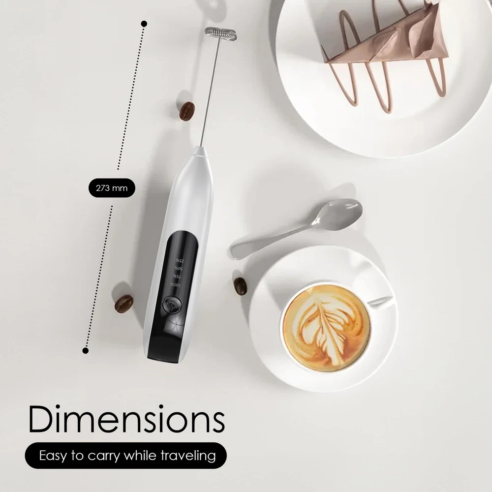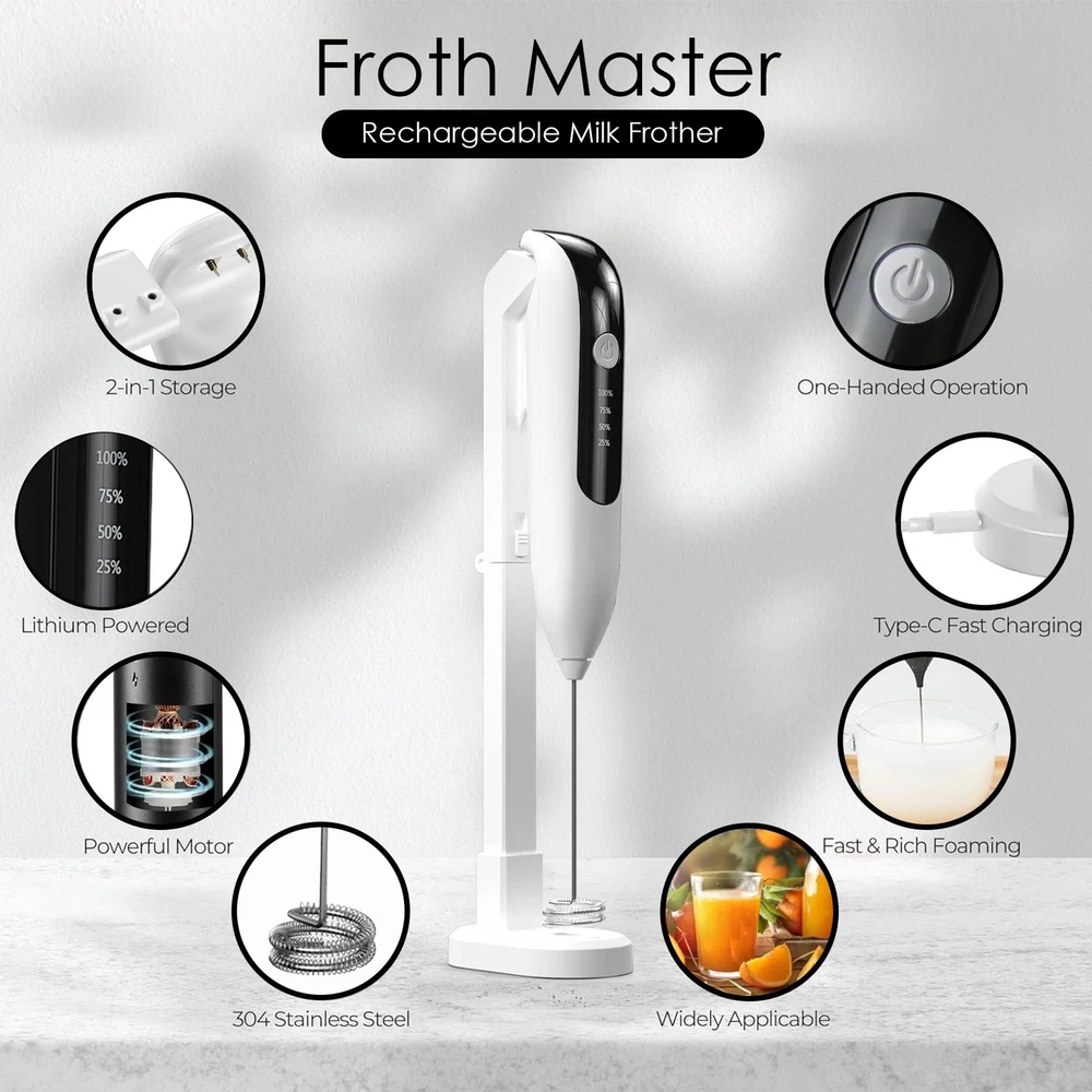 POWERFUL MOTOR WHISKS MILK TO PERFECTION: With a high-speed motor of spring coil frother delivers fast and consistent results, producing rich and silky foam in seconds. Enjoy cafe-quality beverages from the comfort of your own home. The ergonomic handle of hand held frother provides a comfortable grip, making it effortless to froth milk for extended periods. CREAMY FROTH IN SECONDS: Indulge in barista-worthy coffee drinks anytime with this rechargeable milk frother. The powerful motor effortlessly whisks milk, creating thick, creamy froth ideal for cappuccinos, lattes, macchiatos, and more. Forget settling for flat, thin milk – this frother takes your coffee creations to the next level, replicating the rich texture you love from your favorite cafes, all from the comfort of your own home. WIRELESS & PORTABLE: Love frothy coffee but have limited counter space? This milk frother is the perfect solution! Its compact design ensures it takes up minimal space on your countertop. Plus, the lightweight and portable construction makes it ideal for travel enthusiasts who won't compromise their coffee routine on the go. Throw it in your bag and enjoy frothy lattes or creamy hot chocolate wherever your adventures take you. VERSATILE FROTHING & MIXING: This versatile milk frother isn't just for coffee lovers! The powerful motor and frothing attachment make it ideal for a variety of tasks beyond creating creamy milk foam. Use it to whip up hot chocolate, froth milk for protein shakes, or even blend small batches of sauces and dressings. Further, our small and efficient mini mixer works on all types of milk - half and half, creamer, soy, almond, cashew, hazelnut, whole milk, and other dairy such as butter or cream. STYLISH & FUNCTIONAL: This milk frother isn't just functional, it's stylish too! The sleek and modern design complements any kitchen décor. Plus, the included stand provides a convenient storage solution, keeping your frother within easy reach and your countertop clutter-free. With both style and functionality in mind, this rechargeable milk frother is the perfect addition to any coffee lover's kitchen.