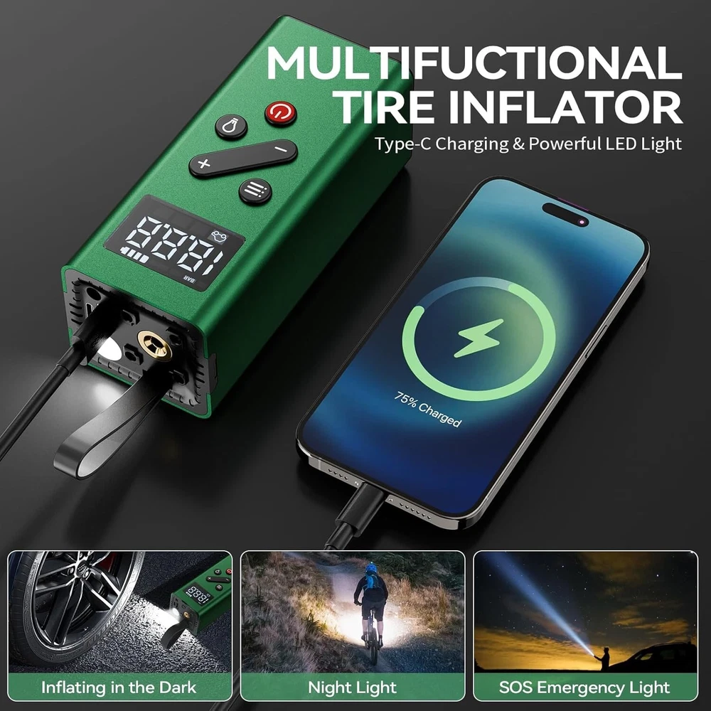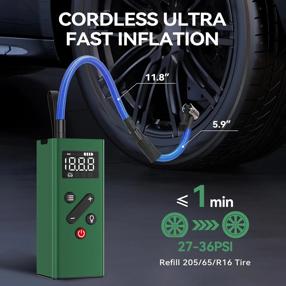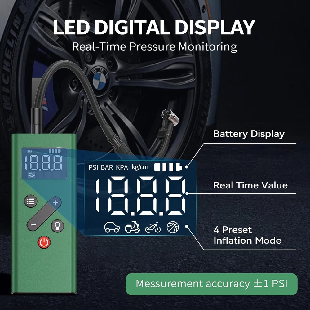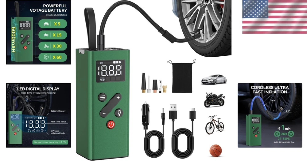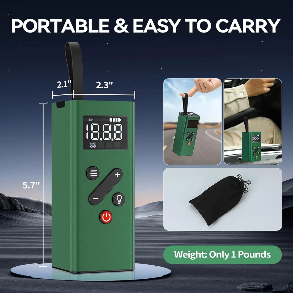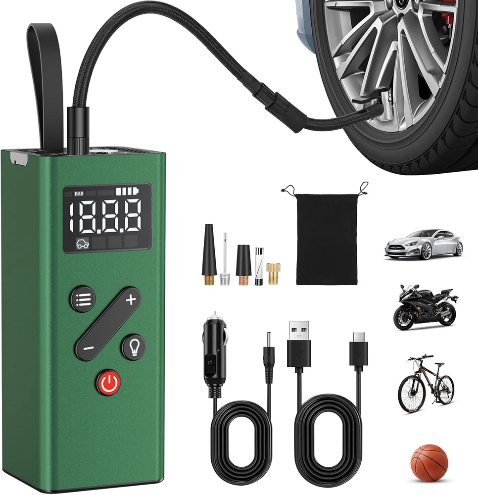 Rechargeable Mini Tire Pump with Digital Display for Cars, Bikes & Sports Gear ‹ › ‹ › ‹ › ‹ › ‹ › ‹ › ‹ › ‹ › Rechargeable Mini Tire Pump with Digital Display - Perfect for Cars, Bikes & Sports Gear Product Features: Excellent Material & Portable Design: Crafted from high-quality alloy shell that is shock-resistant and offers superior heat dissipation. Comes with a silicone handle strap and a compact storage bag, making it easy to keep in your car, bike rack, or backpack. 2X Fast Inflation & Automatic Stop: Delivers impressive inflation power up to 150psi, quickly inflating car tires while automatically shutting off at your desired pressure to prevent overinflation. (Not suitable for medium and large heavy-duty trucks!) Powerful & Long Lasting Battery: Features a robust 2500mAh *2 built-in rechargeable battery, fully charging in just 2.2-2.5 hours. Inflate a 195/55/R15 car tire up to 5 times (0-36psi) on a single charge, eliminating concerns of quick battery drain. Dual Charging Methods: Comes with a 9.8 feet DC 12V power cable for emergency outdoor situations, as well as a USB charging cable for everyday use. LCD Digital Display & 4 Inflation Modes: Real-time pressure readings for precise operation, with four preset inflation modes and pressure units (PSI, KPA, BAR, KG/CM²), accommodating various inflation needs. Multi-Functional Usage: Acts as an inflator, power bank, and flashlight. Reverse-powered USB ports ensure you can charge mobile devices while on the go, and the super-bright LED light with three modes assists during tire inflation and in low-light conditions. Why Choose Our Rechargeable Mini Tire Pump? If you seek efficiency and reliability in your tire inflation needs, this Rechargeable Mini Tire Pump provides the perfect blend of power, portability, and innovation. Built with durable materials and an intuitive design, it ensures fast and safe inflation while being the perfect companion for travel and outdoor activities. Don’t let a flat tire leave you stranded. Equip yourself with this essential tool and embrace the peace of mind it brings. Order yours today! Shipping Free & Fast Shipping - We offer free shipping to most of the USA with a normal delivery time of 3-7 days. However, due to the current situation, additional delivery time (up to 3 weeks) may be required for some items. Alternative Carriers - We may use alternative carriers (e.g. USPS, FedEx, UPS, etc.) to ensure your package arrives safely and on time. Due to the use of multiple carriers, we are unable to provide a tracking number automatically. Handling Time - Orders are processed and shipped within 1-2 business days of receiving cleared payment. Shipping Restrictions - Shipping to Alaska, Hawaii, Puerto Rico, Guam, and other US territories may incur shipping charges or delivery restrictions. Please contact us before ordering, or your order can be refunded/cancelled. State Restrictions - There may be restrictions based on your state of purchase. For example, certain items may not be shipped to California due to state regulations. Contact for Tracking Updates - If you require tracking updates or have any concerns about the delivery of your order, please feel free to contact us, and we will be happy to assist you. Return 30-Day Hassle-Free Returns - We want you to be completely satisfied with your purchase. If you are not, you can return the item within 30 days of receiving it for a full refund or exchange. Easy Return Process - To start a return, simply contact us and we will provide you with a prepaid return shipping label and detailed instructions. Restocking Fee - There are no restocking fees for returns. However, the buyer is responsible for return shipping costs if the return is not due to a seller's error. Refund Processing Time - Refunds will be processed within 5 business days of receiving the returned item in its original condition. Payment We accept all major credit cards, PayPal, and Apple Pay for your convenience. Your payment information is secure and encrypted to ensure a safe and seamless transaction. Please complete your payment within 3 days of purchase to avoid any delays in shipping. Feedback Your feedback is extremely important to us. We strive to provide the best products and customer service possible. If you are satisfied with your purchase, please take a moment to leave us a positive review. If you have any concerns or issues with your order, please contact us before leaving negative feedback. We are committed to resolving any problems and ensuring your satisfaction. Contact Us If you have any questions or concerns, please feel free to reach out to our customer support team. You can contact us through the eBay messaging system. We are available Monday to Friday, 9:00 am to 5:00 pm EST, and we will do our best to respond to your inquiry within 24 hours. Buy it now and enjoy a pleasant shopping experience! UPC: Not Set Model: Not Set Item Width: Not Set Item Length: Not Set Item Height: Not Set Item Diameter: Not Set Item Weight: 1.65 pounds Unit Quantity: 2 Set Includes: Pressure Gauge,Storage Bag,USB Charging Cable,DC 12V Power Cable,4 Adapters Brand: Unbranded Type: Portable Air Compressor Portability: Portable Voltage: 12 V Power Source: Corded Electric Maximum Working Pressure: 150Psi Tank Capacity: Not Set Lubrication Type: Not Set Horse Power: Not Set Tank Material: Not Set Flow Rate: Not Set MPN: Not Set Color: Green Country/Region of Manufacture: Not Set Manufacturer Warranty: Not Set Unit Type: lb