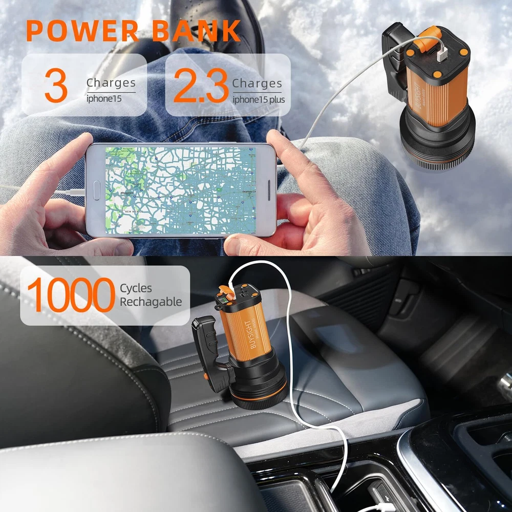 is professional to do high-quality LED lights. Choosing is to buy the sight. Specification: Brand : Name : Rechargeable flashlight Item No : AL-953 Materials : ABS Brightness : 2 dimming mode Bulb type: High-lumen LED Emitting Color: White Input Voltage : 110V/220V Product Weight : 0.618g (21.8oz) Battery Type : lithium battery Charging Time : about 8 hours Lighting time: 16 hours Color : Golden Power Source:9000mA battery Features: -Super bright LED Portable light(9000mA battery inside). -USB Port design, it can charge your mobile phone,camera, digital product etc. -High quality LED can be used for more than 100,000 hours, which eliminates the trouble of replacing the lamp. -Suitable for home maintenance and outdoor activities,like camping, fishing,hiking, night fishing, sailing, caving and hunting etc. Package Including: 1 x Portable light 1 x 110V-240V Charger 1 x shoulder straps Tips: -Please make it fully charged before the first use for the possible charge-depleting in transit. -Do not immerse it in the water for prevention of short circuit. Large Capacity Rechargeable batteries&Emergency Portable power supply: Battery capacity up to 9000mAh can give you a long outdoor working time . Smart multiple protection (overcharge/ over discharge protection) can keep it safe and steady when you use it as a mobile power to charge your smart devices. A Rechargeable Spotlight with Serious Lasting Power - Over 20 Hours(High Brightness).NO need to endlessly pay for batteries. This Updated spotlight is made with a long-lasting, rechargeable battery with large capacity (9600 mAh),lasting 50% longer than any other last generation spotlights. Impact Resistant & Waterproof: Made from tough, impact resistant ABS and Rubber waterproof plug to protect the system from scratch,drops,bumps and splash. Should you meet rains while hiking, camping, sailing or hunting, no worries - it's IPX 6 waterproof! Easy to hold & Handiness Design : Comfortable handle together with adjustable length shoulder strap, makes it pretty handy.The weight low to 0.618g gives you a long handiness experience without tiredness. No-Worries Guarantee:There is an ongoing soldering issue that prevents a small percentage of spotlights from working properly. We have managed to reduce the rate of these faulty units considerably, but not yet completely. We feel very bad about it and are actively working on solutions. If you receive a defective product, contact us and we will immediately send you a replacement unit for free. No Return Required.Contact us!