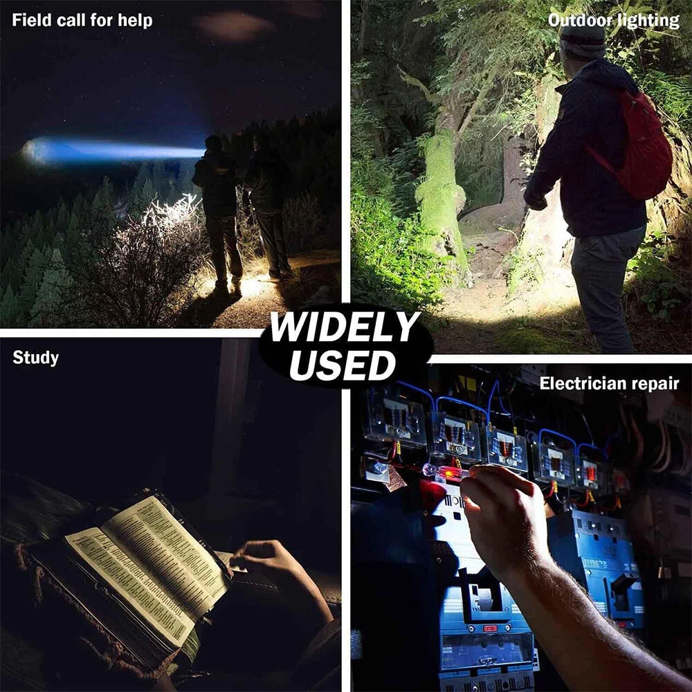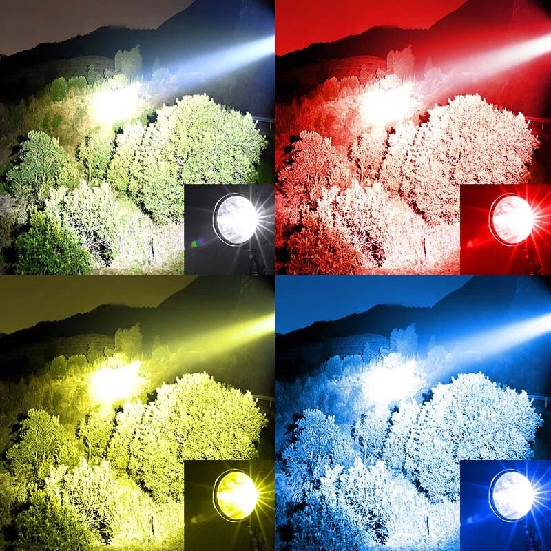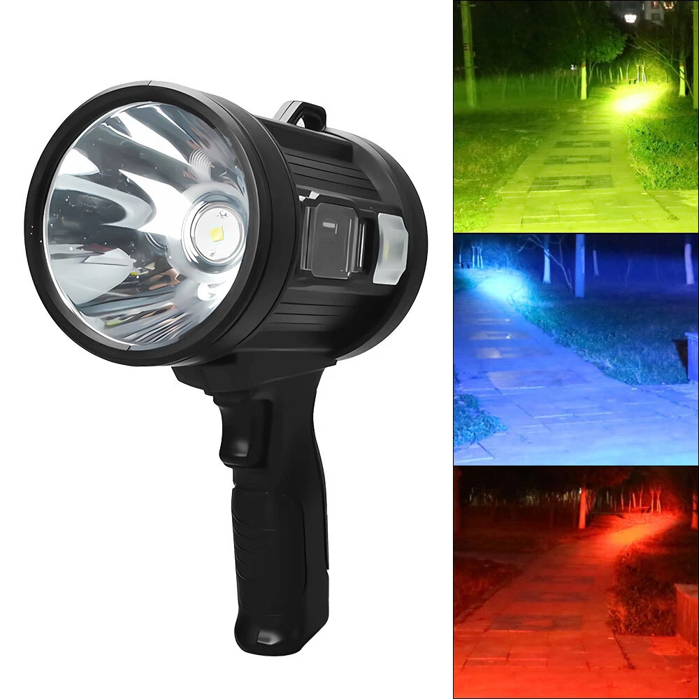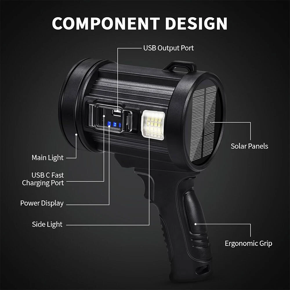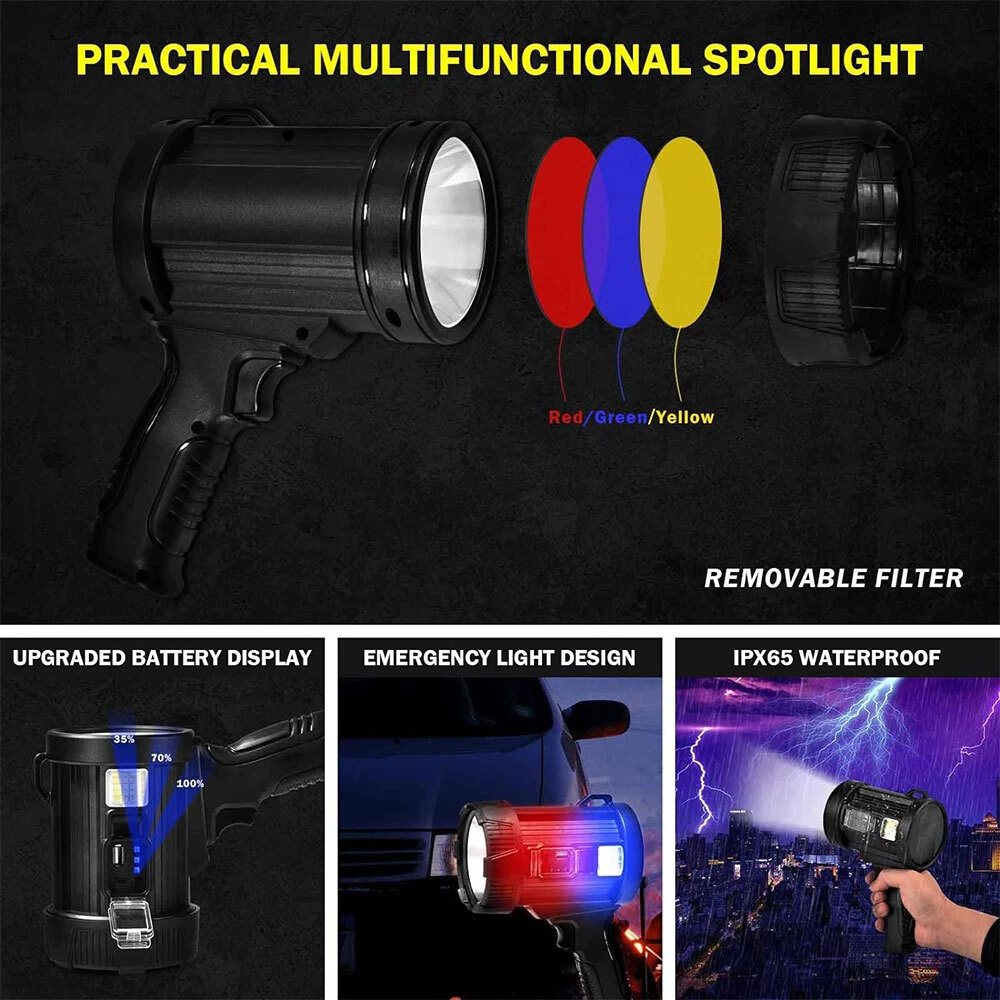 About this item: 1、1000,000 Lumen High Brightness Spotlight - Super bright 1000,000 lumen spotlight flashlight with built-in high brightness LED chip, 10 times brighter than other spotlights, bright and steady light. The strong light sweep is about two soccer fields long and has a range of up to 3,600 feet. Our rechargeable spotlight is perfect for outdoor hunting, hiking, fishing and night work. 2、2 CHARGING MODES - High lumen spotlight with built-in 9600 mAh high capacity ΒATERY, guaranteed to charge over 10,000 times.USB CHARGING TIME: 4-6 hrs. Solar charging time: 10-20 hours. It can also be used as a mobile power to charge your cell phone, very convenient.3 blue indicator lights show the remaining power (25%, 50%, 75%, 100%) . This solar spotlight is a great companion when you are out and about! 3、MAIN LIGHT 3 MODES - The main light of the outdoor spotlight has 3 modes: Front Light (High-Medium-Strobe). Penetrates deep darkness, fog and water. Up to 20 hours of run time. Upgraded LED spotlight emits bright, even lumens of white light that is less visually fatiguing and ideal for close up lighting indoors or in work areas. Side Light 2 Modes - Versatile spotlight with 2 modes of side light: Side Light (High-Low). Up to 30 hours run time. Upgraded handheld soft curved handle for comfort and durability. Bi-directional push-button design is easy to use and makes it an ideal gift for family, friends and the holidays. 4、4 COLOR FILTERS & ADJUSTABLE SHOULDER STRAP - In addition to the standard white light, the main light of the handheld spotlight is equipped with 3 colors of interchangeable lenses (Red-Blue-Yellow) to project different colors to meet the needs of different lighting environments. The included shoulder strap makes it easy to carry the spotlight, freeing up your hands during boating, camping and car maintenance. 5、100% SATISFACTION GUARANTEED - The IPX6 waterproof spotlight flashlight brings great convenience for your outdoor travel, allowing you to work in hot, rainy and snowy weather. It is made of sturdy aluminum alloy and ABS material to protect your searchlight from scratches. We promise to serve every customer seriously. Product Description 1000,000 Lumen Brightest Spotlight Flashlight - Turn Night into Day! WHY CHOOSE OUR RECHARGEABLE FLASHLIGHT? 1. BRIGHTEST SPOTLIGHT - Our rechargeable spotlight uses an upgraded P90 led chip, with higher output lumens, up to 1000,000 lumens. Easily illuminate an entire room or focus on objects within 3600 feet. Long runtime make it a quality lighting tool. 2. BRIGHT 5 MODES - Multifunctional spotlight with 5 modes: (1)Main Light(High - Medium-Strobe) . (2)Side Light(High - Medium) . Can penetrate deep darkness, fog and water. 3. 30H LONG RUNTIME - Our powerful spotlight has a capacity of 9600 mAh ΒATTERY, can provide up to 30 hours or more for outdoor lighting activities. 4. FAST CHARGING & POWER BANK - Our flashlight USB fast charging on 4 hours, Suitable for wall chargers and USB charging ports. It can also be used as a power bank to charge your mobile phone. 5. POWER DISPLAY : Our power display allows you to know the remaining power and when it needs to be charged more accurately, which is very convenient. 6. IPX6 WATERPROOF - The waterproof grade of the our flashlight is IPX6, No problem on rainy days! Great for outdoor camping, hiking, night running, dog walking, boating, fishing, climbing, hunting, including home emergencies, garages, power outages, car repairs. Perfect for treating yourself or giving as a gift. Spotlight Flashlight with 5 Light Modes for Your Choice Main Light 3 Modes - Outdoor Spotlight with Main Light 3 Modes: Front Light (High-Medium-Strobe). Run time up to 20 hours. Can penetrate deep darkness, dense fog and water. Side Light 2 Modes - Handheld Spotlight with Dual Side Lights 2 Modes: Side Light (High-Medium). Run time up to 30 hours. Red & blue strobe light for warning and help call. White/Red/Blue/Yellow - Replaceable Lenses : Powerful LED spotlight with 4 color lenses, with high-medium-flash mode. You can cycle through different lighting modes by installing lenses of different colors to meet your lighting needs. Outdoor Spotlight - Supports USB+ Solar Charging. It Can be Charged with Sunlight! A high-conversion solar panel is installed on the back of the searchlight body. The searchlight can be charged by placing it under the sun during the day. Charging is quick and convenient. Solar charging time: 10-20 hours. It is very suitable for outdoor camping, hiking, mountain climbing, and dog walking. It solves the problem of difficulty in charging outdoors and gives you a full sense of security when outdoors! Our Rechargeable Spotlight with USB Input Port & Output Port Fast Charging in 4 Hours: This flashlight can be charged either with a wall charger at home or outdoors with a USB car charger/mobile power supply. As a Power Bank: The spotlight can also be used as a mobile power source to charge your cell phone or laptop in an emergency. Power Display: Rechargeable spotlight with 4 power indicators for more accurate indication of remaining power (25%, 50%, 75%, 100%). Built-in 9600mAh Large-capacity ΒATTERY : The spotlight flashlight is equipped with a 9600mAh large-capacity ΒATTERY, which can provide up to 20 hours of working time in the main light medium brightness mode and up to 30 hours of working time in the bright light mode. Side light medium mode to keep the light bright. Multi-functional Spotlight, Light up Your Life Work IPX6 Waterproof: The LED spotlight adopts IPX6 waterproof design and can withstand harsh environments such as heavy rain, extreme cold, and high temperature. Powerful Spotlights: Sturdy aluminum alloy + ABS design, with extremely high drop-proof performance, very suitable for home or outdoor use. Adjustable Shoulder Strap: Convenient to use and carry. A must-have for the outdoors! Led Spotlight With 4 Color Lenses to Meet The Lighting Needs of Different Scenes Materia