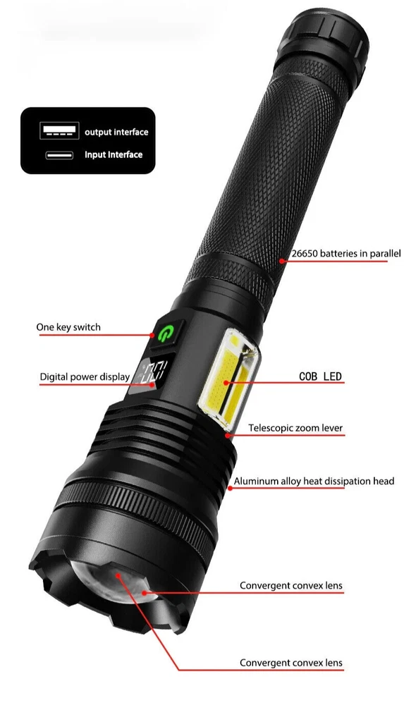 IP Rating: IP65 Model: IP65 Type: Flashlight Power Source: USB Material: Aluminum Number of LEDs: 1 Color: Black Operating Time: More Than 10 Hours Features: Batteries Included, Rechargeable, Waterproof, Telescopic Light, 8 Lighting Options Lumens: 1000 lumens Battery Technology: 26650 Number of Lights: 1-3 MPN: FL124 Voltage: 6V Brand: Aeternam Number of Batteries: 2 Lighting Technology: LED
