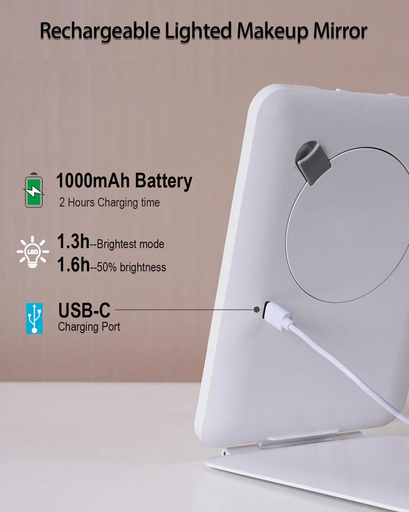 A 3-inch 10X Magnifying Mirror for Close-up: This lighted mirror is a regular mirror, coming with a 10x magnifying mini round mirror that clicks magnetically to the center, helping you with close-up tasks like tweezing eyebrows or applying liquid eyeliner or mascara coat. However, the round 10X zoom mirror blocks a big portion of the lighted mirror, so using it separately instead of always tacking it onto the glass is highly recommended. It can be hidden on the mirror back while not used. Super Bright Desk Mirror: Even illumination with 70 LEDs, the lighted vanity mirror softly illuminates every part of your face equally. With 3 color lights to pick from, a warm white light is best for applying makeup for a night out; a bright daylight setting for makeup for outdoor activities; and a cool light for a day spent in an office or classroom. This lighted beauty mirror will allow you to toggle between light temperatures to suit a variety of looks and situations. Book-Size Mirror Perfect Lightweight Travel Lighted Mirror: The mirror itself is only 0.7 pounds, 5.3 inches by 7.6 inches in width and height, and less than an inch thick, making it easy to packed in a bag or store in a luggage. Sufficient for makeup application and touch-ups for commute and 2-3 day business trip. The lighted makeup mirror is bright enough for daily use on vanity while it only takes up a small space. Rechargeable Lighted Compact Mirror: The mini LED mirror is rechargeable with 1000 mAh battery, you can use it cordlessly. If you need something for on-the-go use, this lighted travel mirror is highly recommended. You don't have to struggle with lighting but honestly it did help makeup application much more then a hotel mirror. USB-C cable is included, charger is not. The lid of the lighted makeup mirror works as a stand while used as a light-up tabletop mirror, and doesn't wobble when placed on a flat surface. You can use it as a compact travel makeup mirror with lights as well.