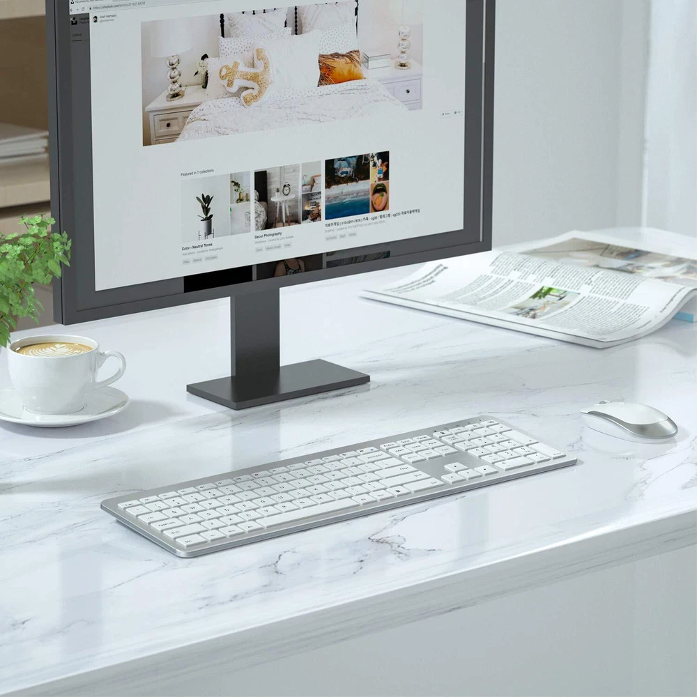 Rechargeable Keyboard & Mouse Combo -- Equipped with build-in Lithium battery for both the keyboard and mouse, can be easily re-charged with the included charging cable. The keyboard mouse can work up to 1-2 months with one full charge 1 USB Plug for Both Keyboard and Mouse -- This keyboard & mouse combo using only 1 USB plug, which is inserted on the back of the Mouse. Stable 2.4GHz wireless provides a powerful, reliable connection up to 33ft without any lags Sleek & Modern Looking and Easy to Set Up -- Flat thin keyboard mouse with a modern silver & white combination of color. Super easy installation, all you have to do is plug the USB receiver and then give them seconds to install automatically Full Sized Keyboard Yet Extremely Lightweight -- Full-size keyboard with convenient media keys and number pads, provides everything you need at your fingers, yet extremely lightweight makes it just the right choice for home office space saving or traveling use Comfortable to Use and Extremely Quiet -- The low profile keys makes it comfortable to use for extended periods of time, and it’s even more quiet than non-mechanical keyboard or laptop keyboard, we won’t all it “Whisper”, but you can barely hear it while typing