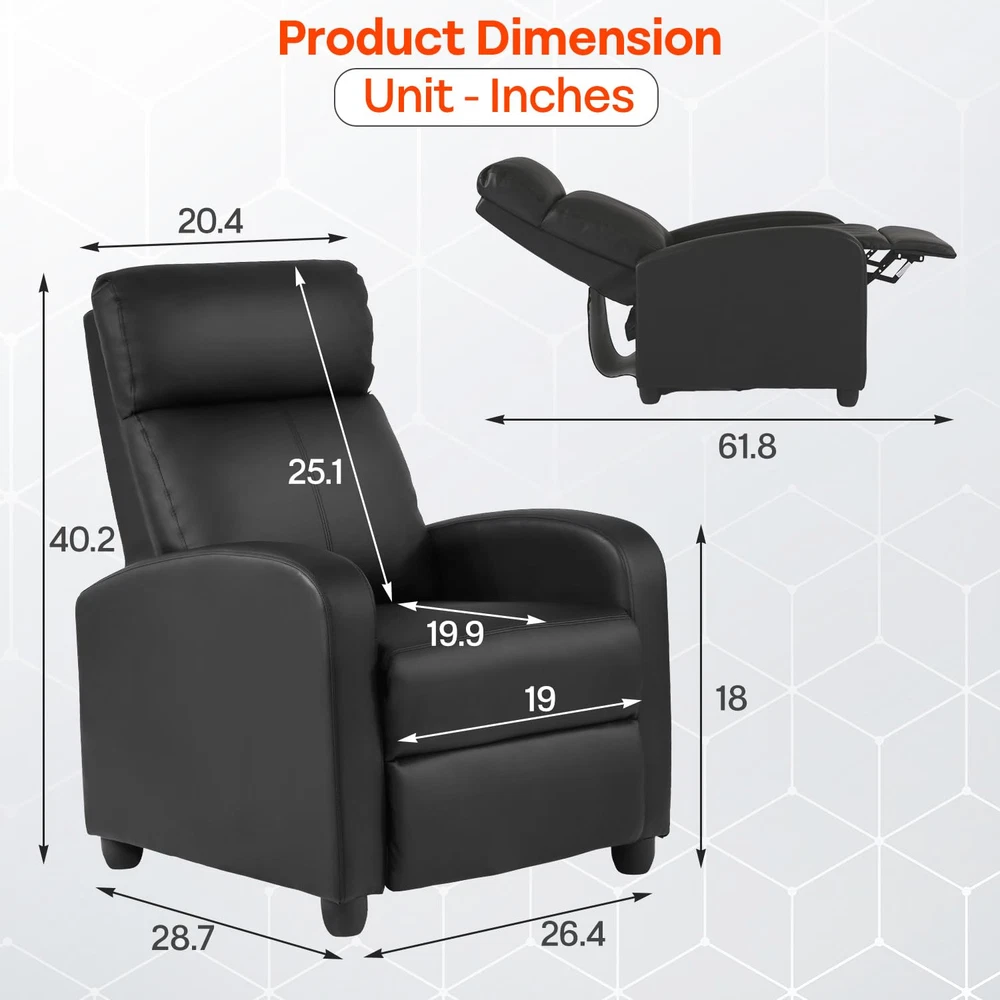 👍【THE MASSAGE MODE】Recliner Chair give you 8 mode for the massage function. This recliner chair also provided 3 intensity for your best relax. This lumbar support recliner has 2 point massage technology at waist area. Recliner Chair Massage Chair Recliner for Living Room Recliner for Bedroom Single Sofa 👍【Comfort and Luxury design】This upholstered recliner chair provides a comfortable seating experience, and has a modern and sophisticated design. This recliner chair for living room has an ergonomic design that features a pillow headrest, soft armrests, and a liftable footrest. Massage Recliner Recliner for living room chair for bedroom recliner sofa 👍【Push Back Adjustable Recliner and Ultimate Relaxation】This recliner chair uses a push-back adjustment method, and you can sit and push back in your way. Multiple relaxation modes in this reclining chair can support your body fully, it features 90 to 160 degree adjustment upholstered recliner chair backrest and lifting footrest to provide an ultimate relaxation mood and sensuality. Recliner sofa Single recliner chair Home theatre chair club chair 👍【Easy Cleaning and Durable Material】This recliner chair is Made of Premium-Quality PU Leather. It is water and stain-resistant and has an elegant and luxurious appearance. Just a swipe with a damp cloth and mild cleanser, if spilling drink on this recliner chair for living room. Besides, it features that high-density filling sponge, a high-quality rebound spring package, high quality environmental protection cotton, and this recliner chair legs and frame are made of engineered from solid hardwood to ensure durability and stability. So, our reclining chair bearing capacity of 275 lbs. reclining chair recliner single sofa club chair 👍【Quick installation】This recliner chair only takes 2 minutes to assemble. This reclining chair is easy assemble and no tools needed for assemble. Just slip the reclining chair back onto the base and screw four reclining chair legs, then your single recliner sofa is completed for setting at living room, bedroom, or other place. club chair recliner chair single sofa recliner chair for living room