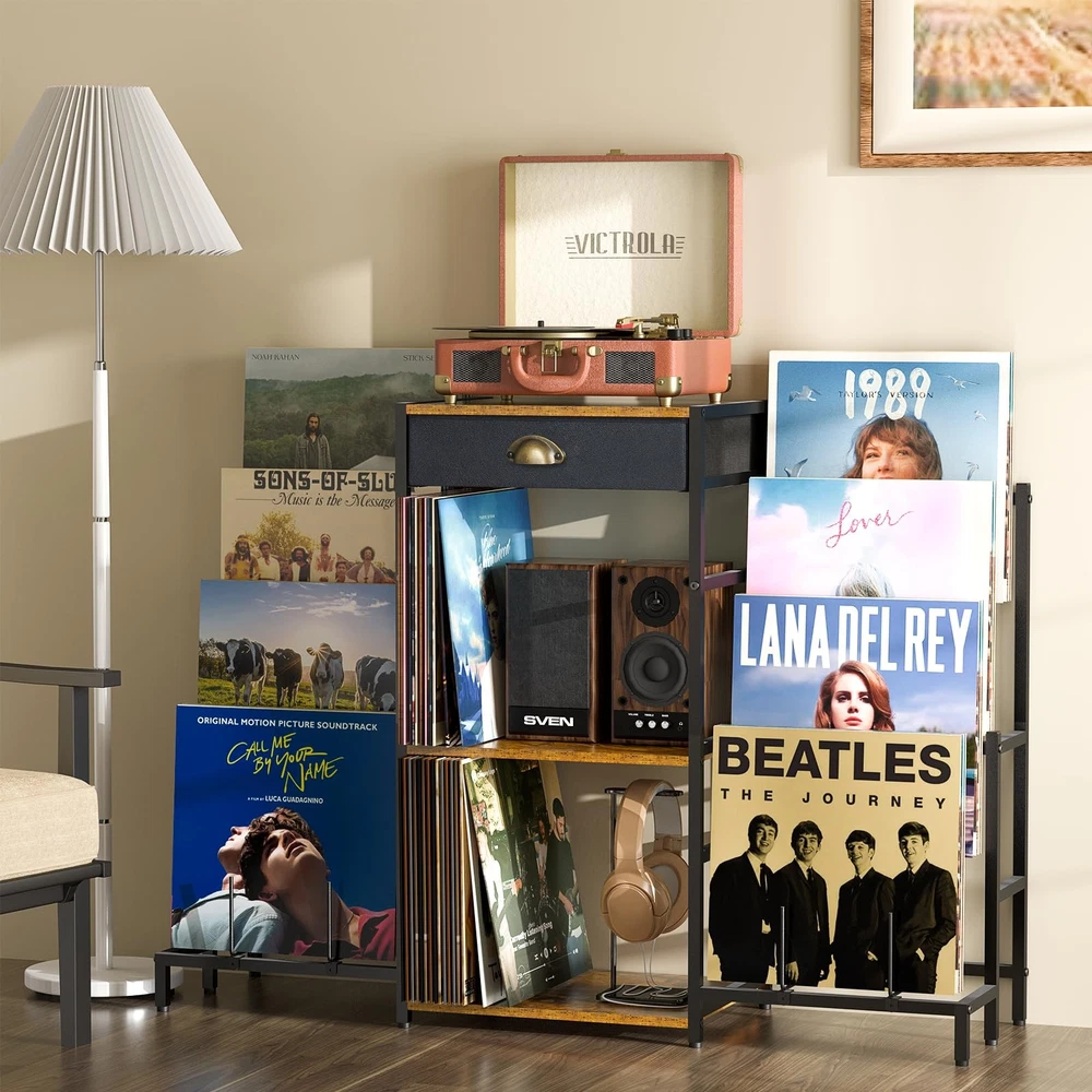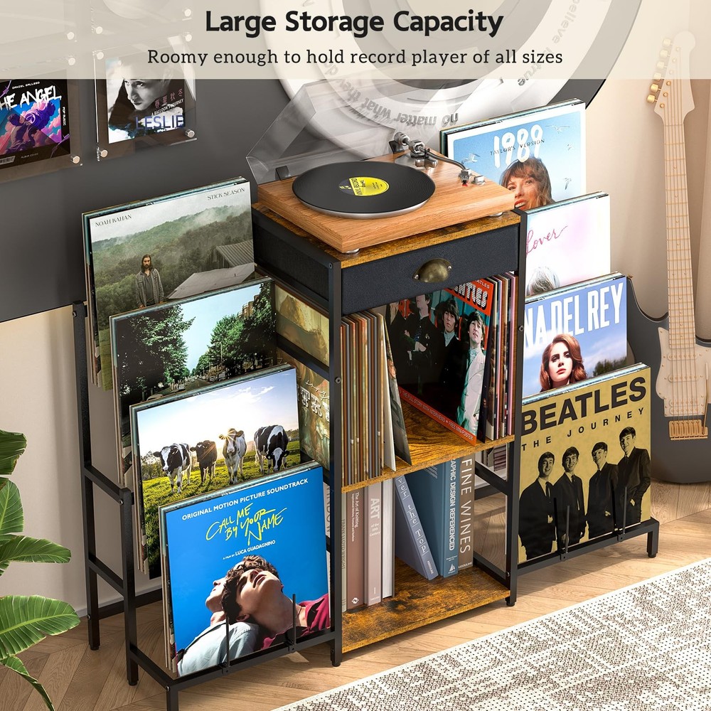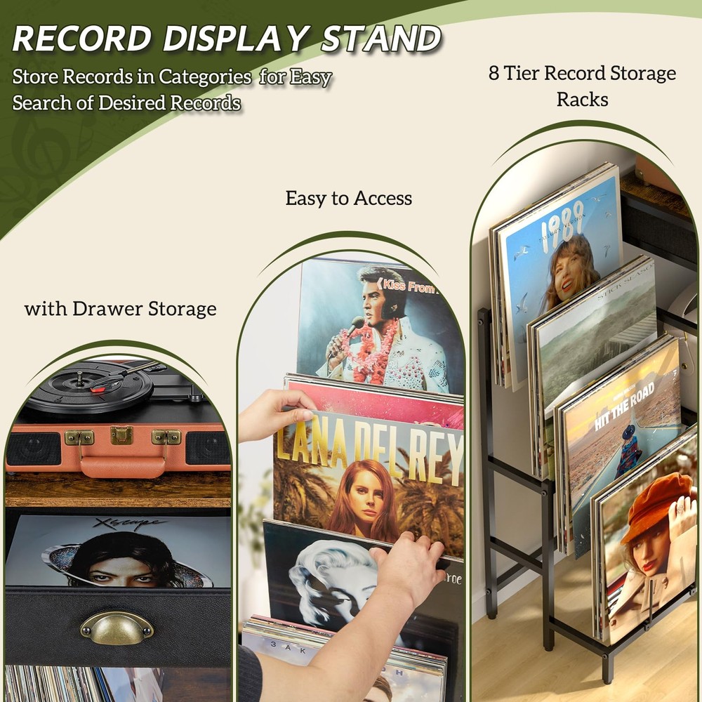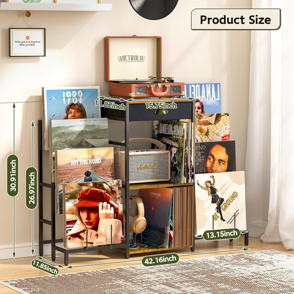 Record Player Stand with Vinyl Storage, Vinyl Record Stand with 8-Tier Display Holder, Record Stand Storage Up to 200 Albums, Large Vinyl Record Display Shelf, Tuntable Stand for Living Room 🎵 Large Capacity - Our record player stand features 3 levels of storage cabinets with drawers and 8 tier record display racks. This turntable stand can hold up to 200 vinyl records, which provides plenty of space to your cherished vinyl collection. Desktop :15.75 inches (L)x 11.82 inches (W) 🎵 Sturdy and Durable - Crafted from solid wood, high-quality thickened iron, our record shelf guarantees strength and durability. We use premium materials to ensure that our record display stands are not only sturdy but also refined, providing you with a reliable and long-lasting solution. 🎵 Classified Display - Equipped with 8 layers of record stand, our shelf allows for easy organization and quick access to your vinyl albums. Made from high-quality iron, our side record display stands offer superior stability and durability compared to other fabric options, ensuring optimal protection for your valuable records. 🎵 Multi-Function Vinyl Holder - Our record rack isn't just for storing records and turntables; it's a versatile storage solution. It can also accommodate magazines, books, stereos, media devices, audio equipment, and collectibles, catering to all your diverse storage needs. 🎵 Easy to Assemble - Our record player cabinet comes with detailed installation instructions, making assembly a breeze. Each component is clearly numbered, and the illustrated steps guide you through the process. You can easily set it up on your own. If you have any questions regarding assembly or the shelf's quality, please . We provide support and solutions within 24 hours.