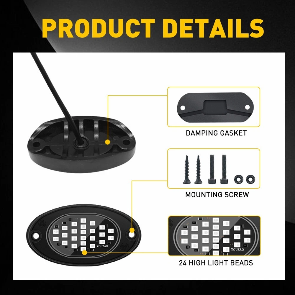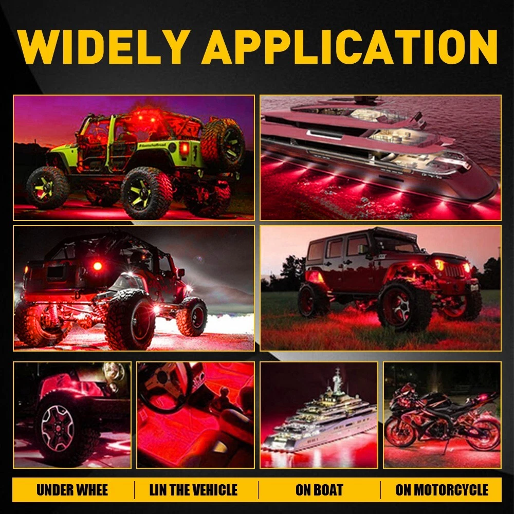 LED Car Underglow Lights Strip Universal Fits For SUV,Jeep,ATV,UTV,Truck,Motorcycle etc. Specification: LED Quantity:24 LED Color:Red Waterproof grade:IP68 Service life:50000h+ Connection: Red connects to positive Black connects to negative Features: IP68: IP68 waterproof, dust-proof & rust-proof construction, making you can drive it through any heavy rain or harsh snowy weather. We put the rock lights under the water for 3 hours consecutively to test its waterproofness.Please note that the controller without waterproof function do not expose it to outside. Premium material: Red 4 Pods LED Rock Lights For Jeep Offroad Boat Truck UTV ATV Underbody Lamp LED Car Underglow Lights Strip Universal Fits For SUV,Jeep,ATV,UTV,Truck,Motorcycle etc. Specification: LED Quantity:24 LED Color:Red Waterproof grade:IP68 Service life:50000h+ Connection: Red connects to positive Black connects to negative Features: IP68: IP68 waterproof, dust-proof & rust-proof construction, making you can drive it through any heavy rain or harsh snowy weather. We put the rock lights under the water for 3 hours consecutively to test its waterproofness.Please note that the controller without waterproof function do not expose it to outside. Premium material: The strip can be bent, fold and fixed in place easily, perfect for under wheel arches, around the front grille, under foot wells, in the trunk, along the dash, etc. Safety The high brightness of the light can disperse animals and avoid collisions ,enhance the visibility at night, foggy days,rainy days and fuzzy roads, providing a safe distance for pedestrains and other jeeps. It looks cool and attractive, which is easier for the owner to find their vehicle during the night. Packaging included: 4X LED light strip 1X Installation Kit What makes you choose our products? Rapid logistics and response: We will dispatch your order within one work day since your payment to guarantee that you can receive your order immediately. High quality: The raw materials are strictly inspected high-quality ones. In addition, our inspectors will inspect all the products again before they are dispatched to guarantee all customers receive good products. Guaranteed after sales service: We provide quality guarantee services 2 year. Any customer can contact us for any problem during the period. We provide after sales services within one work day. High cost performance: Providing products with high cost performance is our lasting objective. Our products may not be the cheapest or expensive ones, but they must be the ones with the optimal cost performance. In general,you can enjoy reliable quality, speedy service along with competitive price. Your satisfaction is my goal.My customer service is not only the guarantee of money,but also the guarantee for your time and expectation. Item Specifics Brand AUXITO Type LED Rock Light Features Durable, Easy Installation, High Brightness, Waterproof Manufacturer Part Number 4x Red LED Rock Lights Voltage 12V Light Color Red Applicable regions For all truck, pickup, car, offroad, ATV, UTV, SUV, motorcycle Features 2 IP68 Waterproof Number of Bulbs 24 LED/pod To Fit Underglow Lights Fitment Type Direct Replacement Remote Control No Lighting Technology LED Universal Fitment Yes Placement on Vehicle Underbody, Wheel Manufacturer Warranty 2 Years Features 1 DOT-Certified, Durable, Dustproof, Easy Installation Items Included Cable Ties, Fuse, Mounting Hardware, Remote Control, Switch Mounting Style Screw-On, Self-Adhesive Fitment 3 For Polaris RZR Can-am, for Yamaha, Honda kawasaki Fitment 4 For Jeep Wrangler JK JL TJ YJ CJ LJ Fitment 5 For Jeep Jeep Cherokee KL XJ ZJ Fitment 6 For Ford F150, F250 F350 F450 F550 Super Duty Fitment 7 For Dodge Ram 1500 2500 Fitment 8 For Chevrolet Silverado 1500 2500 Fitment 9 For 4 wheeler, Quad, Dune Buggy, Sand Rails, Mining Rig Warranty 3 Year FAQ ♥ If you have a decoding problem or any other problems, please contact us first, we will help you with it. We will reply you within 24 hours in working days. I'm a new seller, thanks a lot for your trust and convince! I will serve you with all my heart. ♥ Q1: Will this bulb fit my vehicle? A: We can match almost any vehicle to one of our bulb sizes. eBay only lets us include some vehicle fitments per listing, but if your vehicle does not show up on the compatibility table at the top of our listings, welcome you to contact us for free consulation before purchasing a product. Q2: My item has not arrived, what's taking so long? A: Sometimes items take longer than expected, especially if it’s going far or to rural area. Check with your post office to see if your item has been held up. Sometimes Royal Mail will not update a tracking number until it has arrived at its destination. If your item still don't arrive after a few days, let us know so we can double check for you and help solve it asap. Q3: My bulbs won't fit, help! A: Special bulb holder may be required. See if you can take the holder from the stock bulb. If not, let us know. The bulb size may be wrong, double check the item you received with the item you ordered. Do you have an aftermarket lighting housing? These may not be perfectly fitted for aftermarket bulbs and will require some manual modifications. Q4: Neither side lighting up? Both sides flicker, hyper flash, or work inconsistantly. A:Check the light fuses, and then check the ballast plugs to insure correct installation. If this doesn't work, there may be a voltage problem with the vehicle. You probably just need a relay or capacitor. Even though some bulbs are builtin resistors, they may still need a decoder. Pay & Ship (1). We gladly accepts payment via PayPal, We will ship your item(s) within 24 hours. (2). Before payment, please keep the consistency of Paypal address and ebay address. (3). Quantity orders are welcome! Returns (1). We offer 60 days free return policy. Please contact us within 60 days from the date you receive your order if you have any issues with