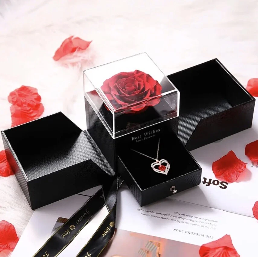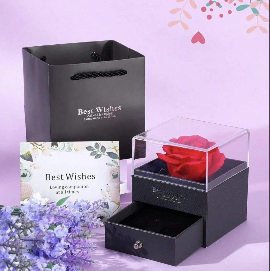 The Red Acrylic Soap Rose Gift Box is a romantic and thoughtful gift for a loved one. This preserved flower arrangement comes in a black 11x10x11cm acrylic box, making it a lasting and beautiful addition to any home decor. The set includes a gift bag and a best wishes card, adding a personal touch to the gift-giving experience. Perfect for all occasions, this artificial rose arrangement is a unique way to express love and appreciation to someone special. Designed with both beauty and practicality in mind, the acrylic box features flaps that open and close, allowing for easy access while keeping the preserved roses protected. This Product Does Not Included The Jewelry.