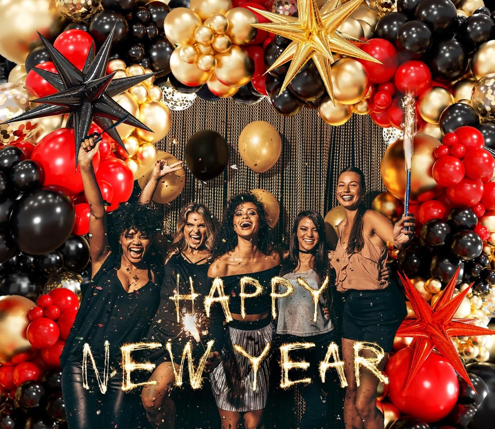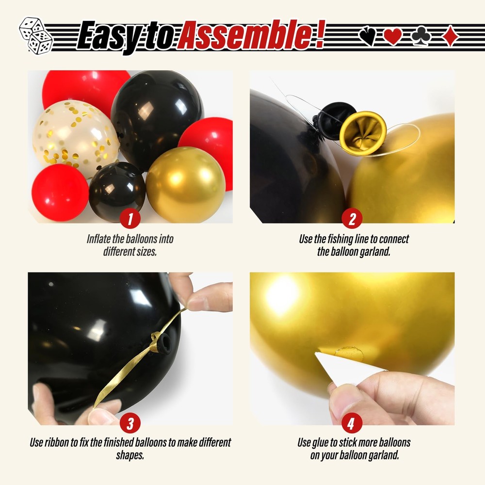 135pcs Red Black and Gold Balloons Arch Garland Kit with Star Foil Balloons for Anniversary Wedding New Year Birthday Party Decorations Package Include: The 135pcs red black and gold balloon garland kit included 51pcs black balloons(1pcs 18inch, 10pcs 12inch, 15pcs 10inch, 25pcs 5inch), 46pcs red balloons(1pcs 18inch, 10pcs 12inch, 15pcs 10inch, 20pcs 5inch), 27pcs metallic gold balloons(2pcs 18inch, 5pcs 10inch, 20pcs 5inch), 5pcs 12inch gold confetti balloons, 22inch red star balloon x1, 22inch black star balloon x1, 22inch gold star balloon x1, 32 feet ribbonx1, glue dotsx100, decorative stripx1 Great Quality: These red black gold party decorations are unlikely to burst, ensuring safe use for you. The red black gold decor can be filled with air or helium, and we recommend using a balloon pump for quick inflation, but don't blow the balloon too full to maintain a perfect shape as long as possible Easy to Use: We provide three tools to help you create balloon arch more easily, including ribbon, dot glue, and decorative strip. First, inflate the different sizes balloons and tie the balloon knots together with decorative strip. Second, stick the balloon garland on a party background with ribbon. Finally, use dot glue to stick 5 inch balloons onto the balloon arch to fill in the gaps Suitable for Many Occasions: The red black and gold balloon garland kit great for 30th 40th 50th 60th birthday decorations, baby shower decorations, wedding decorations, anniversary balloons, bachelorette party decorations, las vegas poker night decorations, casino night decorations, hollywood red carpet decorations, new years decorations, movie night decorations Warm Reminder: If you're not happy with the balloon arch kit for any reason,we will work hard to solve the problem until the problem is resolved. We're committed to providing you with great service and helping you create the great party atmosphere