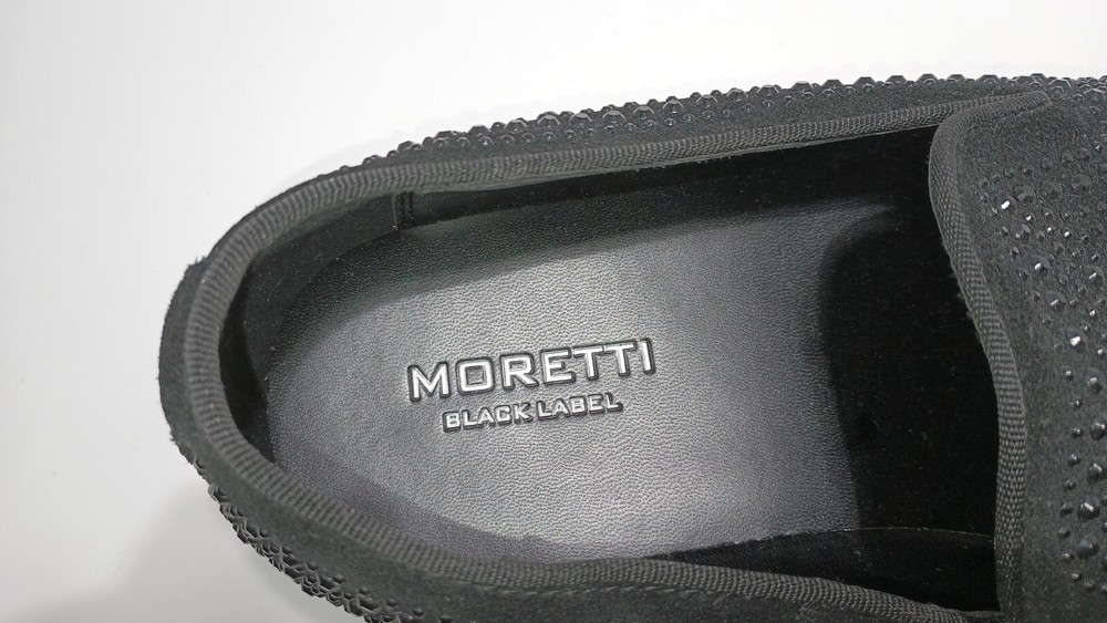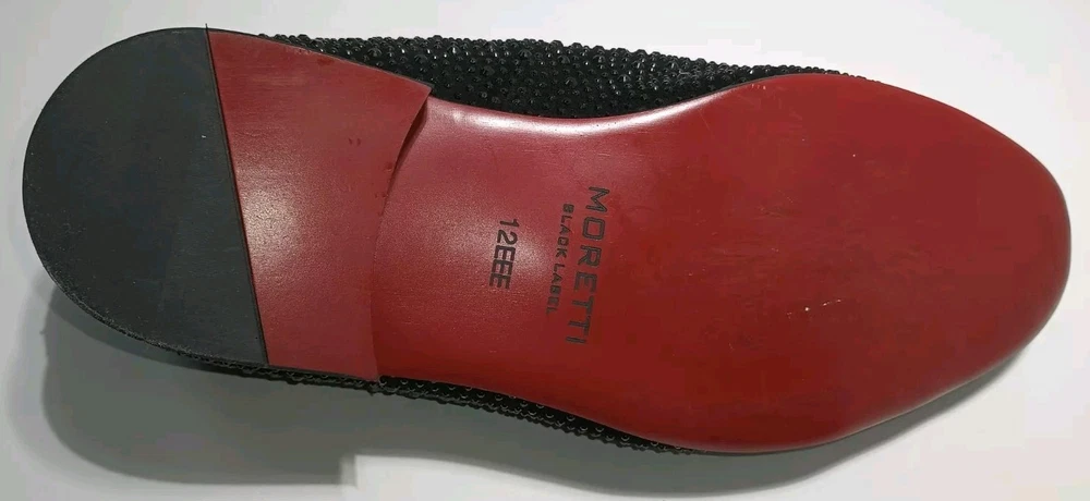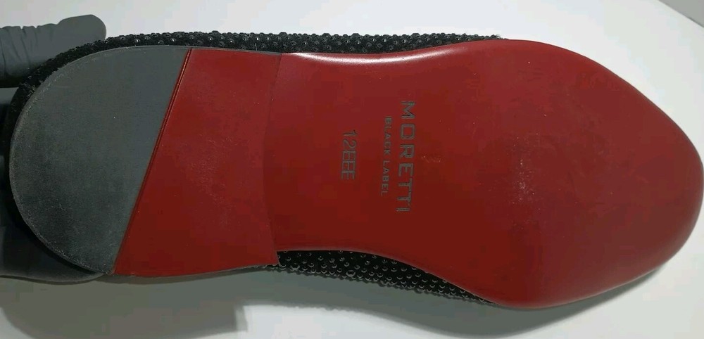 Elevate your style with these Moretti Black Label dress shoes. The sleek black leather upper material is adorned with sparkling rhinestone accents, adding a touch of glamour to any outfit. These shoes are designed for men with a US shoe size of 12 and an EEE shoe width, ensuring a comfortable fit. The red bottom sole adds an extra pop of color to these elegant shoes, making them perfect for any formal occasion. Whether you're attending a wedding or a business meeting, these Moretti Black Label shoes will impress.