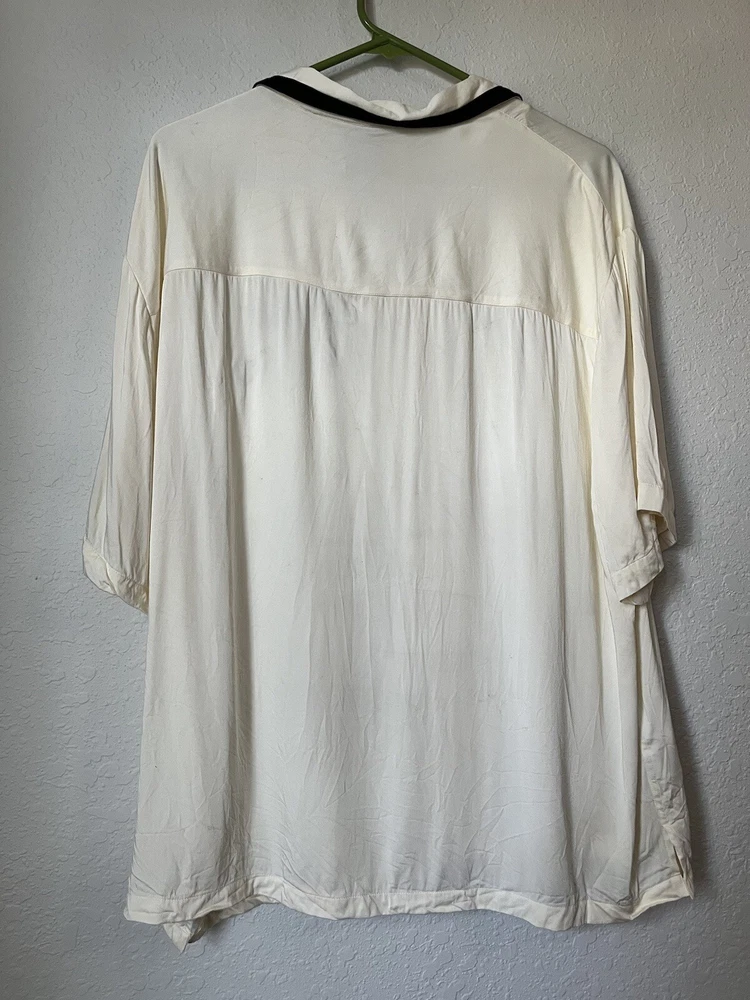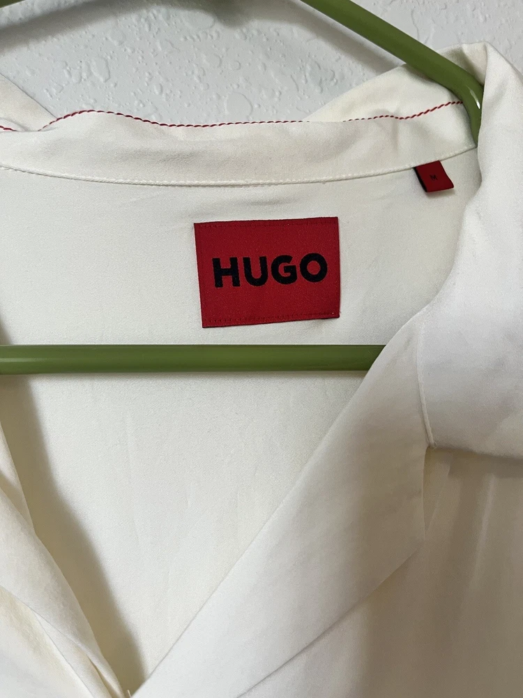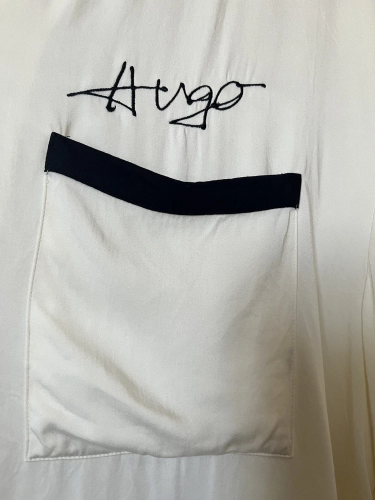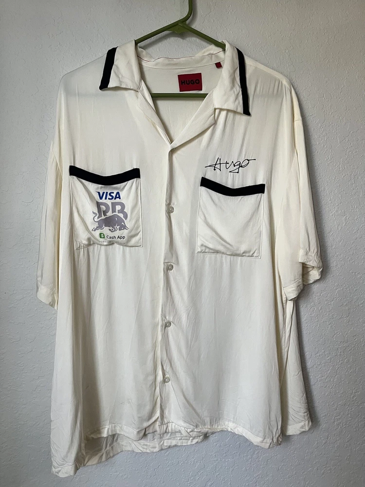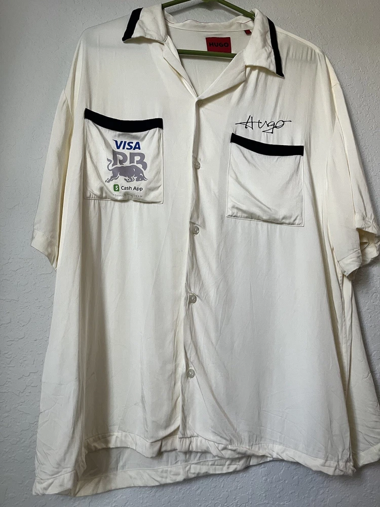 This Off White Hugo Boss button-up camp shirt features short sleeves and contrasting trim accents. The shirt is made of viscose material and has a button closure. It is perfect for men who want to look stylish and feel comfortable. The shirt is available in size M and is suitable for regular size types. The shirt is a casual button-down shirt that can be worn on any occasion. The fabric type is viscose, and the brand is Hugo Boss. The shirt is ideal for those who want to stand out and make a statement. NOTE: this shirt has a sewn on “Red Bull Formula One Team” patch on the left pocket