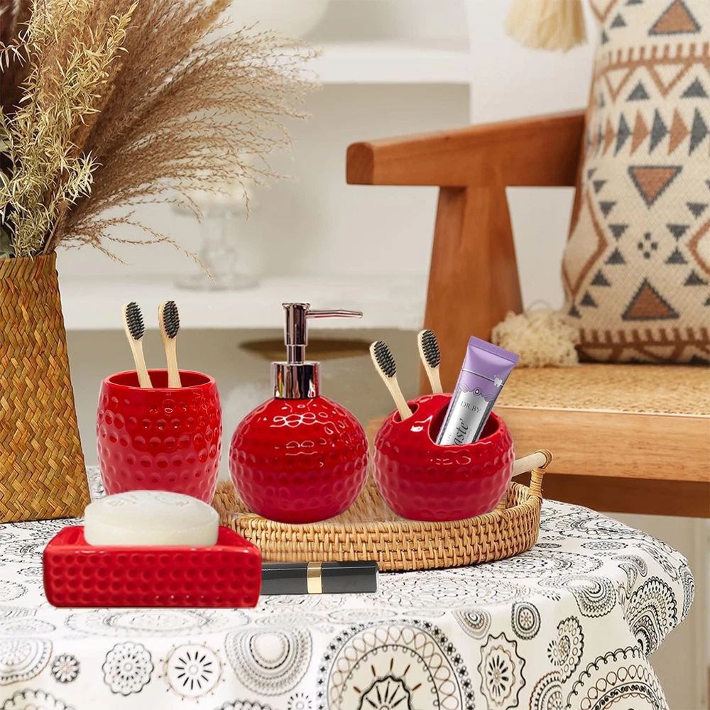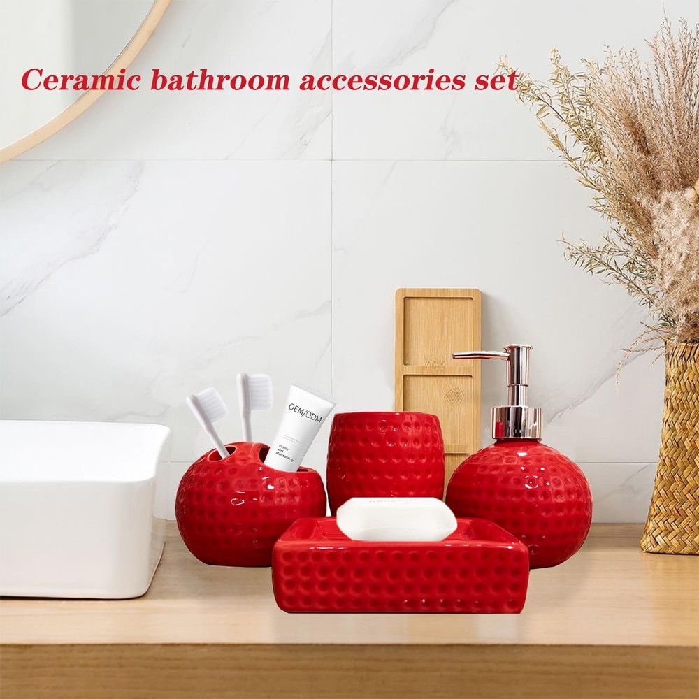 This 4-piece ceramic bathroom accessory set features a fashionable yellow finish, adding charm and fashion to your bathroom. It is not only a household item, but also the perfect gift for friends and family Product size: 1 soap dispenser (10X10X15cm/3.9X3.9X5.9in) 1 toothbrush holder (10X10cm/3.9X3.9in) Attention in offices and other occasions: 1. Due to differences in monitors, there may be slight color differences between the image and the actual product. Please understand. If you have any questions, please feel free to via at any time, and we will definitely take your issues seriously 【Red Bathroom Sets Accessories of 4 pieces】Includes 1 soap dispenser, 1 toothbrush holder, 1 bathroom cup and 1 soap dish to help you keep your bathroom sink neat and tidy and your bathroom organized. 【Ceramic Bathroom Decor Sets】This red ceramic bathroom accessories set is made of high quality ceramic through handcrafted and smooth glaze, adding fresh style to the counter or vanity and making your bathroom look more fashion. 【High quality Structure】Red soap dispenser has a high quality structure and unique and stylish design with a pressurized hand pump that won't break or leak, easy to clean and can last. 【Exquisite Bathroom Counter Set】The multifunctional bathroom sink set can not only bathroom supplies, but also makeup brushes and other utensils, making your bathroom desktop neater and also suitable for housewarming gifts.