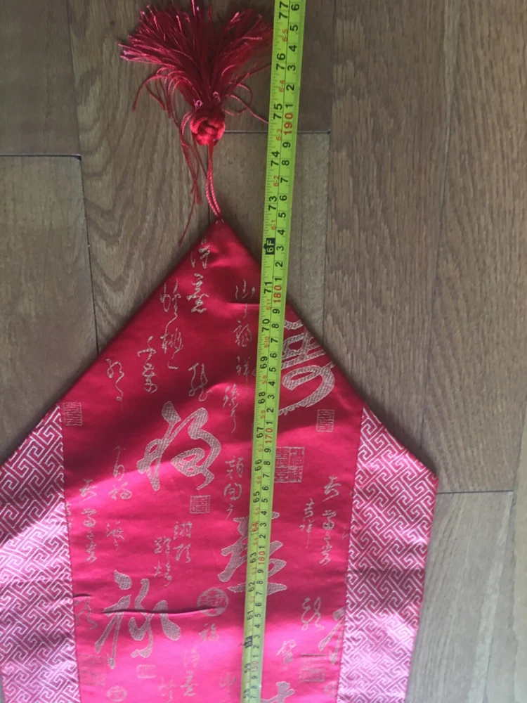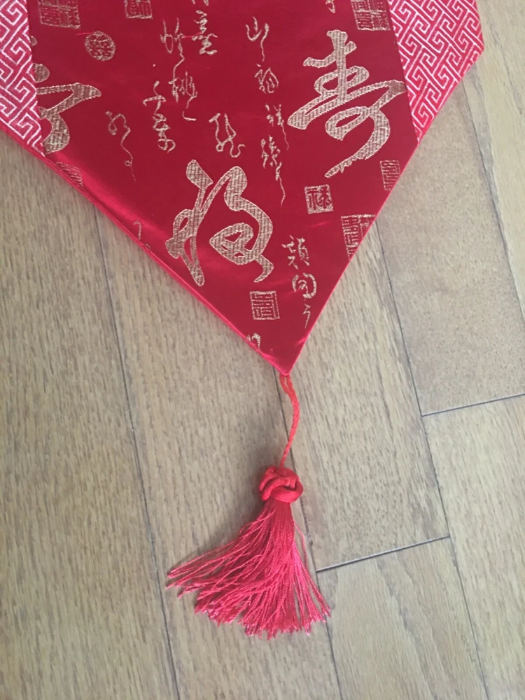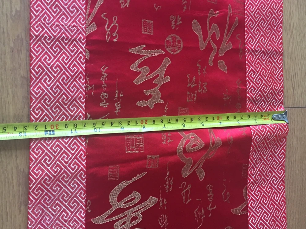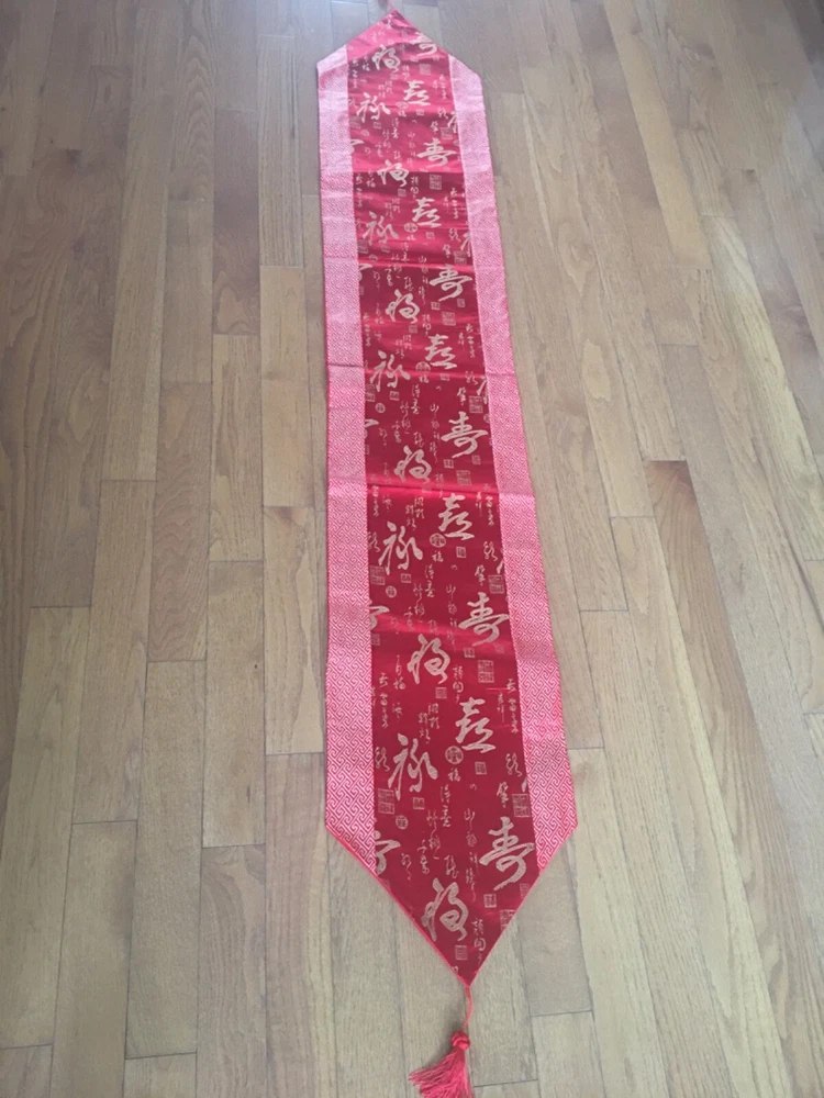 Red Chinese Silk Brocade Embroidery Table Runner With Tassels Chinese Characters Size: 72" x 12.25" Great shape. Some stain shown. Pleasesee picture for more details.. ||MSMM-HO- TO2307251794882REDRUNNER