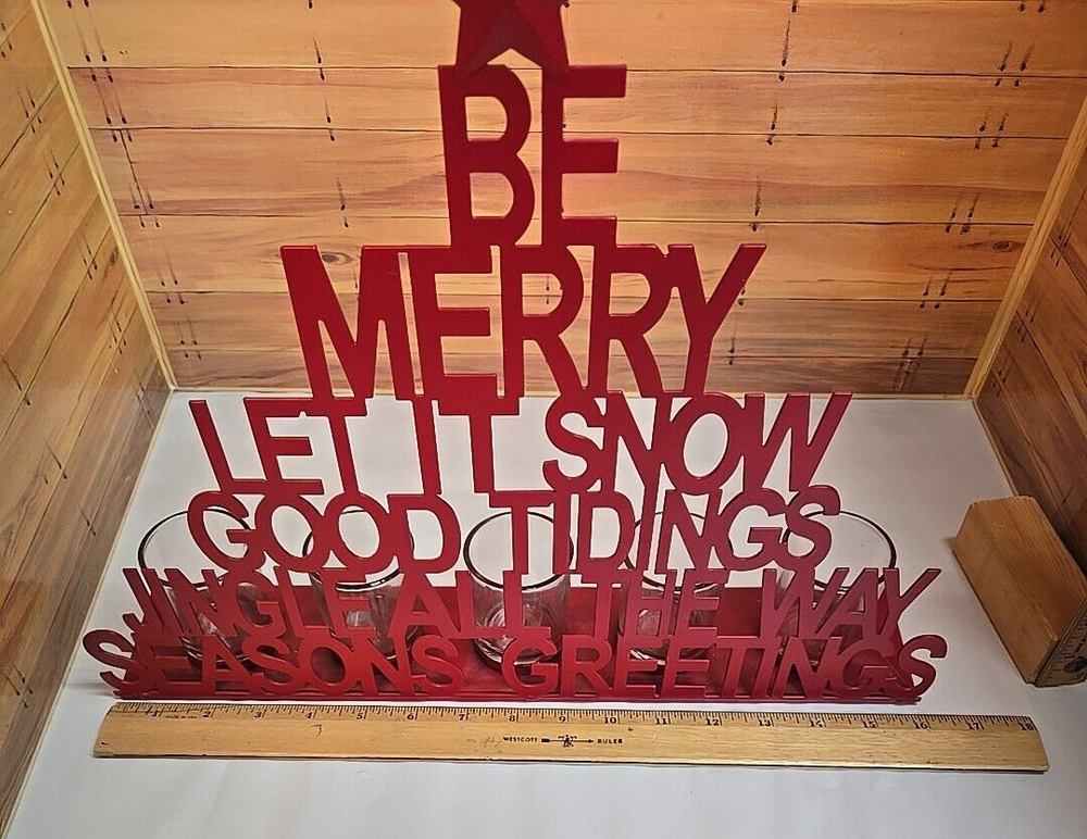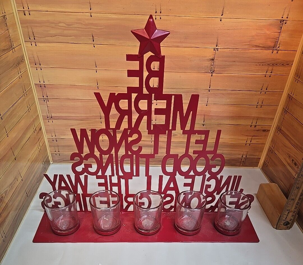 Christmas Seasonal Candle Votive; Five Candles; Red; 12" High x 16" Wide Star on Top Be Merry Let it Snow Good Tidings; Jingle All the Way Seasons Greetings Please message me if you have any questions prior to purchase. *Disclaimer* - we will deliver the item to the carrier within one business day of payment received. Once given to the carrier, we can only track the item using the tracking information that we will provide. We cannot guarantee that your item will be delivered as stated by the carrier on time as there may be shipping delays caused by the carrier. In addition, we are not responsible for packages stolen if the shipping indicates the package has been delivered.
