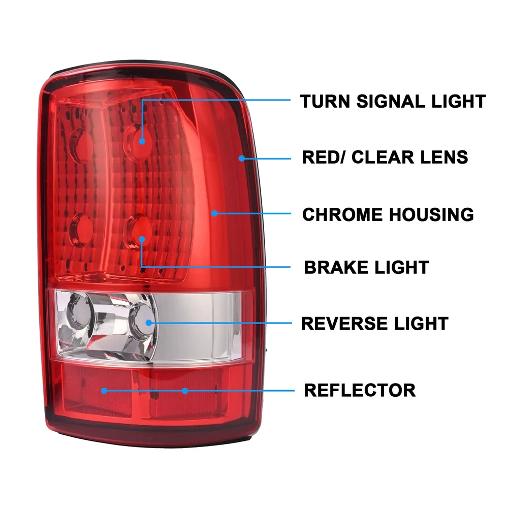 Red Clear Tail Lights Lamp Pair Fits Chevy GMC Suburban Tahoe Yukon XL 2000-2006 Specification : Condition: 100% Brand New Color: Red Clear Lens+Chrome Housing Material: Plastic Lighting technology: Halogen Placement on vehicle: Rear, Left, Right Warranty: Life Time Fitment Type: Direct Replacement Dust and Moisture Protection: Yes Features: 【High quality and durable】Our lens offer superior UV protection and a high impact resistance.Special Housing is Resistant to Water, Impact, And Corrosion, Long Lasting And Durable. 【Easy installation】This tail light is easy to install and can be screwed on. No need to worry about complicated installation process. 【Appearance Upgrade】 Enhance Incredibly Vehicle Visibility And Style, Improve Brightness & Safety. Fitment: For Chevy Suburban 1500/ 2500 2000-2006 For Chevrolet Tahoe 2000-2006 For GMC Yukon/ Yukon XL All Models Except For Barn Door 2000-2006 Replace for: GM2819199, GM2818199, GM2801170, GM2800170, 19168991, 19168990, 15832092, 15832091, 15224182, 15224181 Package Includes : 1 pair of tail lights (1 x driver's side & 1 x passenger's side) Installation Instruction Included Shipping: All items will be shipped out in 1 business day, no expedited service available. We ship our items to USA only(Does NOT include Hawaii, Alaska or Puerto Rico, PO Boxes/APO's). Shipping Notes: We use multiple warehouses and will select the nearest warehouse for delivery according to your order address and our inventory, Thank you for your cooperation. Contact us: Any Questions, Just feel free to contact us on eBay. We will reply you in 24 hours. On Dec 12, 2024 at 19:51:38 PST, seller added the following information: