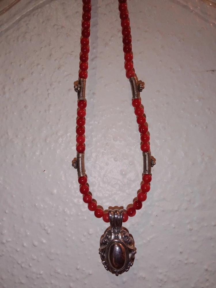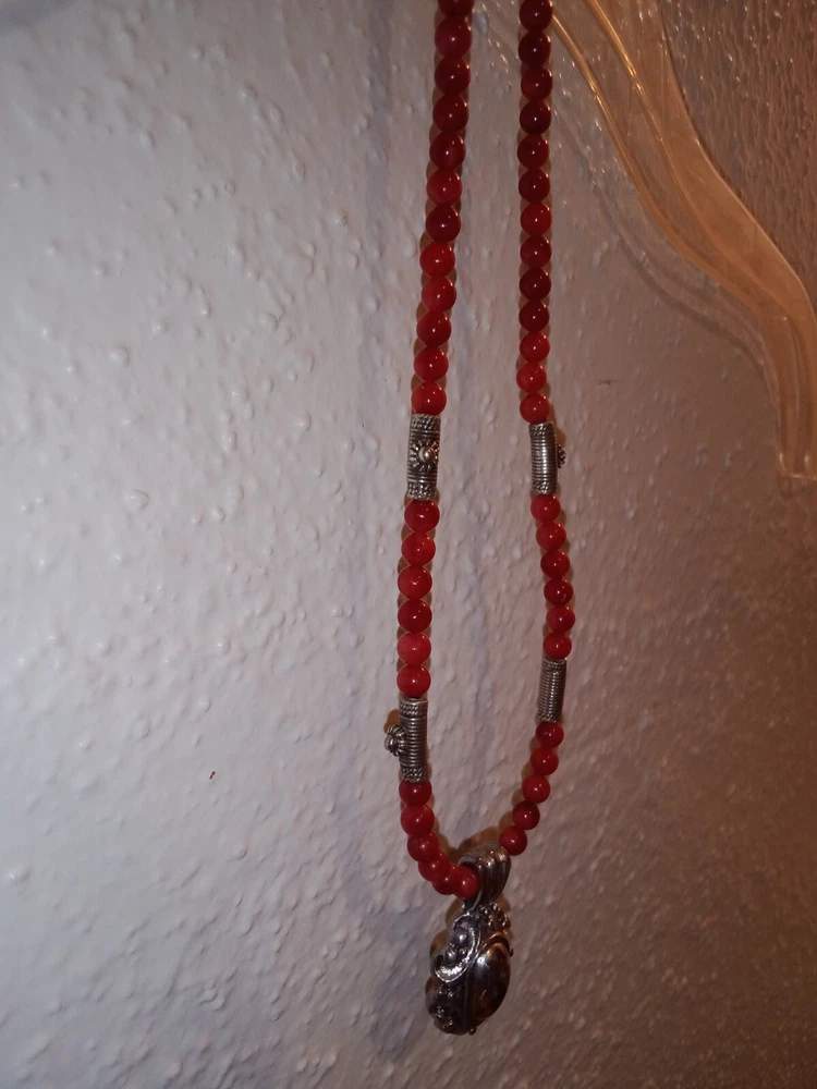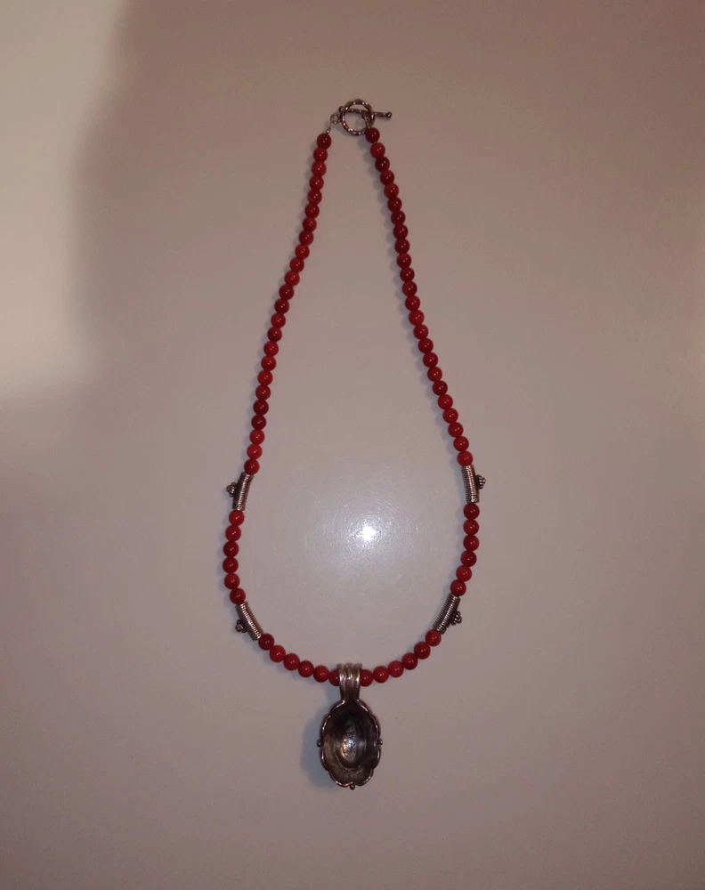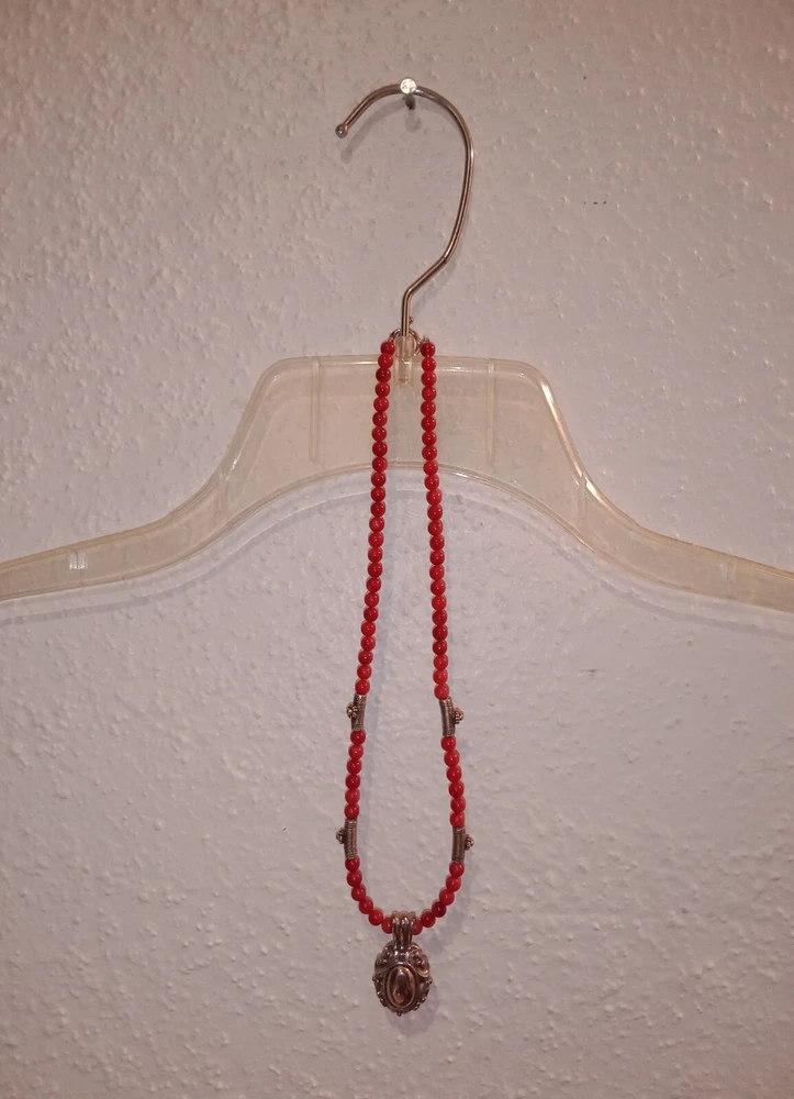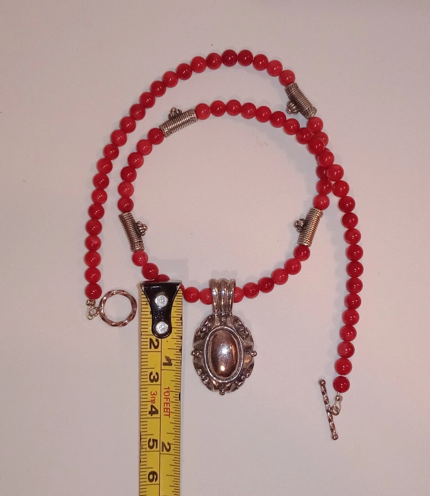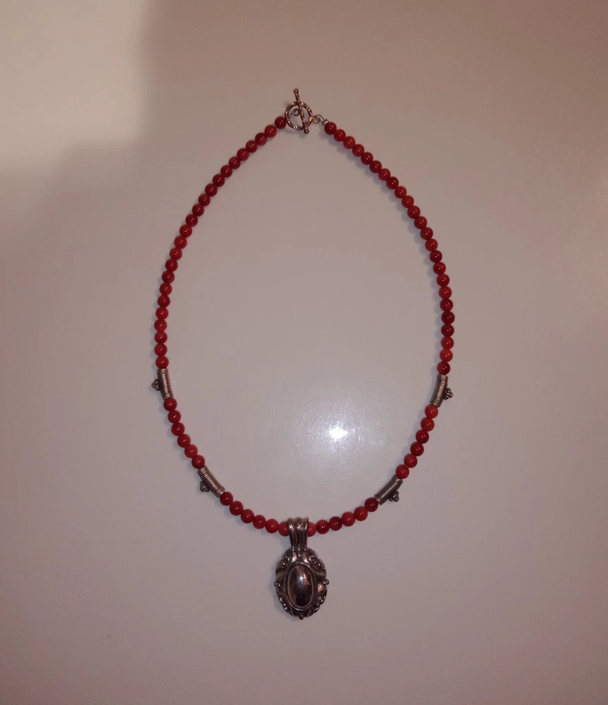 Red Coral Round Beaded Necklace /Choker w/ 925 Sterling Silver Beads & Pendant. Fine coral beads, approximately 3.5 - 4 mm, artisan handcrafted. Beautiful. Romantic, bohemian style. Excellent pre-owned condition. Seldomly worn, with no major flaws noted. Zoom in. See pics and approximate measurements. Smoke free, pet free household.... Please see my other quality items including designer handbags designer shoes designer vintage semi-precious jewelry apparel and home goods etc. Thanks for looking.