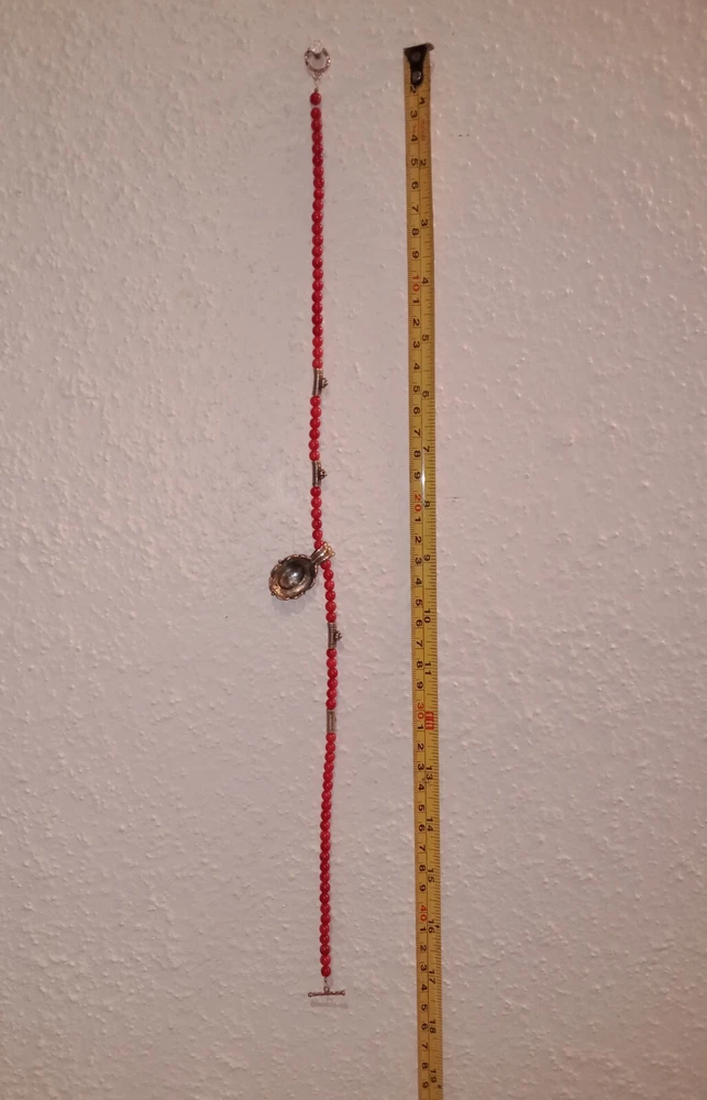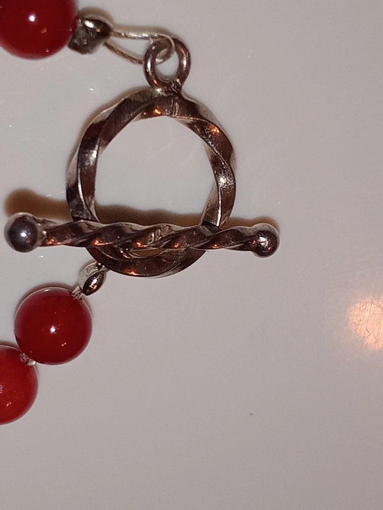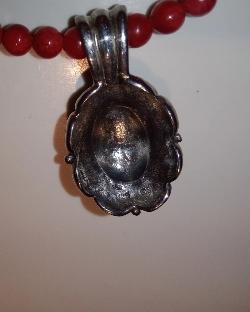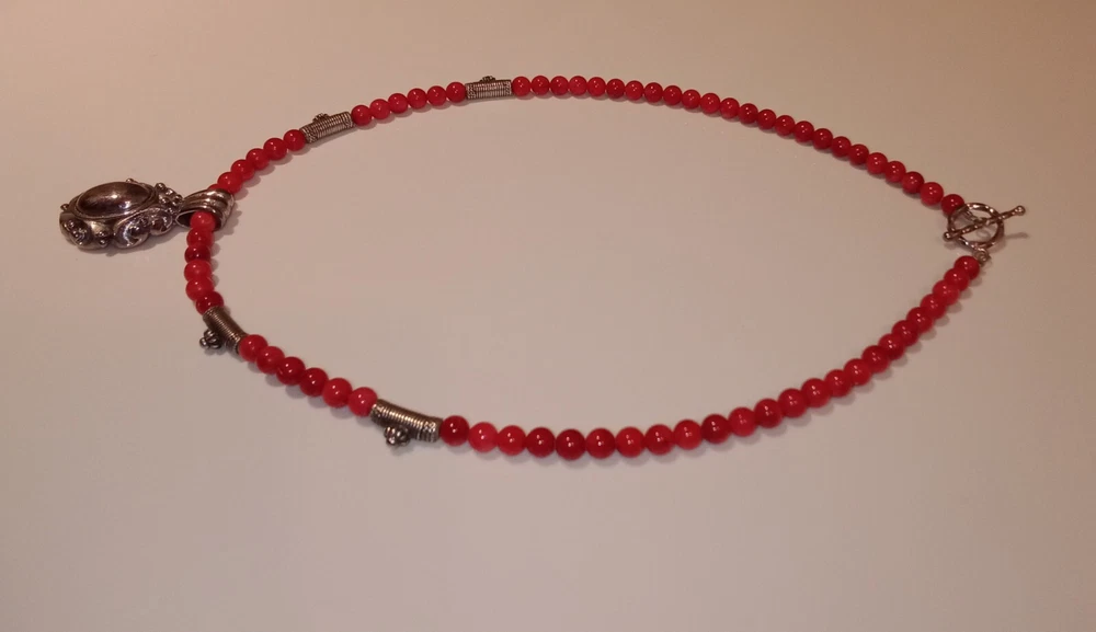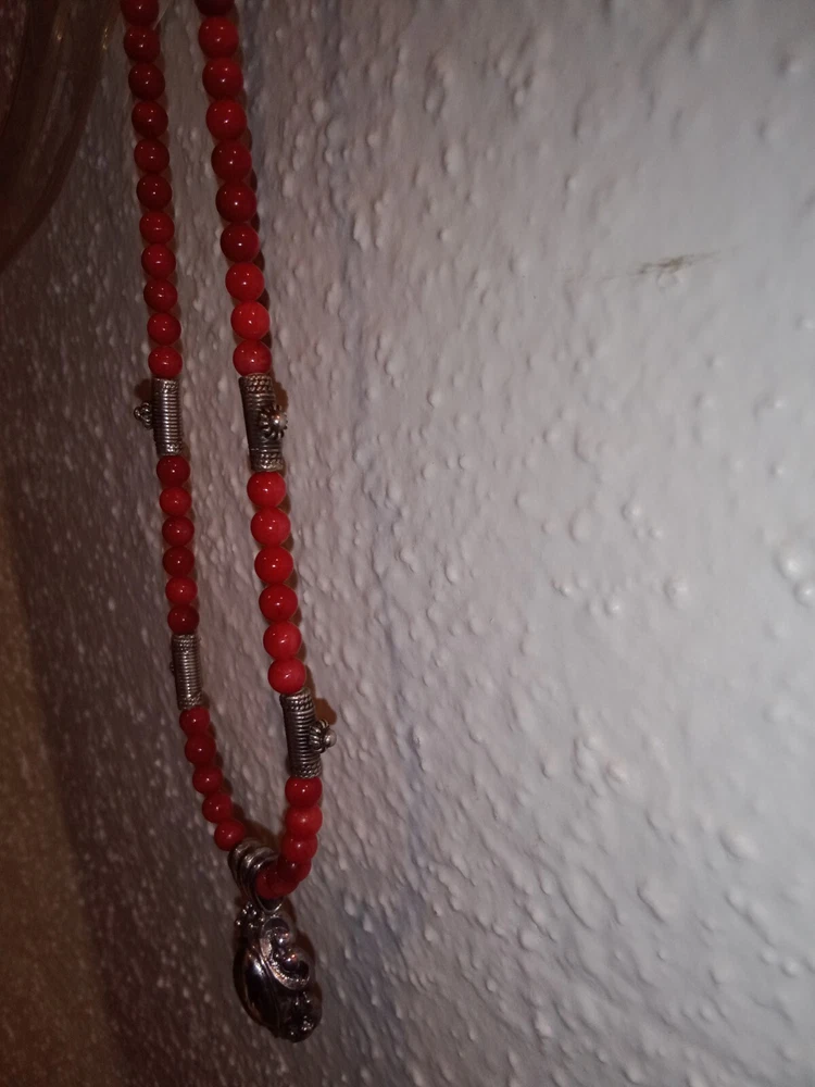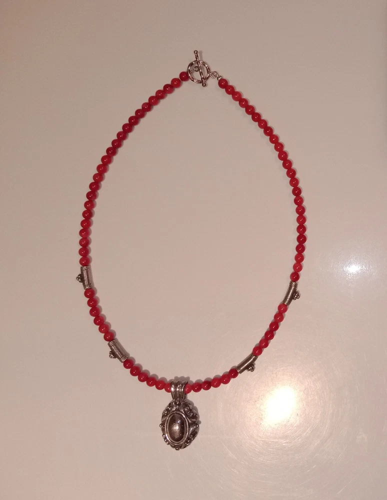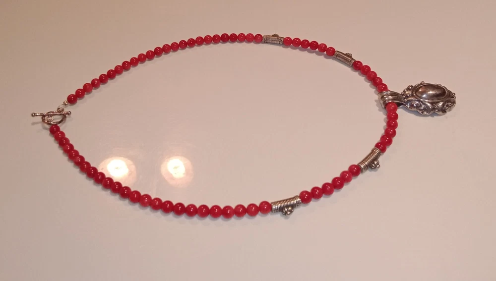 Red Coral Round Beaded Necklace /Choker w/ 925 Sterling Silver Beads & Pendant. Fine coral beads, approximately 3.5 - 4 mm, artisan handcrafted. Beautiful. Romantic, bohemian style. Excellent pre-owned condition. Seldomly worn, with no major flaws noted. Zoom in. See pics and approximate measurements. Smoke free, pet free household.... Please see my other quality items including designer handbags designer shoes designer vintage semi-precious jewelry apparel and home goods etc. Thanks for looking.