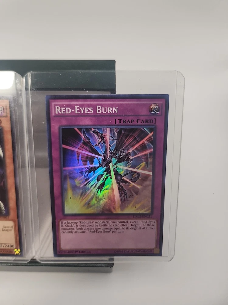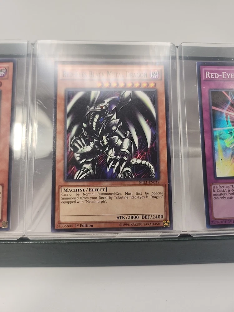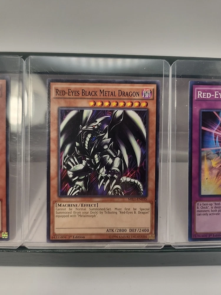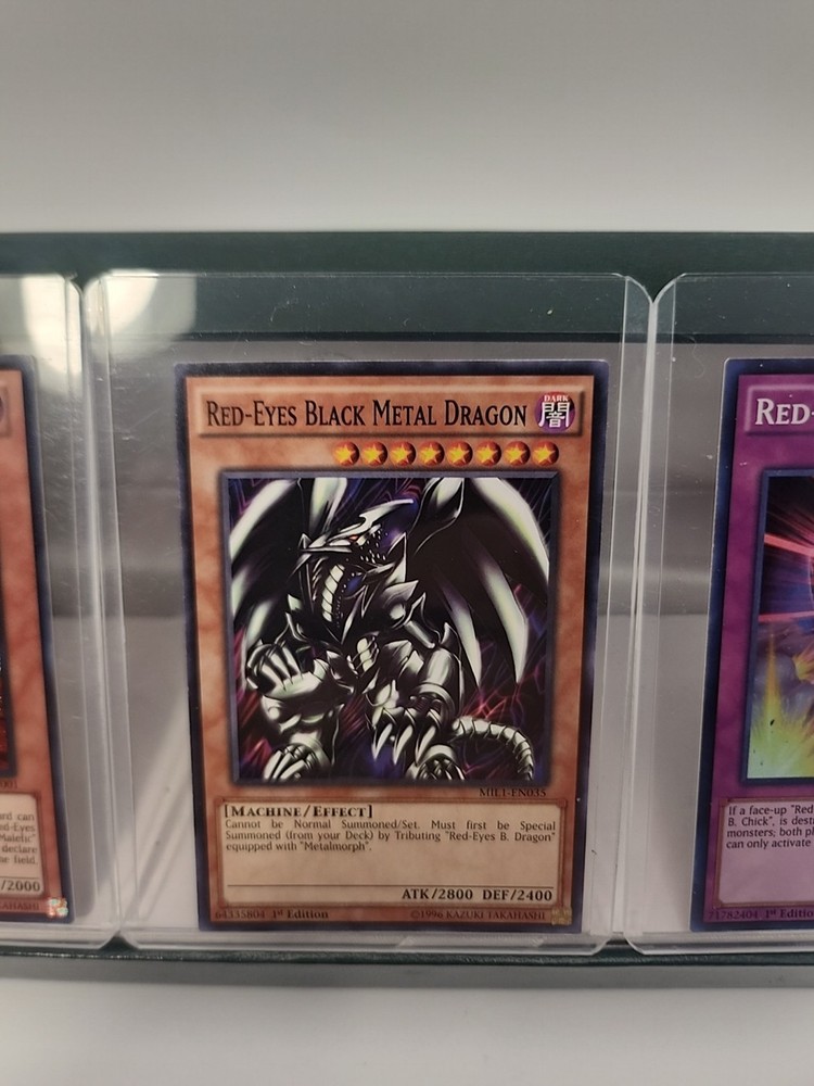 The "Red Eyes Lot 6 1st Editions" is a collection of 6 standard-sized Yu-Gi-Oh! trading cards from the Yugi set. These cards feature the color red and are in English language. Specifically designed for ages 6 and up, these cards are 1st Edition prints, making them highly sought after by collectors and players of the game. The included cards are of the Normal card type, perfect for adding to a player's deck or displaying as part of a collection.