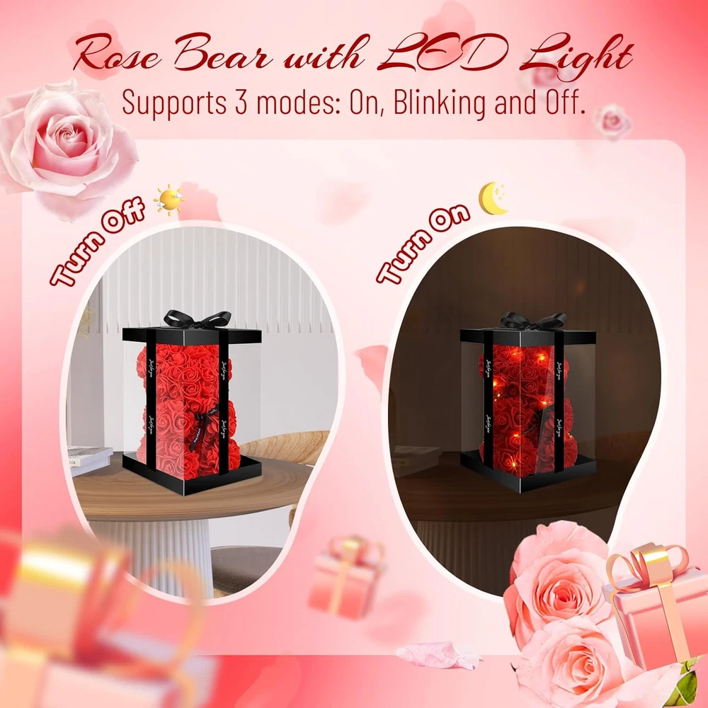 [Exquisite Creative Gifts] This 9 inches rose bear with LED lights and greeting card (self-fillable text) comes in an beautiful gift box, it's a great christmas/ valentine's day/ women's day/ mother's day/ anniversary/ birthday gifts for women (mom wife girlfriend), daughter, girls, kids [Cute and Handmade] Cute bear shape design, handmade from nearly 200 artificial roses flowers and placed in a highly transparent gift box to display the rose bear all around. Note: The protective film on the gift box can be removed for better lighting effects. [Flower Bear with Led Light] The 60-inch Led light cord is regular and hand-wrapped around the cute bear. When the light is turned on, the charming warm light radiates through the transparent gift box, which will amaze her, touch her and make her happy especially at night [As Home Room Decor] Except as her gifts, it is also perfect decoration for christmas, valentine's day in home bedroom office! It can be flexibly placed on dressers, ornamental shelves, bedside tables, desks, etc [Symbol of Eternity] Inside of the clear gift box is forever handmade artificial rose flower, it looks almost real, never fade, and represents love forever, also eternal family and friendship. Product Description Handmade Bear Rose Otlonpe 9-inch Rose Teddy Flower Bear is made of artificial flowers as the basic element to form a bear-shaped design, which is handmade from nearly 200 roses. Both intensely loving, very cute and romantic. Light Up Rose Bear in a Box Delicate Night Light Our flower bear comes with LED lights that glow charmingly at night. Decorations Gifts for Her Great Home Office Decor Gifts for women, flower bear can be perfect for her bedroom or office decoration. See it every day and bring her good mood. Nearly 200 Roses Handmade Flower Bear Bear rose is handmade with bear shapes and elements of love, which is the perfect gifts for women. With Gift Card Words of Love Comes with a sophisticated front and a blank back for customization, so you can fill in what you want to say to her! Beautiful Gift Box Rose Bear in Gift Box Highly translucent pvc material allows charming light to emanate from the inside of the box creating a romantic atmosphere. No need to purchase additional gift boxes. As women's gifts, please remove the protective film from the box. Daul Modes: Turn On or Turn Off 1 Valentines Gifts for Her 2 Anniversary Gift for Her 3 Birthday Gifts for Women 4 Mothers Day Gifts for Mom 5 Christmas Gifts for Women