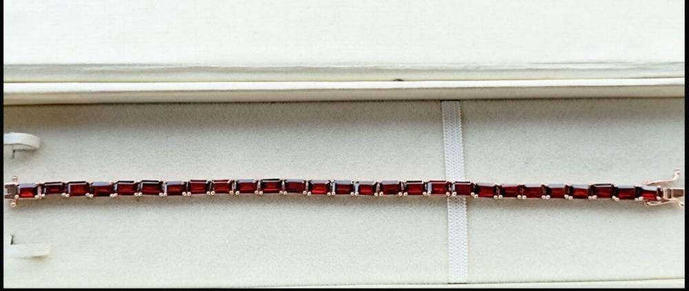 Elevate your jewelry collection with the Red Garnet Octagon Tennis Bracelet, a timeless piece that marries elegance with a touch of sparkle. Crafted with meticulous attention to detail, this 7-inch bracelet features a stunning array of 22 natural red garnets, each meticulously cut to enhance its emerald shape and set in a lustrous yellow gold over sterling silver that lends a warm, classic finish. The bracelet's curb link chain provides a comfortable fit, while the box closure ensures security on your wrist. Whether you're commemorating an anniversary or simply adding a dash of luxury to your everyday look, this nickel-free, handmade bracelet is a versatile accessory that promises to be a cherished addition to any ensemble.