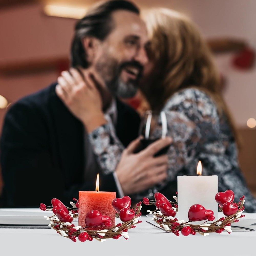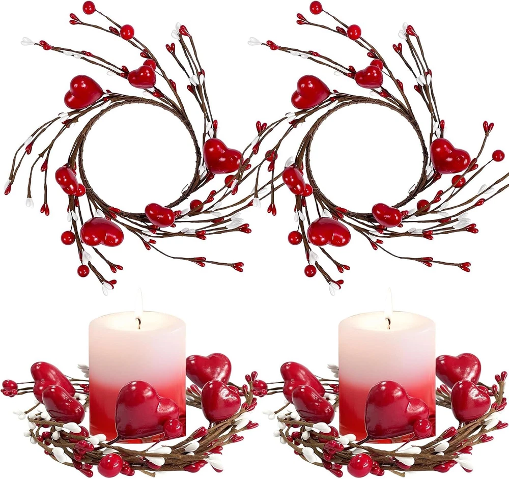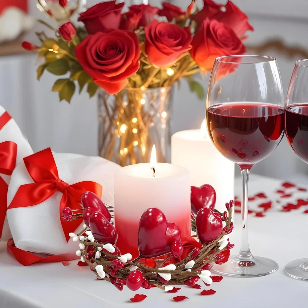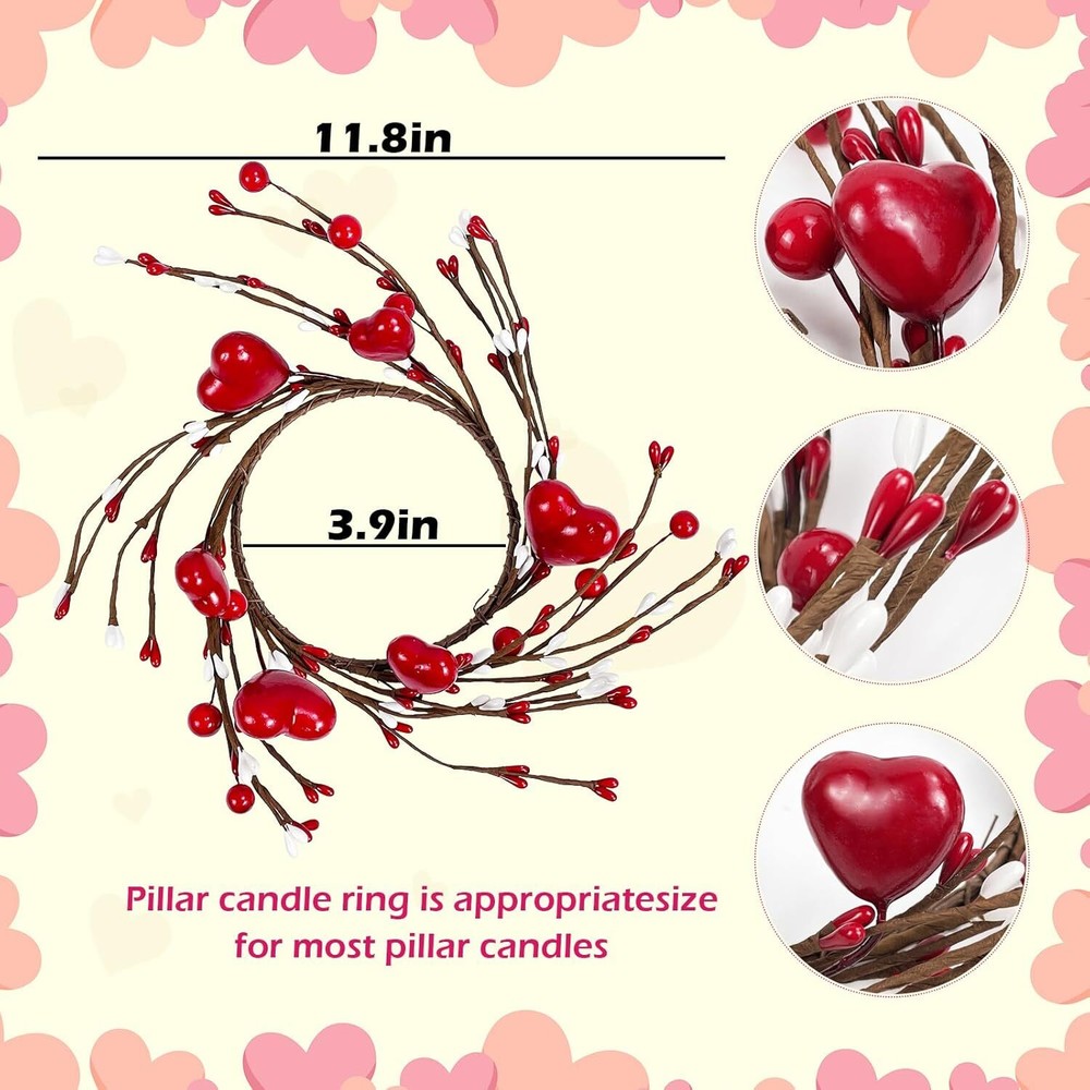 9.5" Woven Thread Heart-Shaped Candle Ring Wreath Core Parameters Material: Foam hearts/berries, woven thread branches, floral tape Size: Inner diameter 3.9" (9.9cm), Overall diameter 9.5" (24.1cm) Color: Bright red hearts with burgundy berries Technical Specifications • Includes 2 adjustable wreaths with bendable wire branches • Heart-shaped design with faux red berries for romantic decor • Suitable for pillar candles (3.9" inner diameter) or hanging • Flexible branches allow custom shaping and fluffing • Multi-purpose: Valentine's Day, weddings, home decoration Package Information Package Dimensions: Not specified Contents: 2 candle ring wreaths