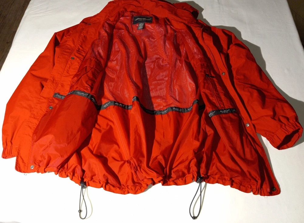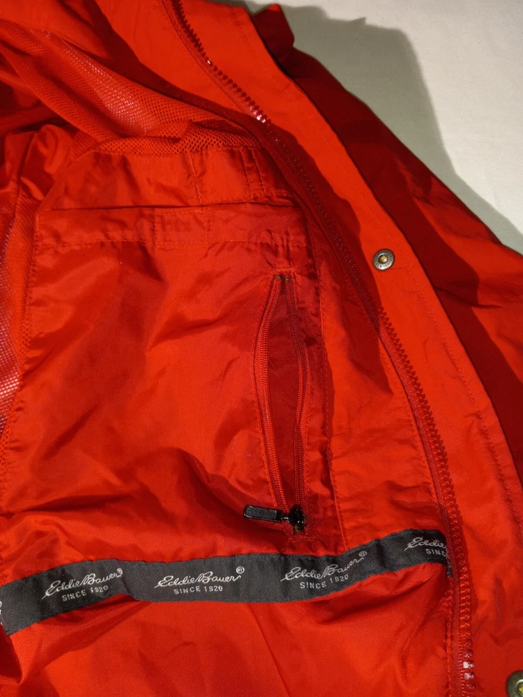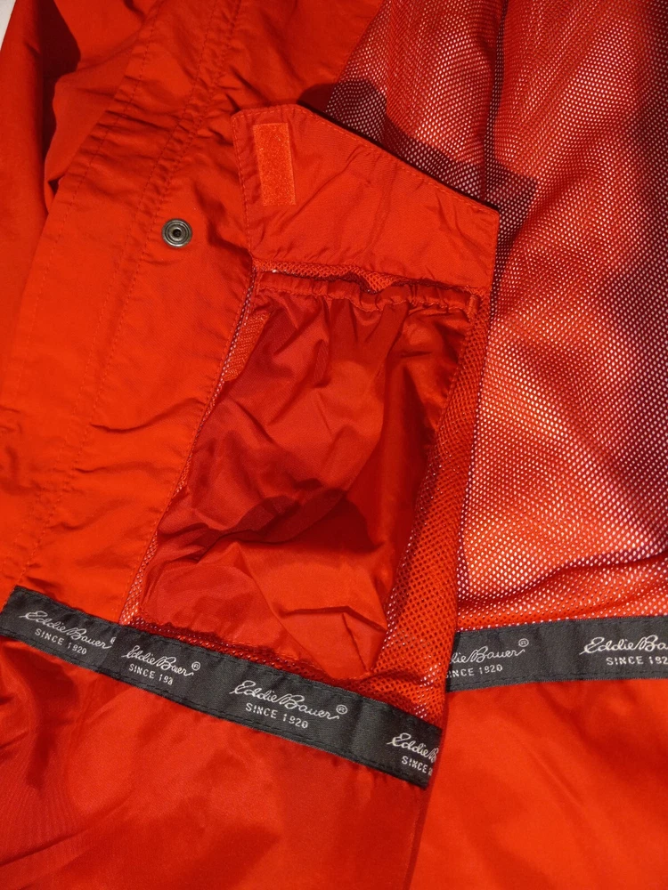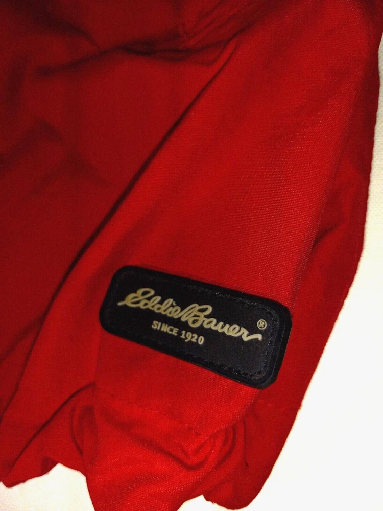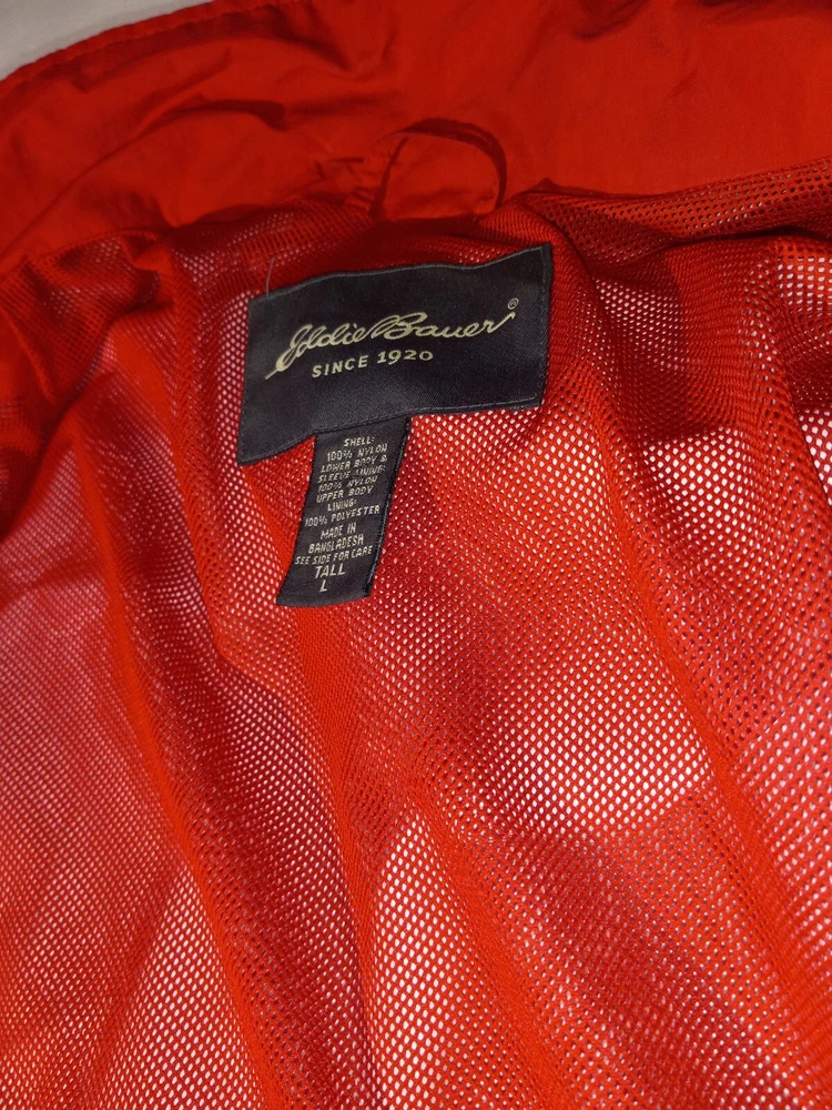 This Eddie Bauer jacket is the perfect addition to any wardrobe. With a solid red color and a designer outdoor theme, it's sure to make a statement. The jacket features a full zip closure and a hood for added protection, along with zipped pockets for storage. The relaxed fit and breathable lining make it comfortable to wear during the summer and spring seasons, and it's suitable for both travel and casual occasions. The jacket is made of nylon with a polyester lining, and it's available in size L for big and tall men. The logo accents add a touch of style to the jacket, making it a versatile piece that can be dressed up or down. (B1-1)