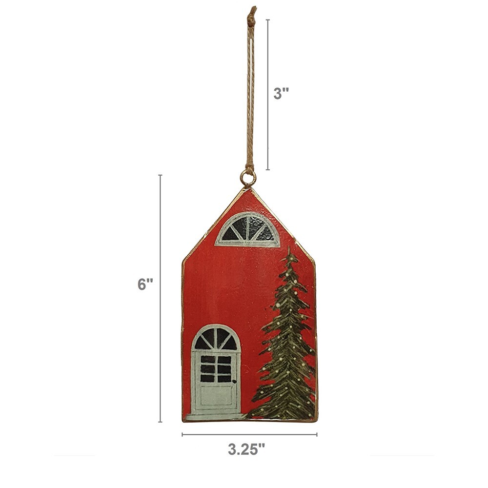 Pattern: House Type: Ornament Theme: Seasonal Features: Hanging Department: Adults Personalize: No Occasion: Christmas Color: Red Brand: Seasonal Abode Set Includes: Ornament Shape: House Material: Metal Number of Items: 1 Item Height: 6 in