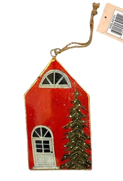 New with tags Seasonal Abode classic Christmas metal rustic decor ornament. Red shaped house featuring gold trim a Christmas tree and front door is perfect for personalizing. Pattern continues on both sides. 6" long 734151-159 Bin 2 722196-722197