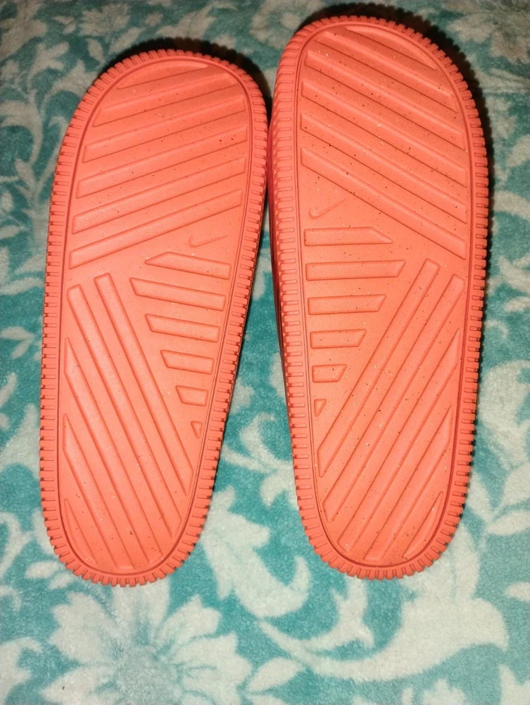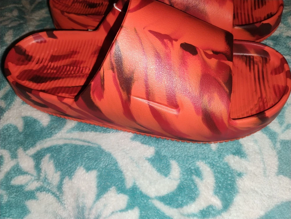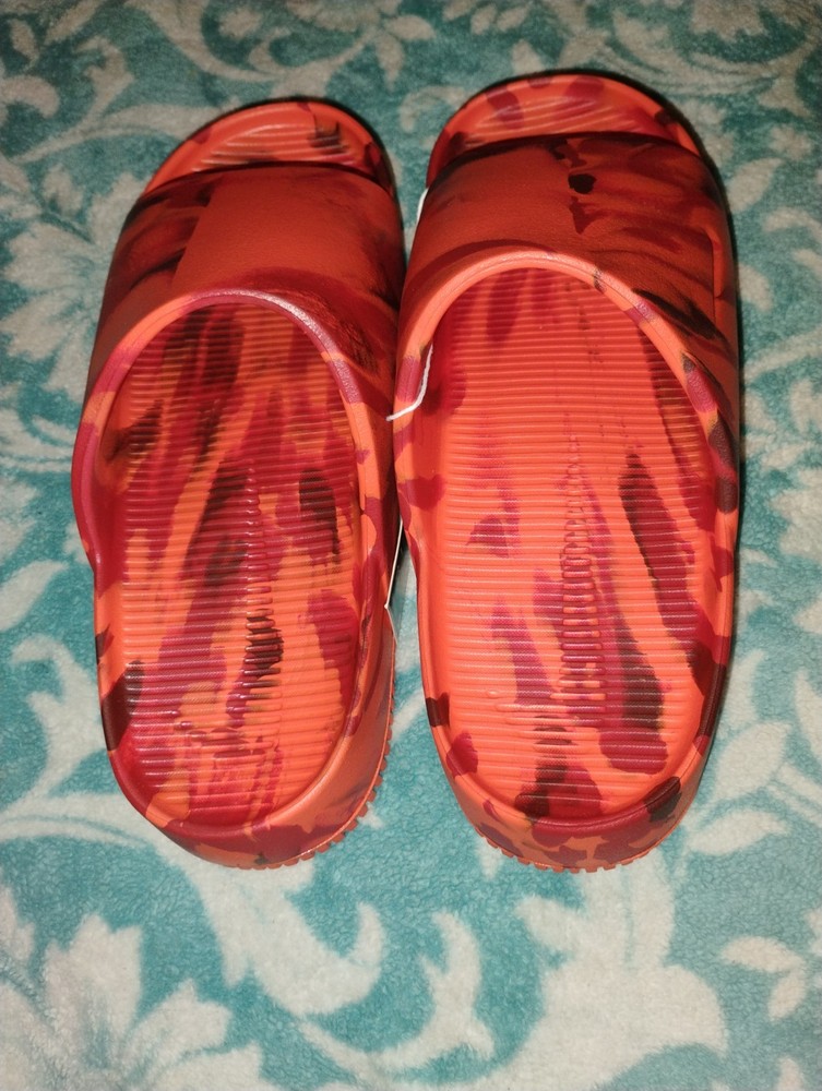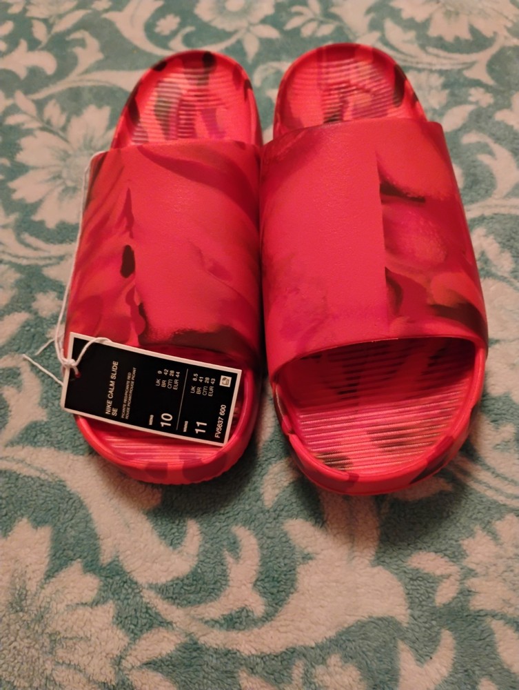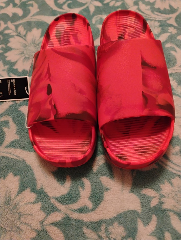Red Nike slides for men in size 10. The iconic Nike brand ensures quality and style, making these slides a great addition to any man's shoe collection.