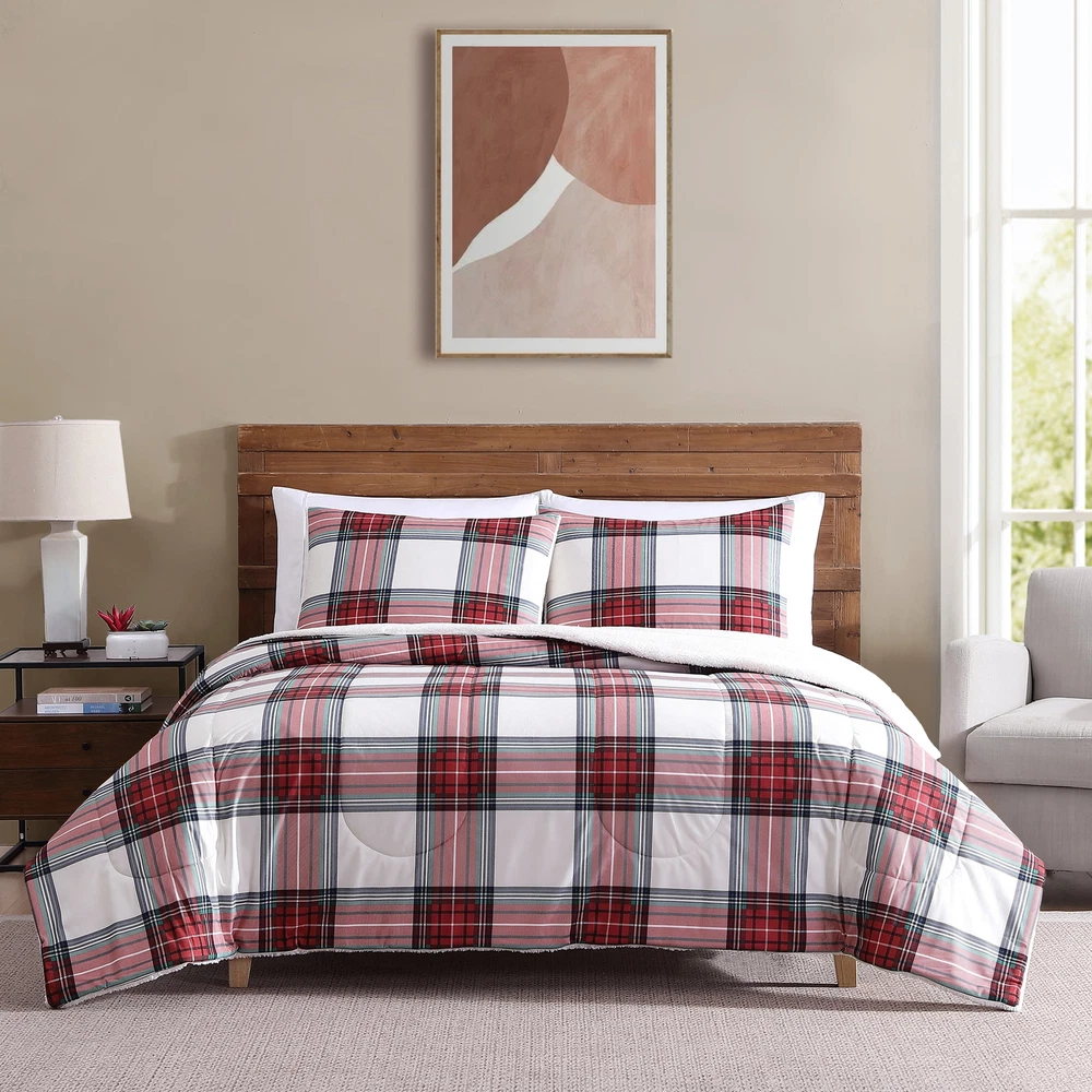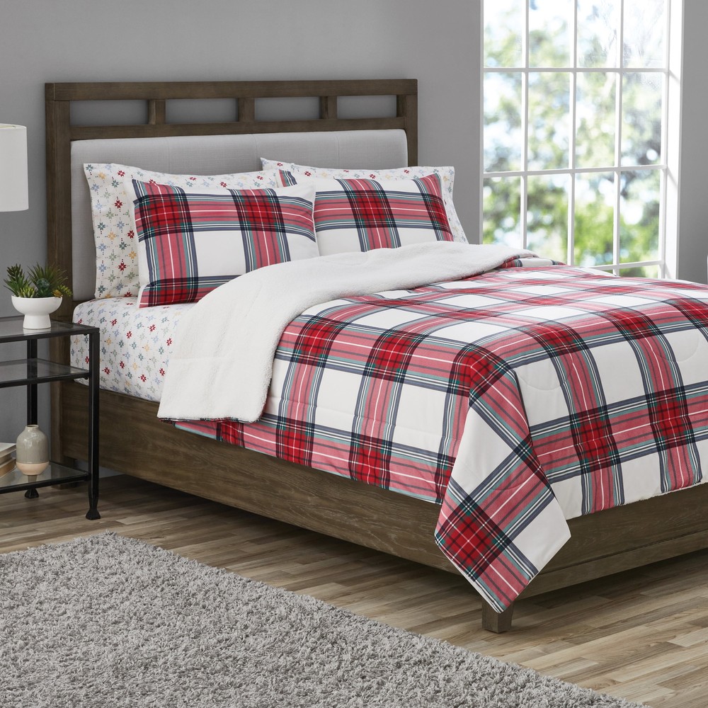 Get cozy with Mainstays 3-piece Adult Flannel Reverse to Sherpa Adult Comforter Set. This set includes a polyester flannel comforter with coordinating shams that reverse to a sherpa finish on the other side. The Sherpa reverse adds additional softness and warmth to your comforter, perfect for those cooler nights. This set is durable and machine washable, making it long lasting and easy to care for. Choose from a variety of prints and sizes to complete any bedroom in your home! • Mainstays Reversible 3-piece Adult Flannel/Sherpa Comforter Set • Includes 1 Full/Queen Reversible Comforter • 86x90” and 2 coordinating Shams: 20X26” • Super soft Flannel fabric with Sherpa reverse. • Cozy & warm for comfort and relaxation. • Made with durable 100% polyester fibers. • Heat transfer heat design with double diamond quilting pattern. • Easy care, machine washable. • Available in Stores and online.