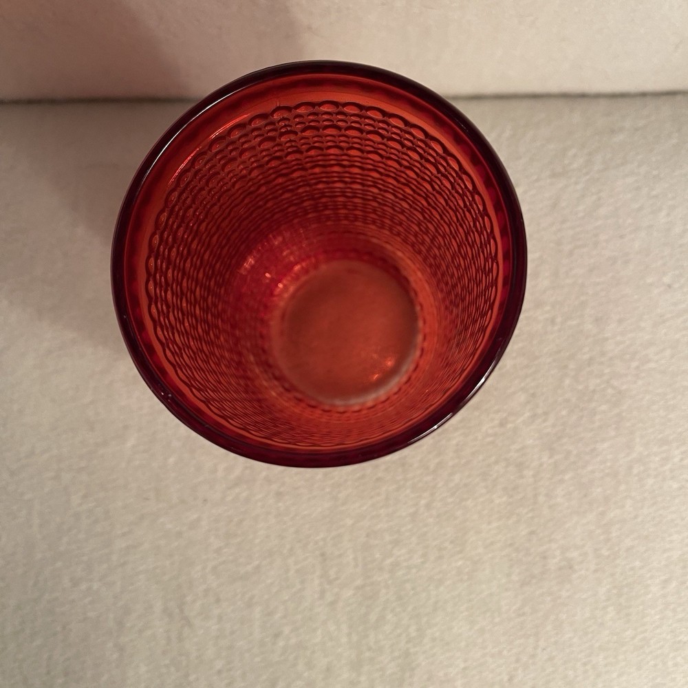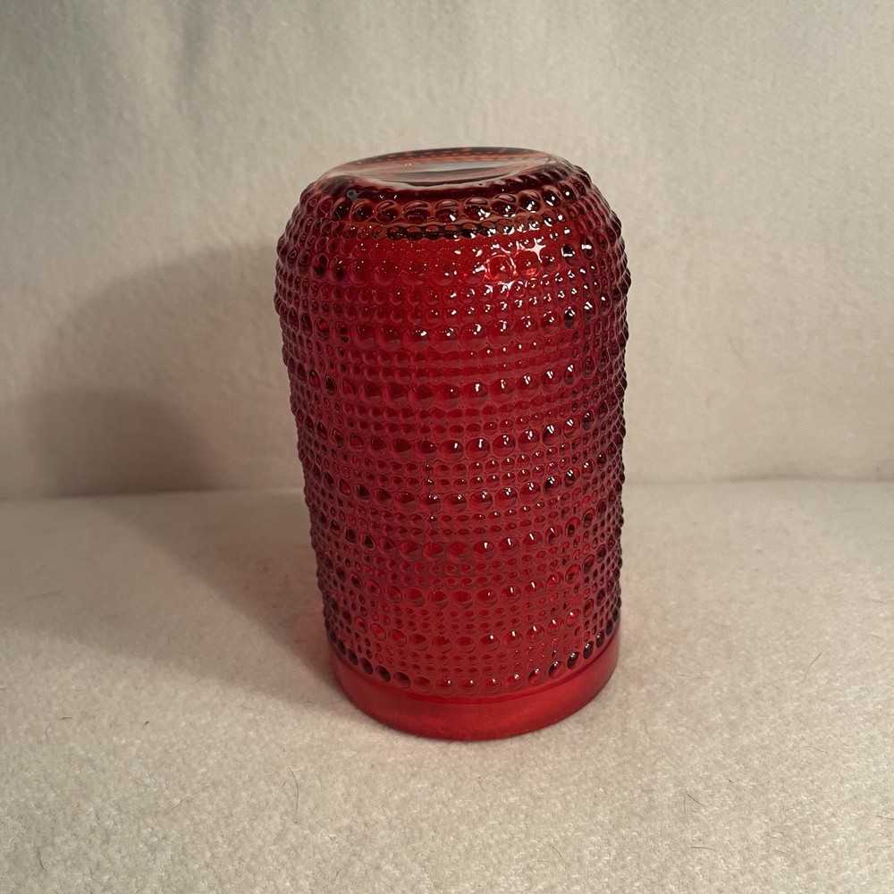 Elevate your home decor with the striking Red Textured Hobnail Glass Votive Holder. Exuding a sense of Art Deco elegance, this round candle holder features an all-over intricate pattern that catches the light beautifully, creating a mesmerizing effect on any surface. The rich red hue adds a pop of color to your space, making it a versatile piece that can complement various room themes. Crafted from high-quality glass, this original piece is designed to suit mini candles, providing a cozy and intimate ambiance. Measuring 5 inches in height and 3 inches in width, it's the perfect size for a subtle yet impactful statement. The item weighs 14.1 ounces, ensuring it's a sturdy and durable addition to your decorative collectibles. Excellent condition. No chips or cracks.