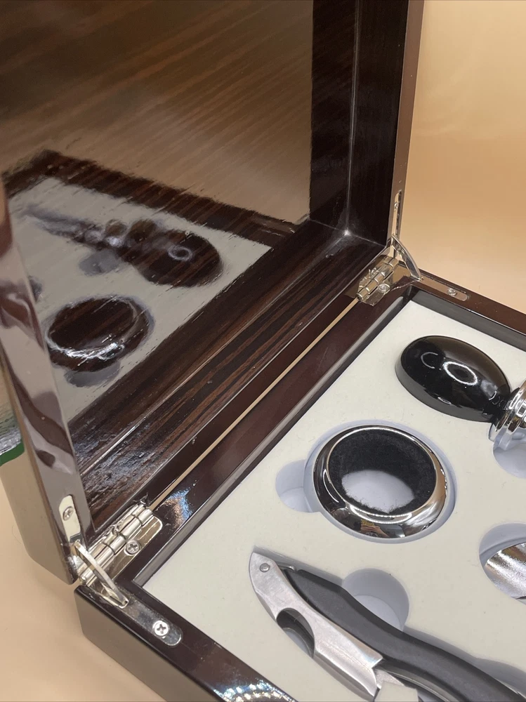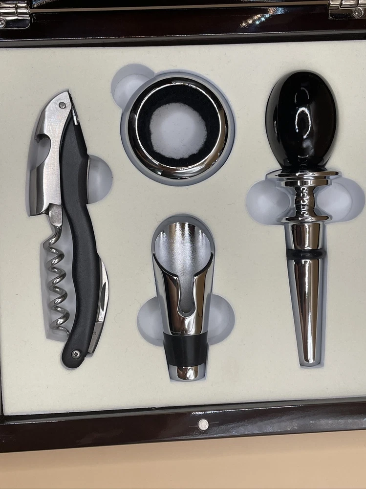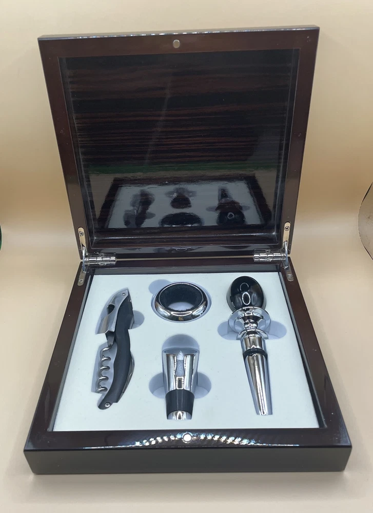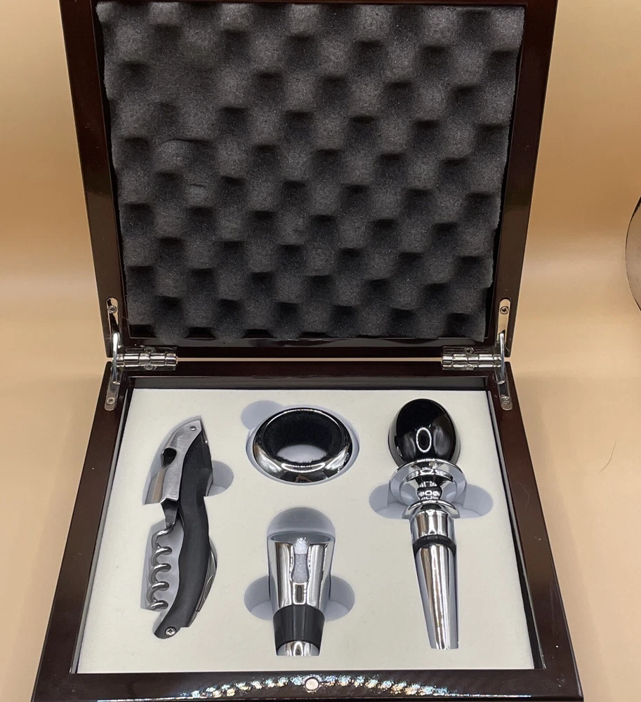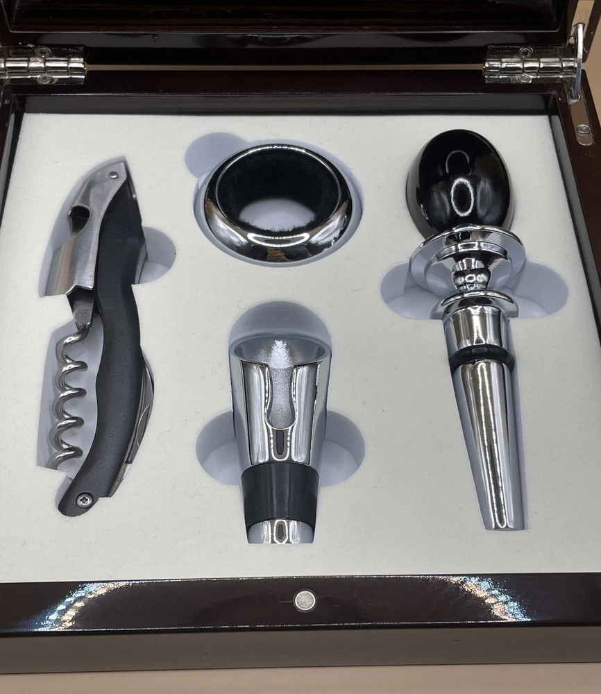 Elevate your wine collection with this Red Vanilla Bar 4-Piece Wine Accessory Set. Crafted from high-quality laquered wood with a mahogany finish, this set includes all the necessary wine tools for any occasion. The set comes in a beautiful box, making it a perfect gift for any wine lover. The set includes a wine stopper, wine pourer, corkscrew, and drip ring, all designed to make your wine experience more enjoyable. Whether for a special occasion or a casual night in, this wine accessory set will impress. Add a touch of elegance to your bar with this stunning set.
